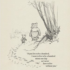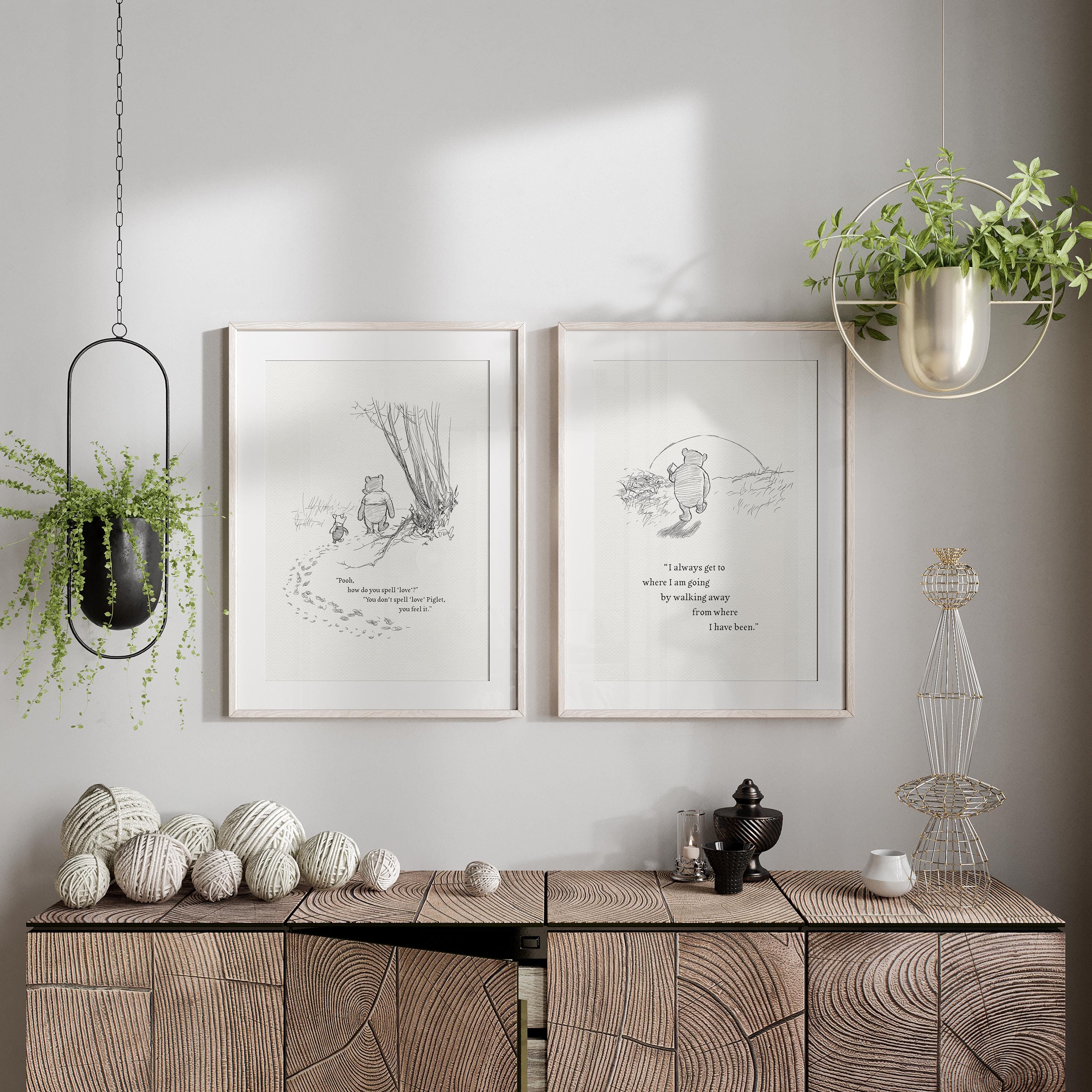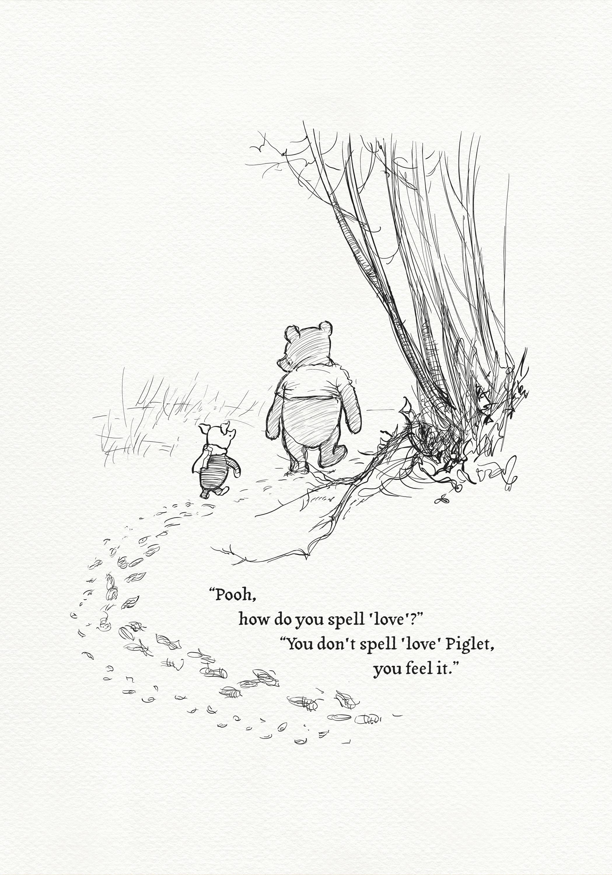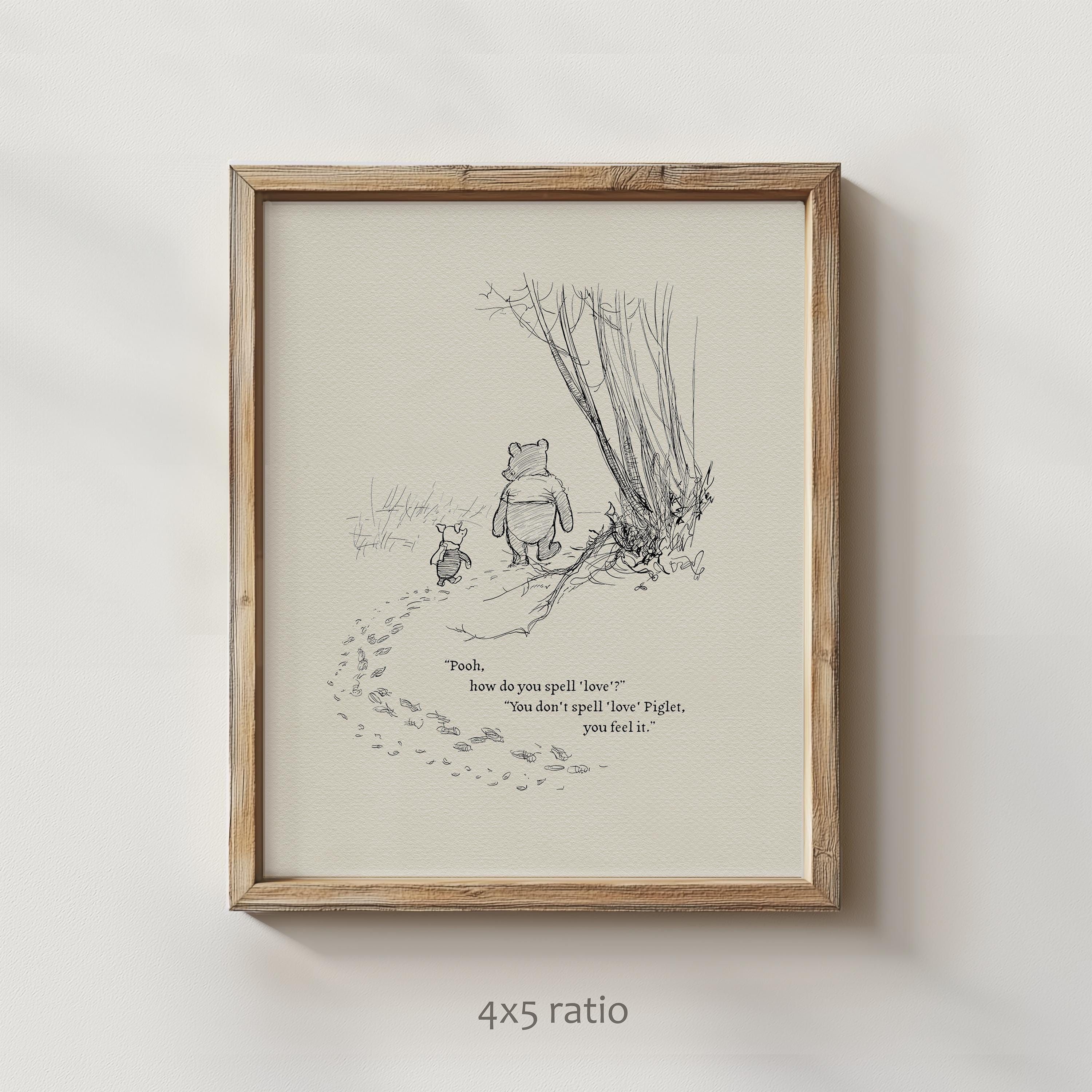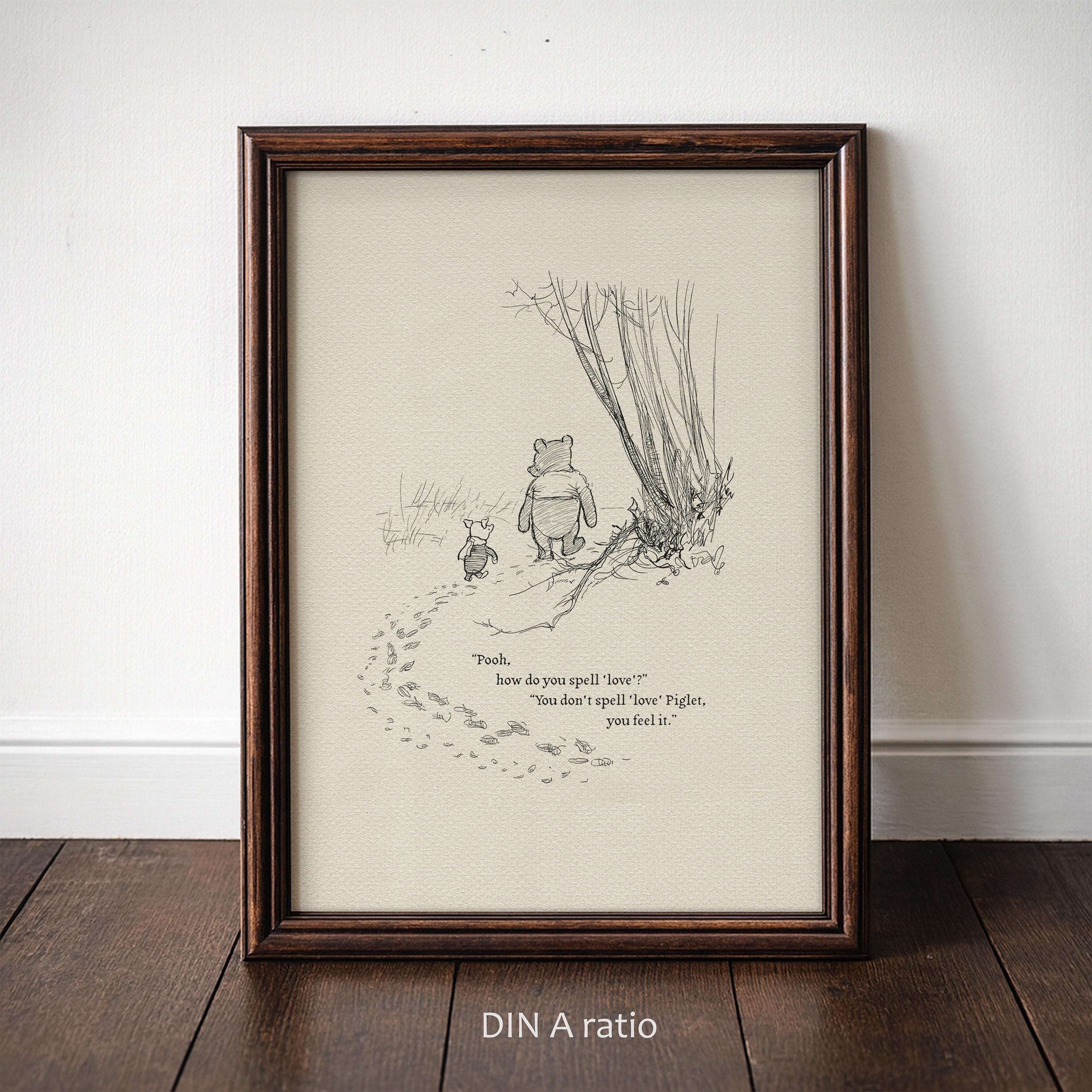 Step back in time to the beloved world of Winnie the Pooh with this meticulously crafted vintage-style black-and-white graphic featuring two inseparable friends walking arm in arm through the wintery Hundred Acre Wood—a timeless scene “in which Pooh and Piglet go hunting and nearly catch a Woozle.” Enriched with a poignant quote — “Pooh, how do you spell ‘love’?” “You don't spell love, Piglet, you feel it” — this print not only captures this famous scene, but also celebrates the enduring power of love and friendship.