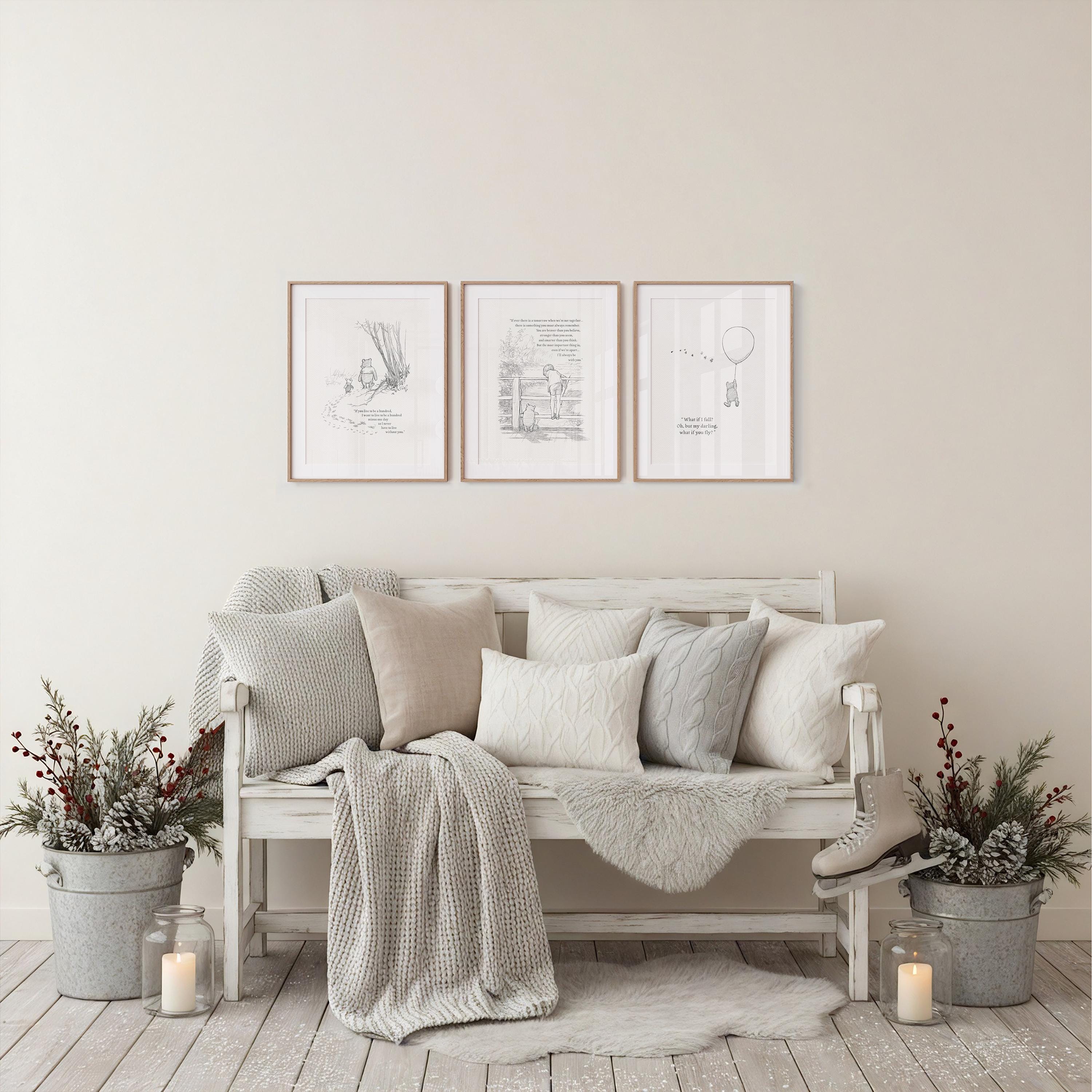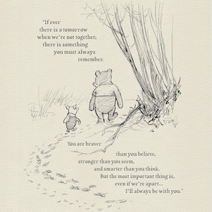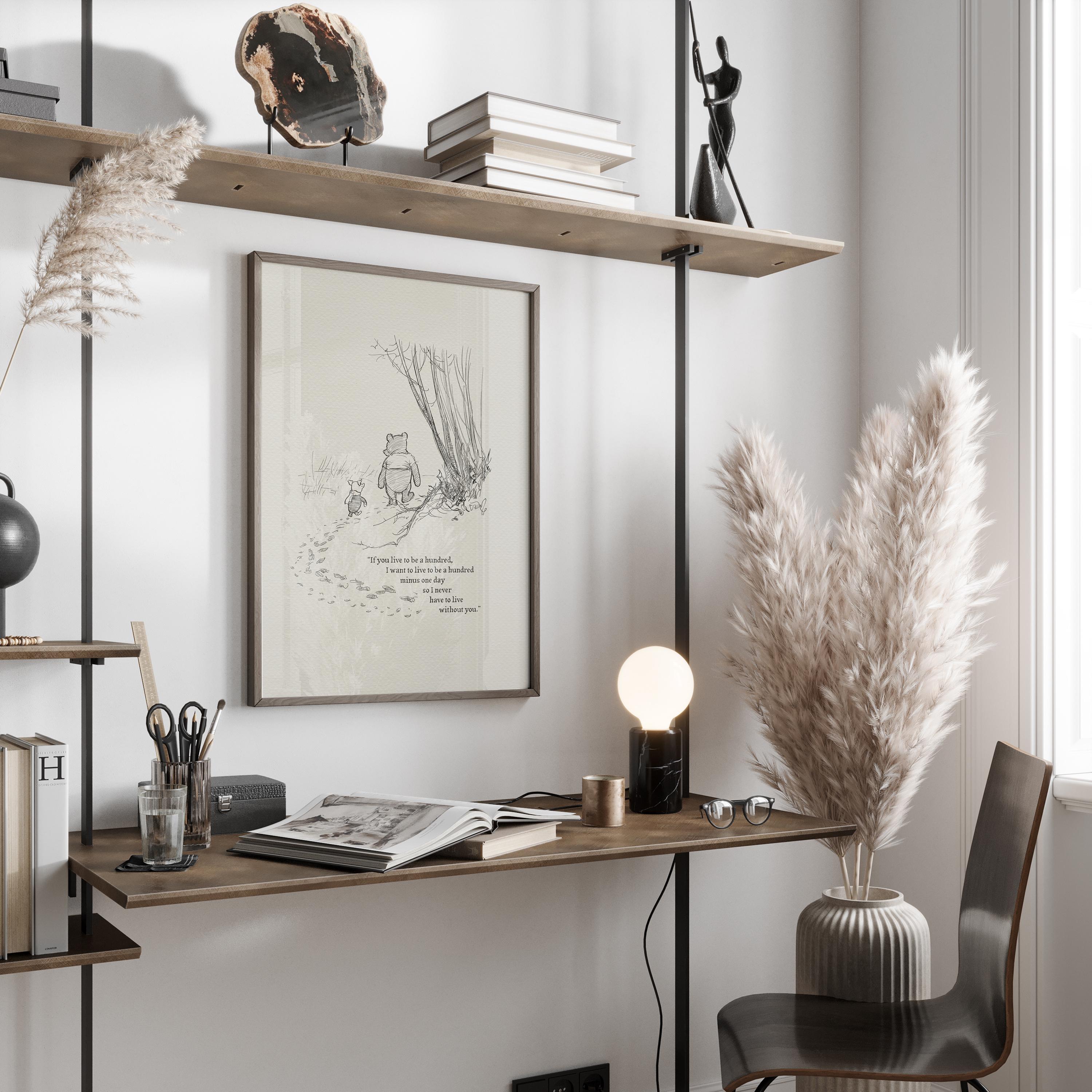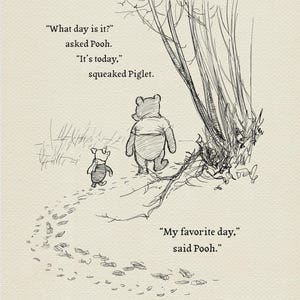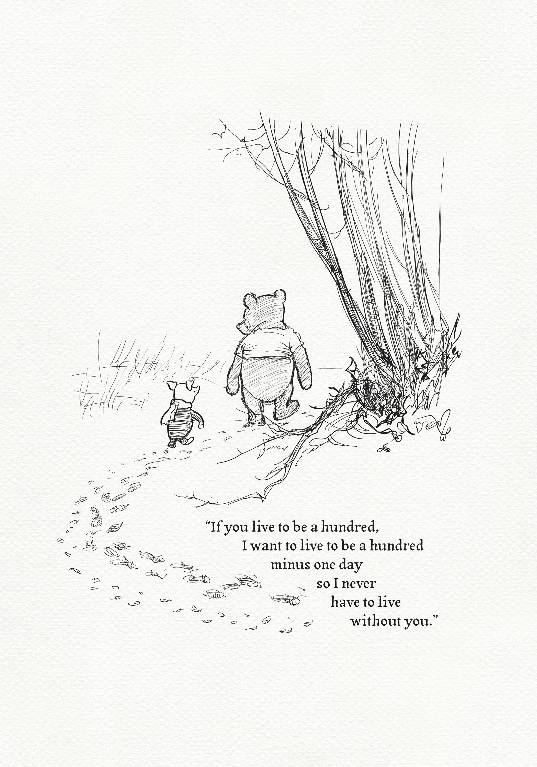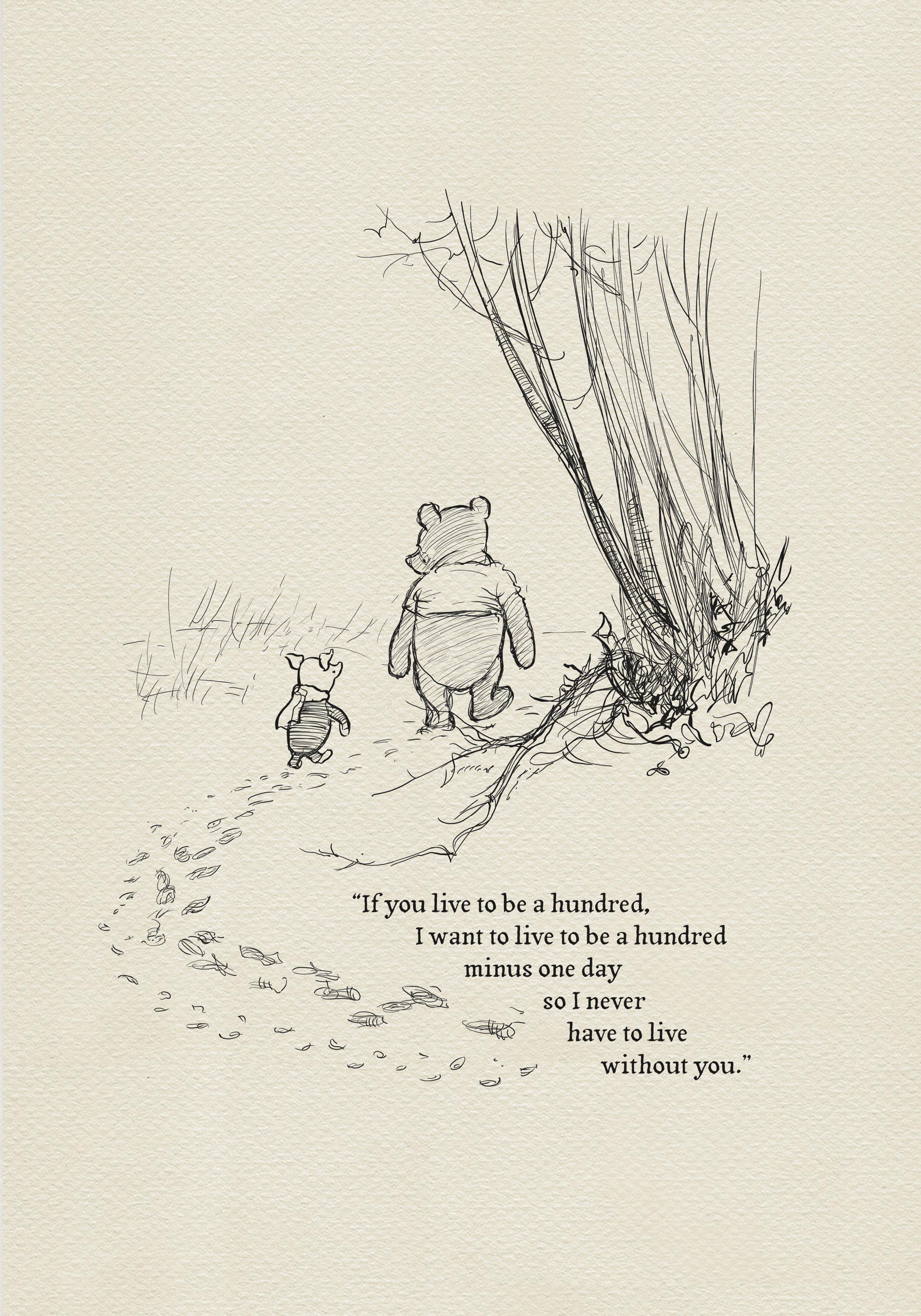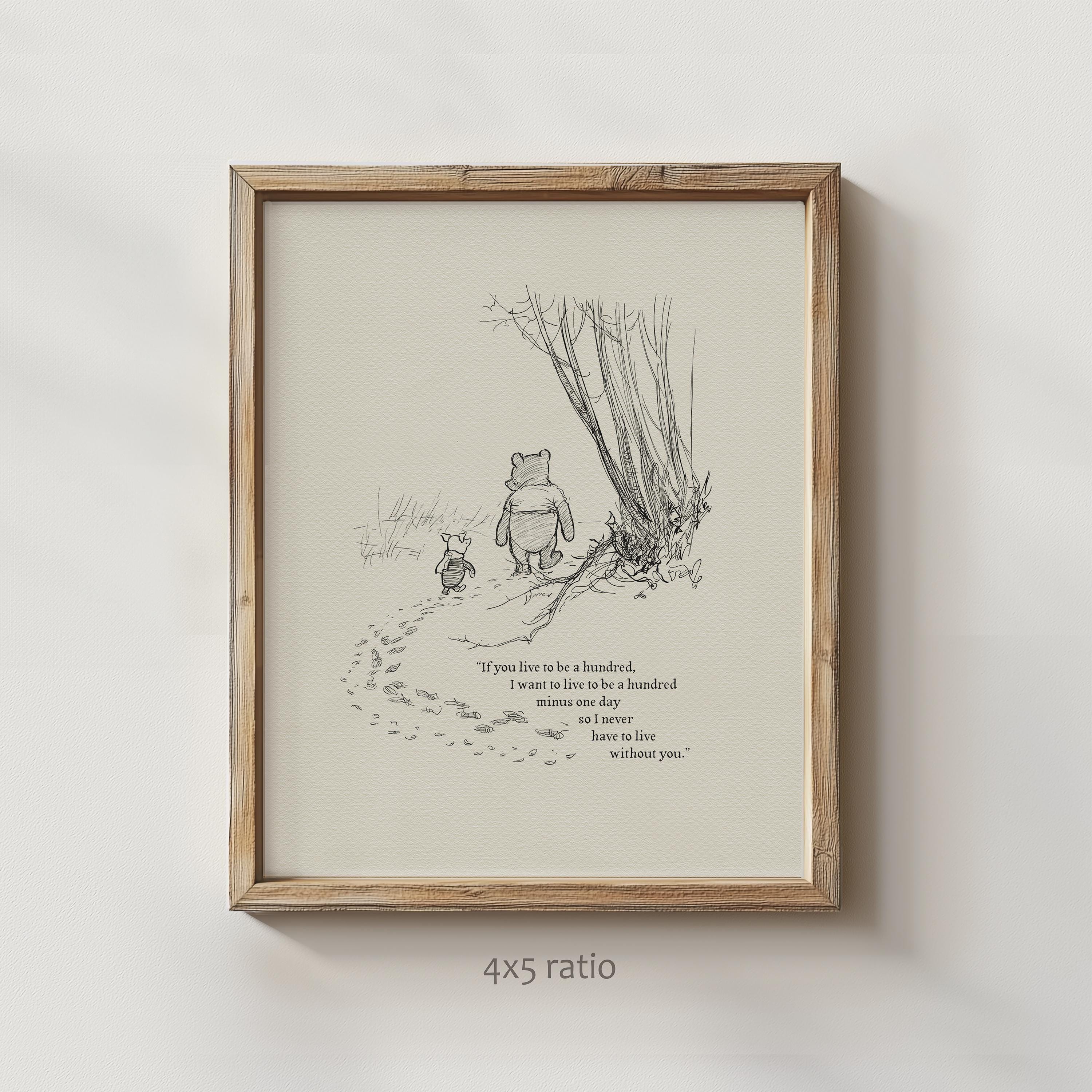 Step back in time to the beloved world of Winnie the Pooh with this meticulously crafted vintage-style black-and-white graphic featuring two inseparable friends walking arm in arm through the wintery Hundred Acre Wood—a timeless scene “in which Pooh and Piglet go hunting and nearly catch a Woozle.” An added heartfelt quote—"If you live to be a hundred, I want to live to be a hundred minus one day so I never have to live without you"—enhances the sentimental appeal of this piece, making it a perfect gift or keepsake for Pooh fans and sentimental souls alike.