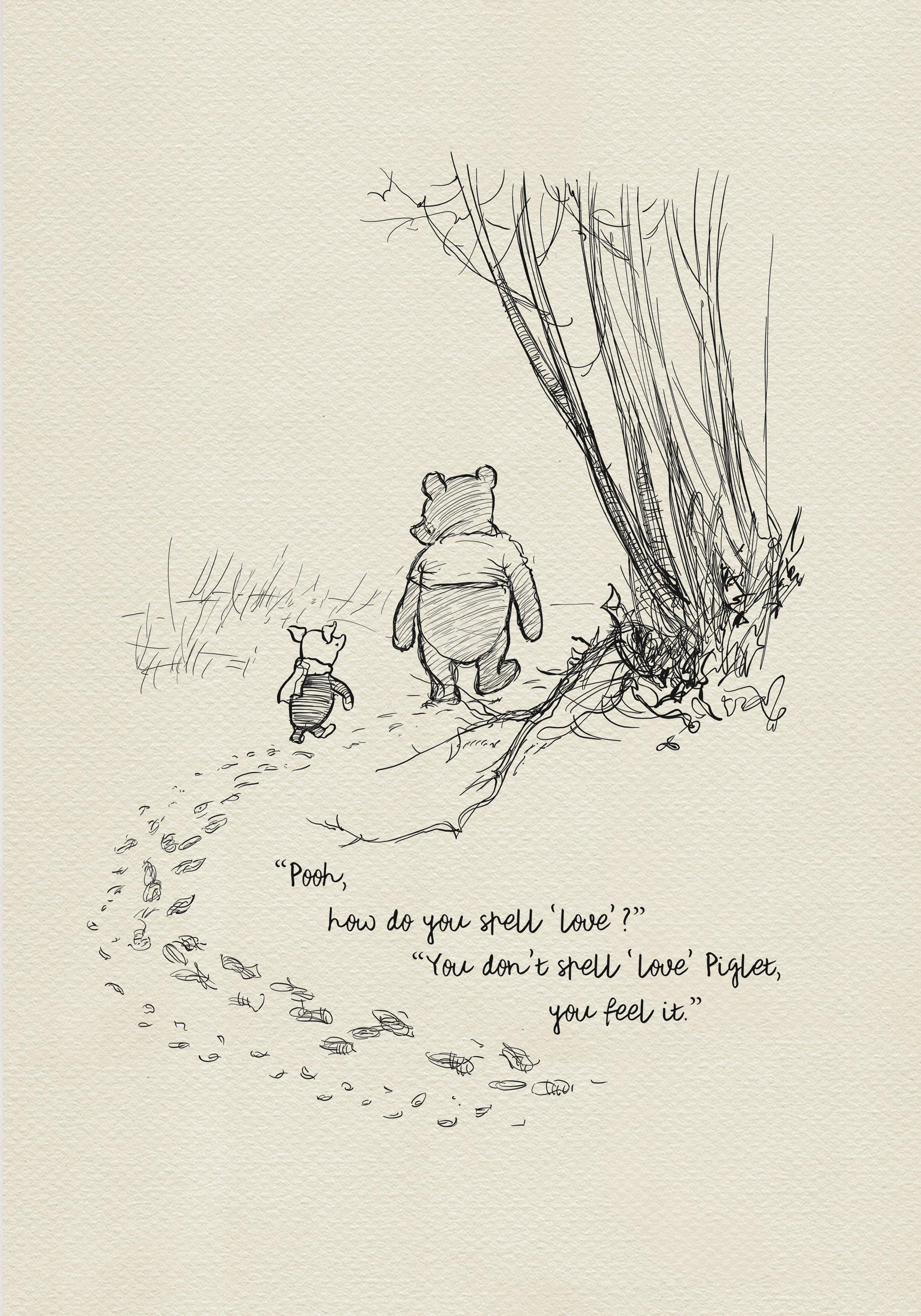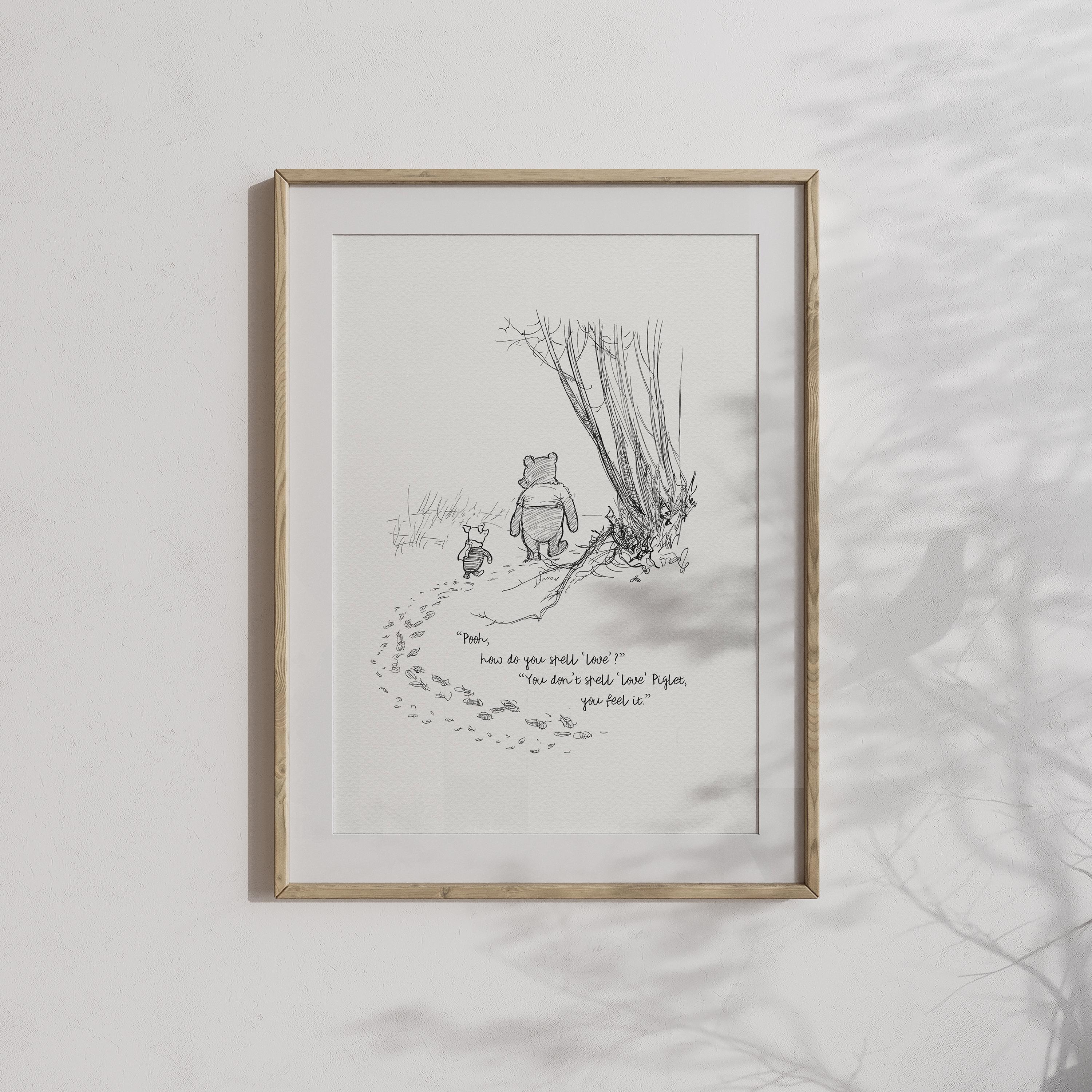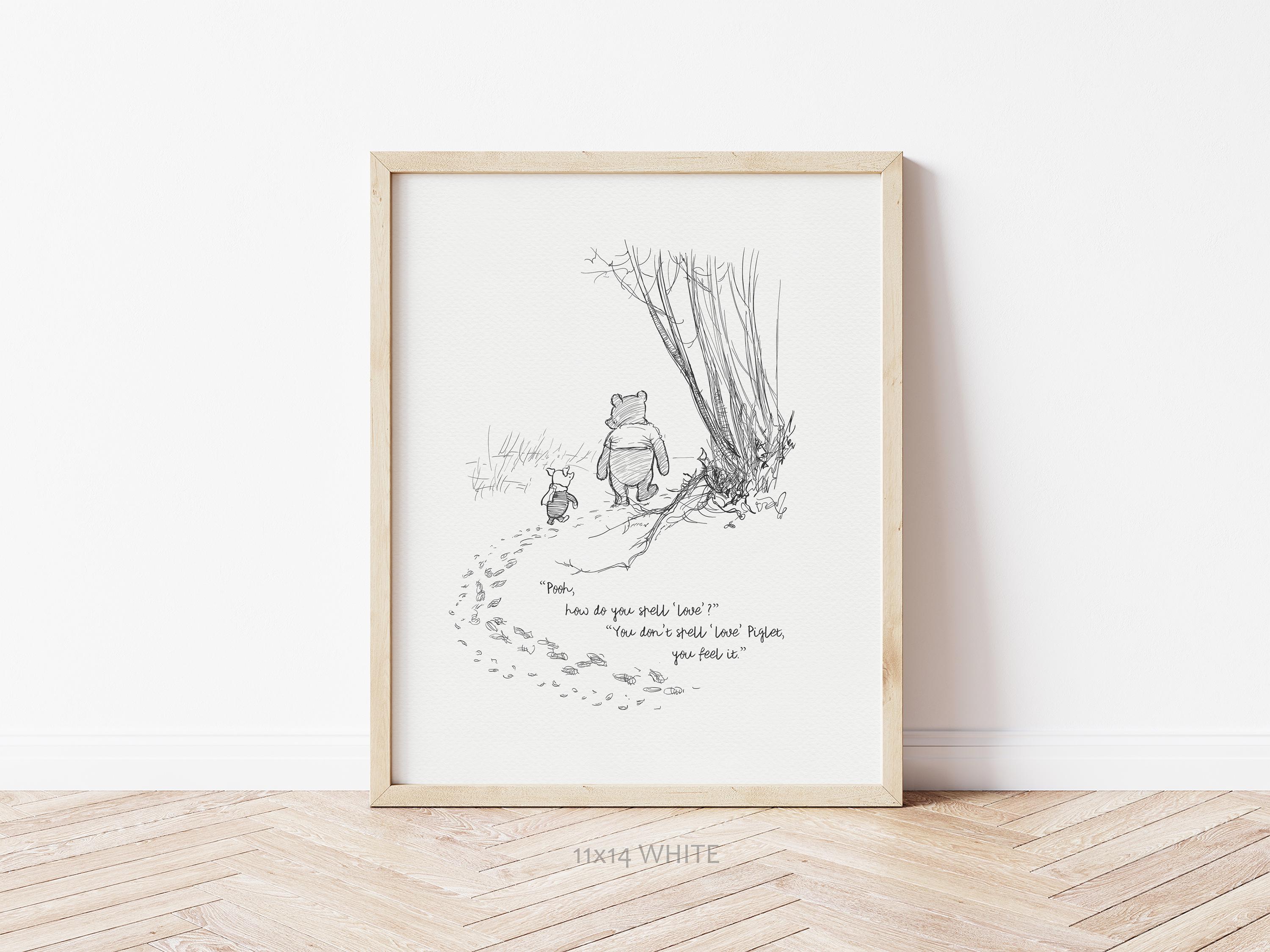 Step back in time to the beloved world of Winnie the Pooh with this meticulously crafted vintage-style black-and-white graphic featuring two inseparable friends walking arm in arm through the wintery Hundred Acre Wood—a timeless scene “in which Pooh and Piglet go hunting and nearly catch a Woozle.” Enriched with a poignant quote — “Pooh, how do you spell ‘love’?” “You don't spell love, Piglet, you feel it” — this print not only captures this famous scene, but also celebrates the enduring power of love and friendship.
