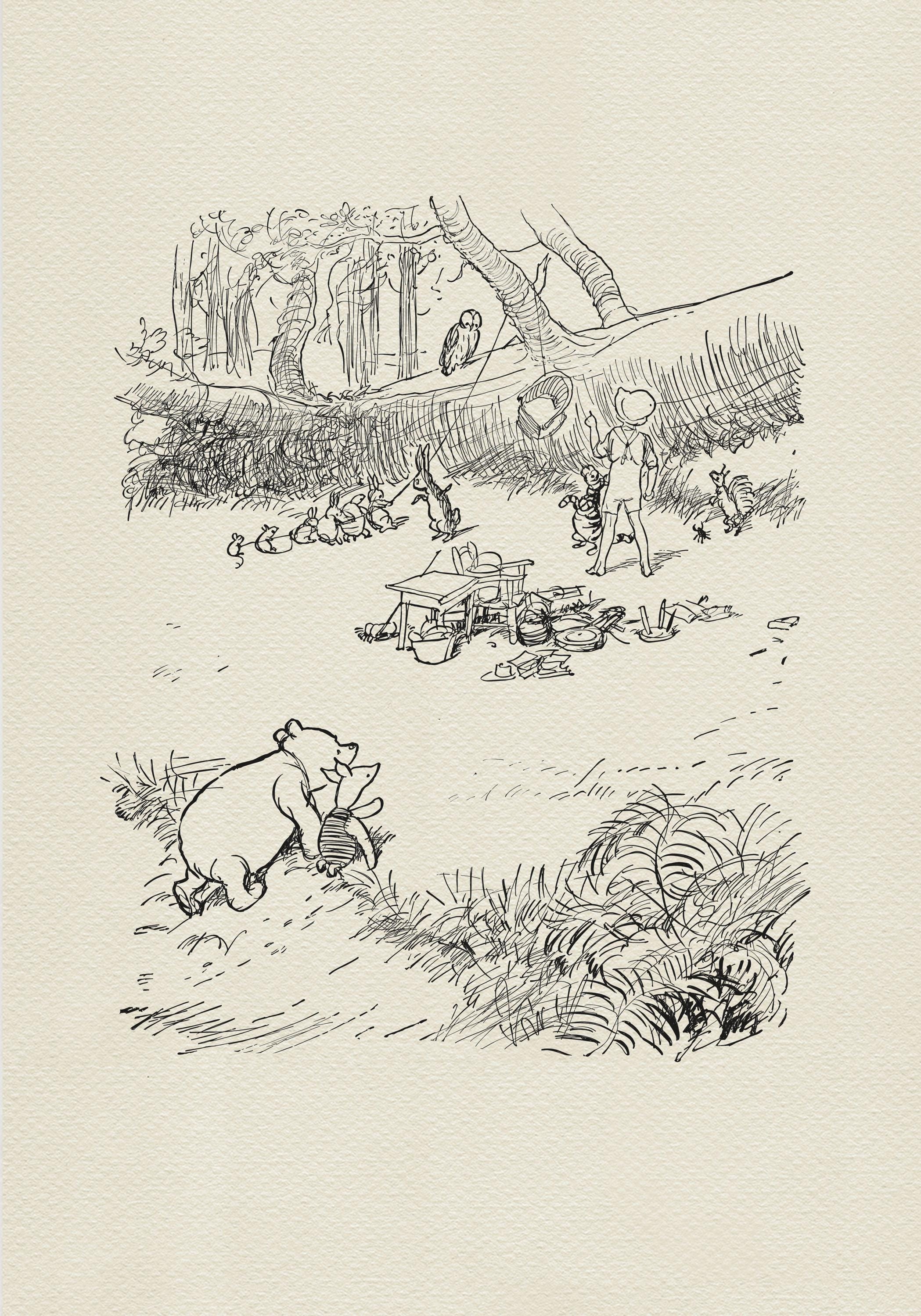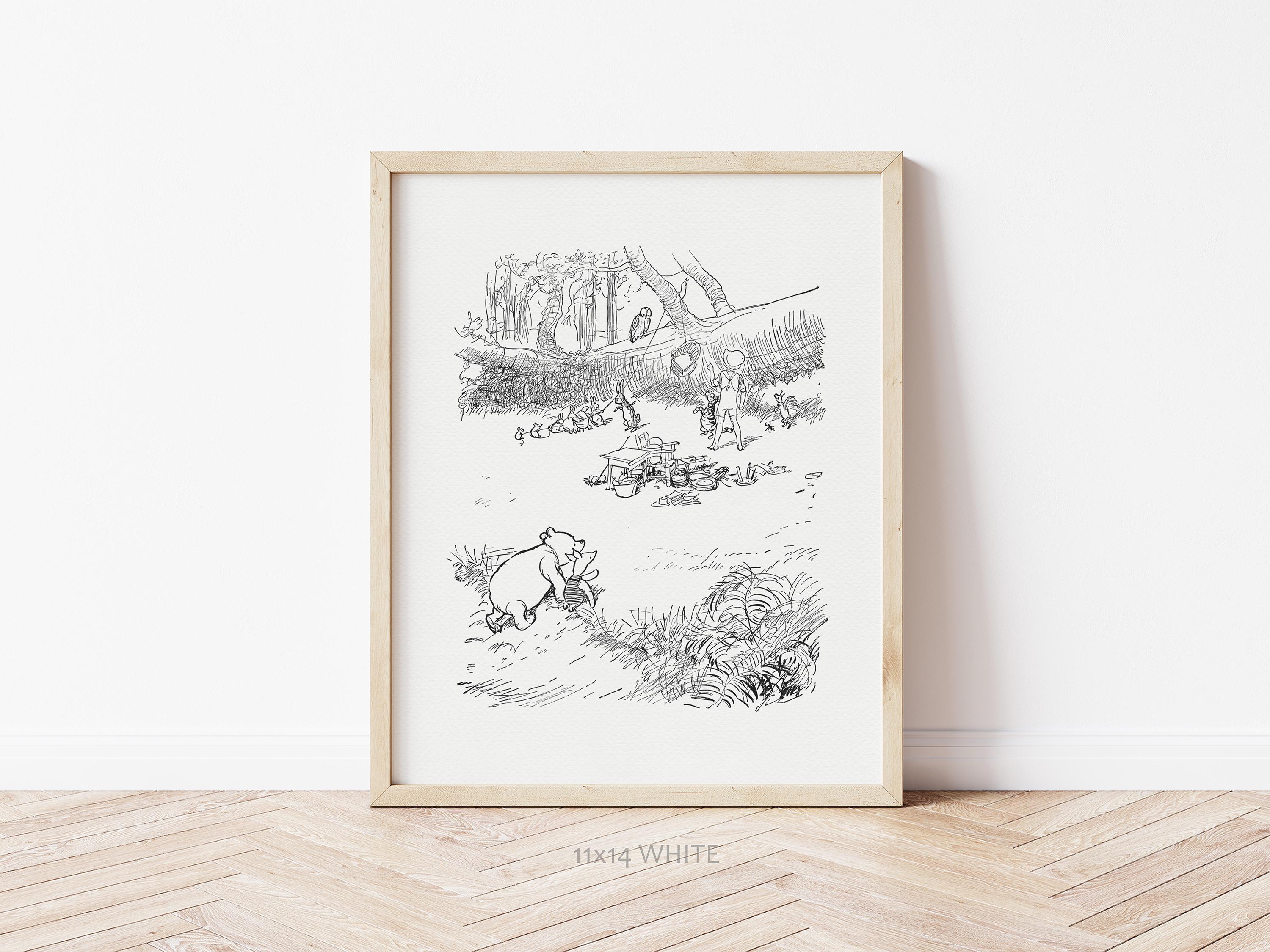Step back in time to the beloved world of Winnie the Pooh with this meticulously crafted vintage-style black-and-white graphic depicting the scene "in which Eeyore finds the Wolery and Owl moves into it"—a timeless scene from A.A. Milne's classic stories. This print is a precisely crafted adaptation of E.H. Shepard's book illustration, redrawn by hand to preserve every delicate detail and nuance, ensuring an authentic and nostalgic feel that will bring back fond memories for children and adults alike.
