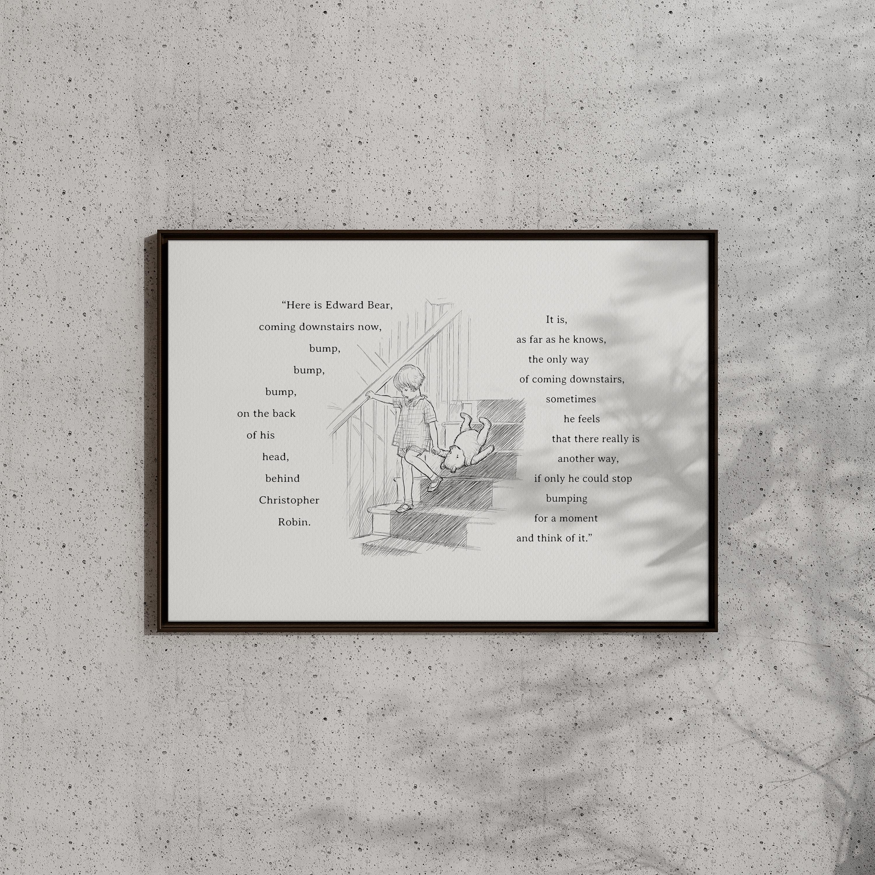 Step back in time to the beloved world of Winnie the Pooh with this meticulously crafted vintage-style black-and-white graphic depicting Edward Bear and Christopher Robin descending a staircase—a timeless scene that begins the story of the inhabitants of the Hundred Acre Wood. The illustration is enhanced by the touching quote: "Here is Edward Bear, coming downstairs now, bump, bump, bump, on the back of his head, behind Christopher Robin," making it an inspiring and cozy addition to your little one’s space.