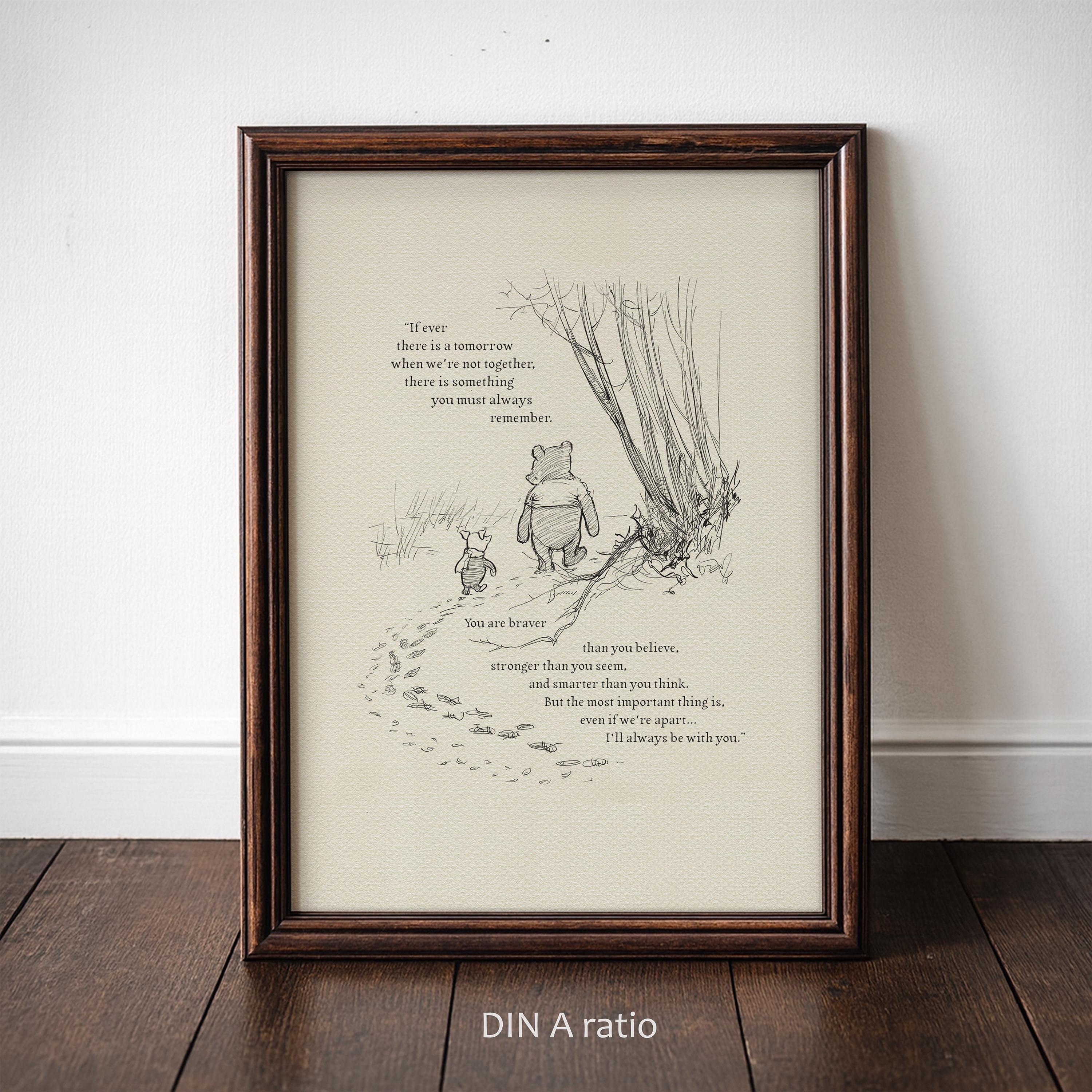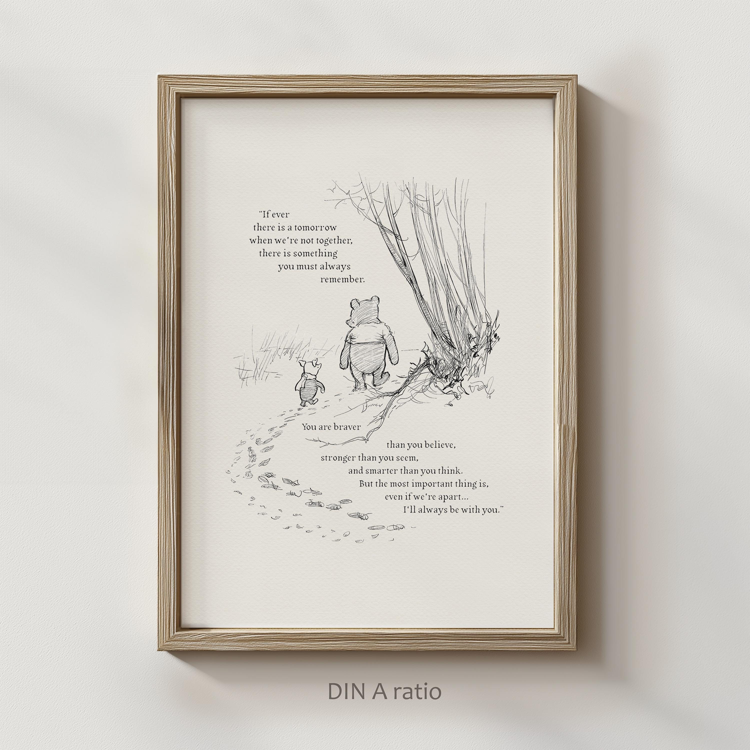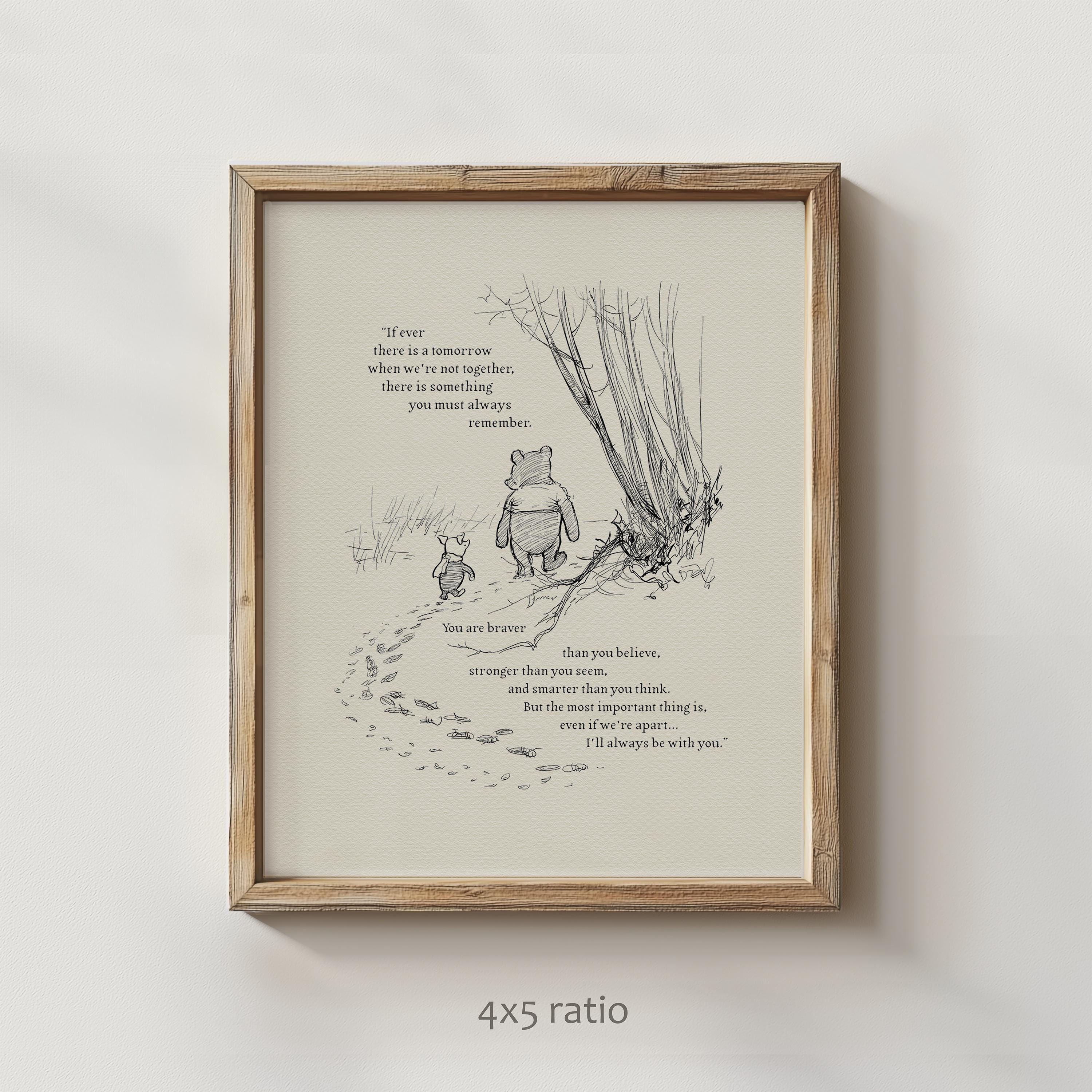 Step back in time to the beloved world of Winnie the Pooh with this meticulously crafted vintage-style black-and-white graphic featuring two inseparable friends walking arm in arm through the wintery Hundred Acre Wood—a timeless scene “in which Pooh and Piglet go hunting and nearly catch a Woozle.” The illustration is accompanied by an inspiring quote from Carter Crocker: "If there ever comes a tomorrow when we're not together... there's something you must always remember," reminding us of our inner strength and resilience.
