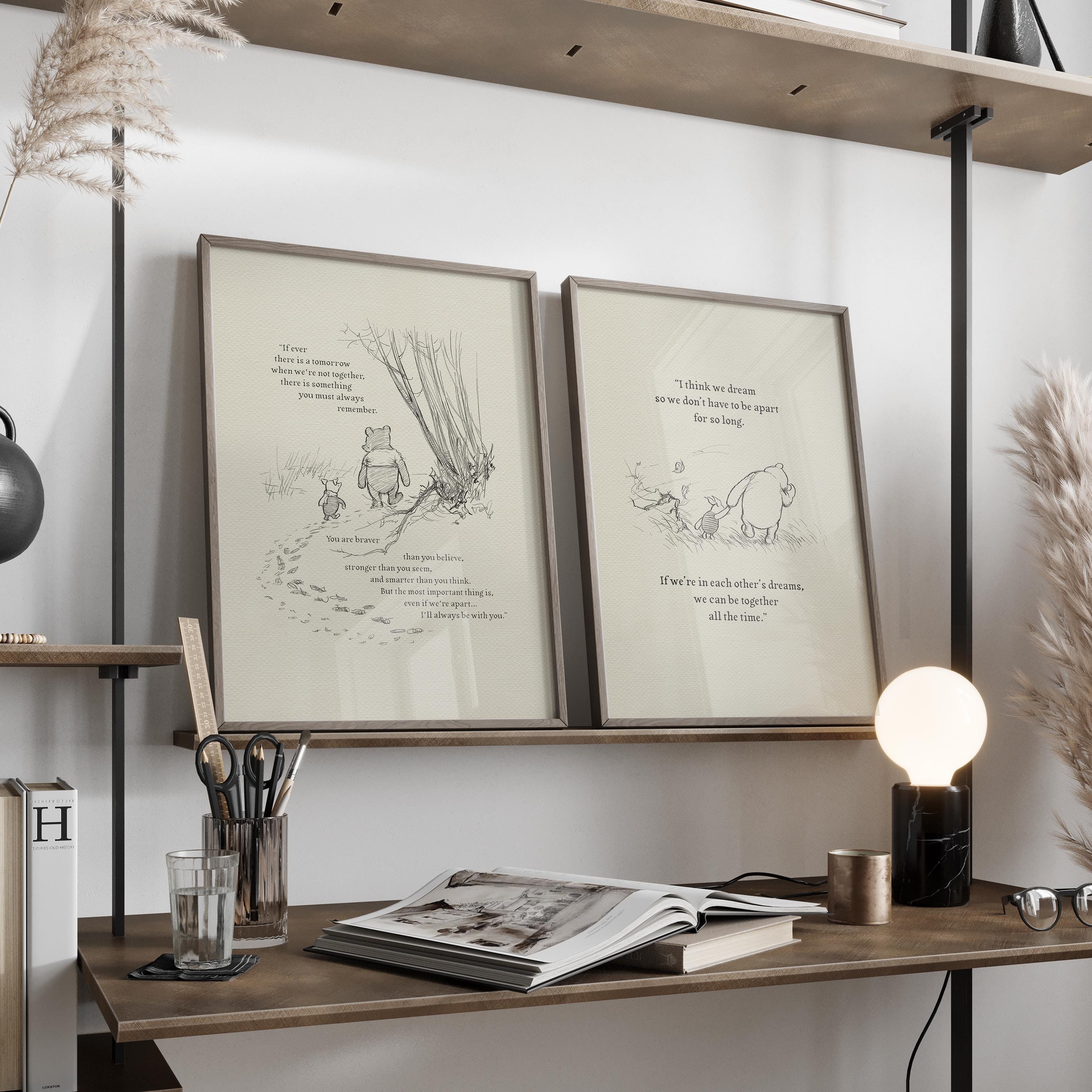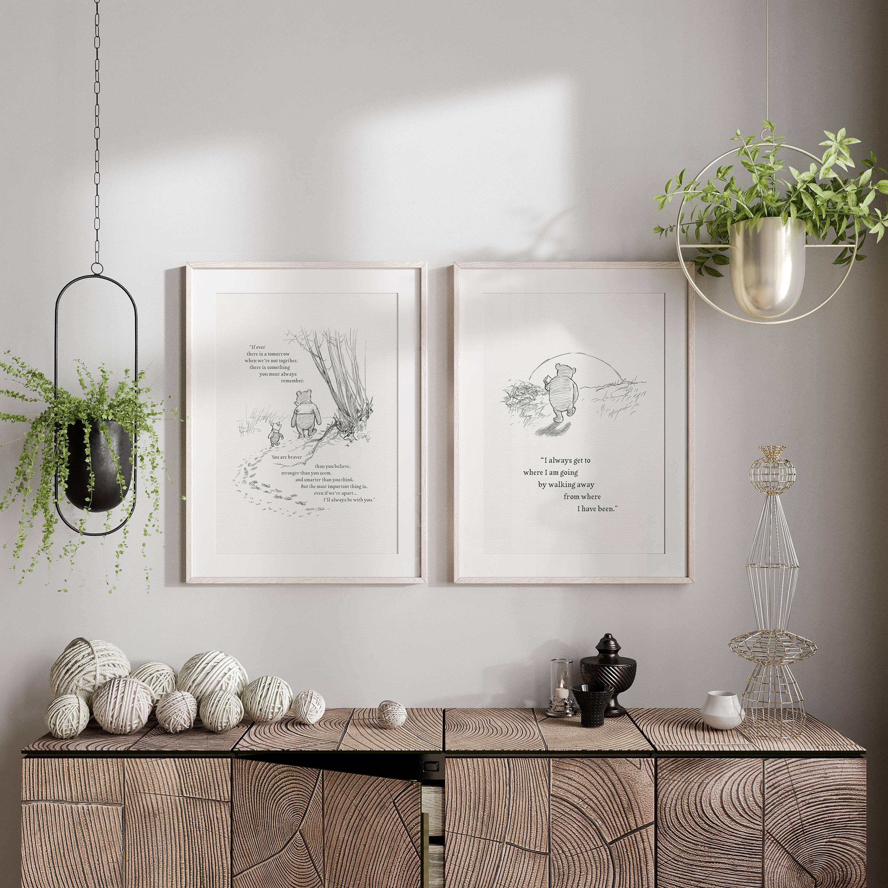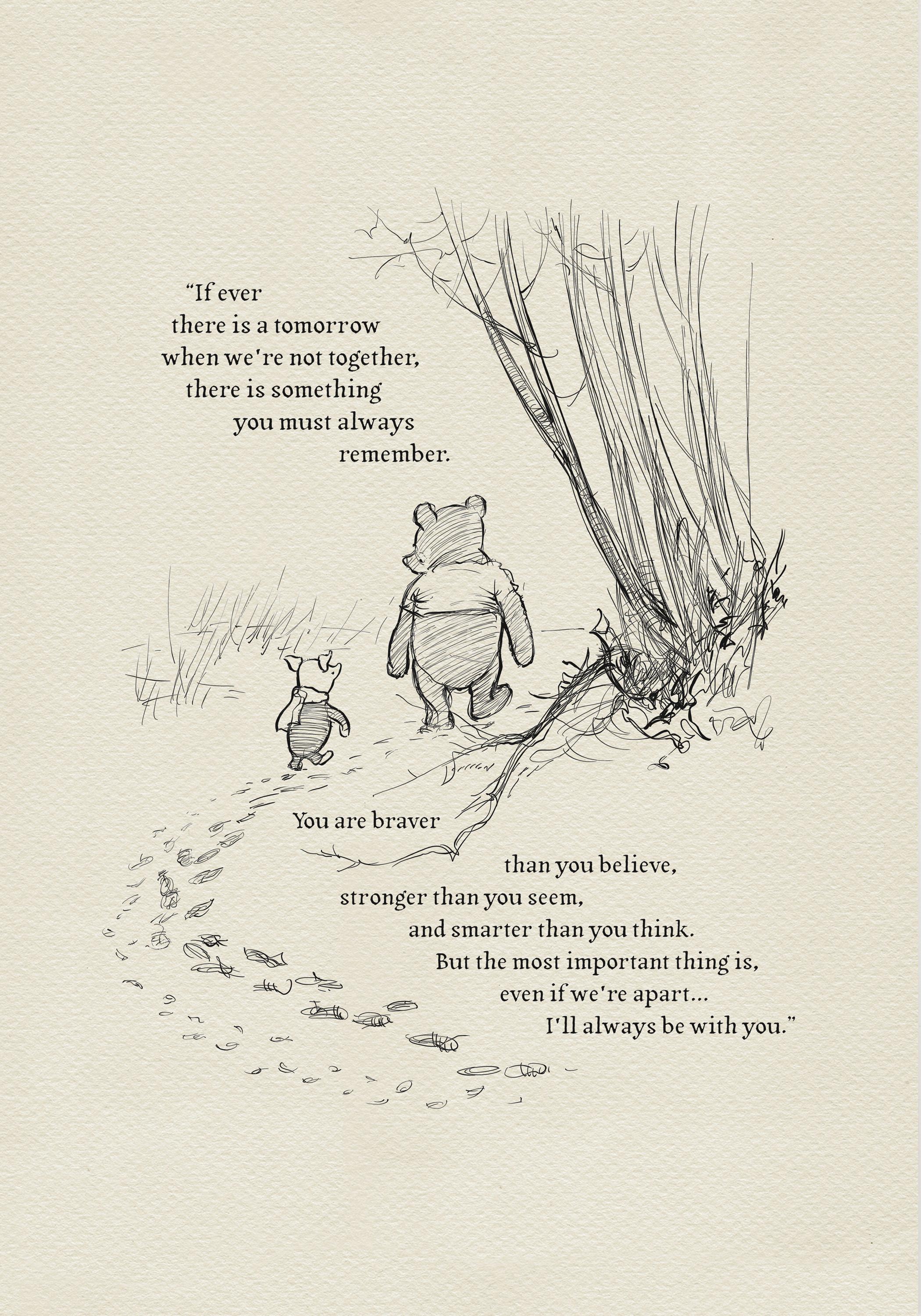 Step back in time to the beloved world of Winnie the Pooh with this meticulously crafted vintage-style black-and-white graphic featuring two inseparable friends walking arm in arm through the wintery Hundred Acre Wood—a timeless scene “in which Pooh and Piglet go hunting and nearly catch a Woozle.” The illustration is accompanied by an inspiring quote from Carter Crocker: "If there ever comes a tomorrow when we're not together... there's something you must always remember," reminding us of our inner strength and resilience.