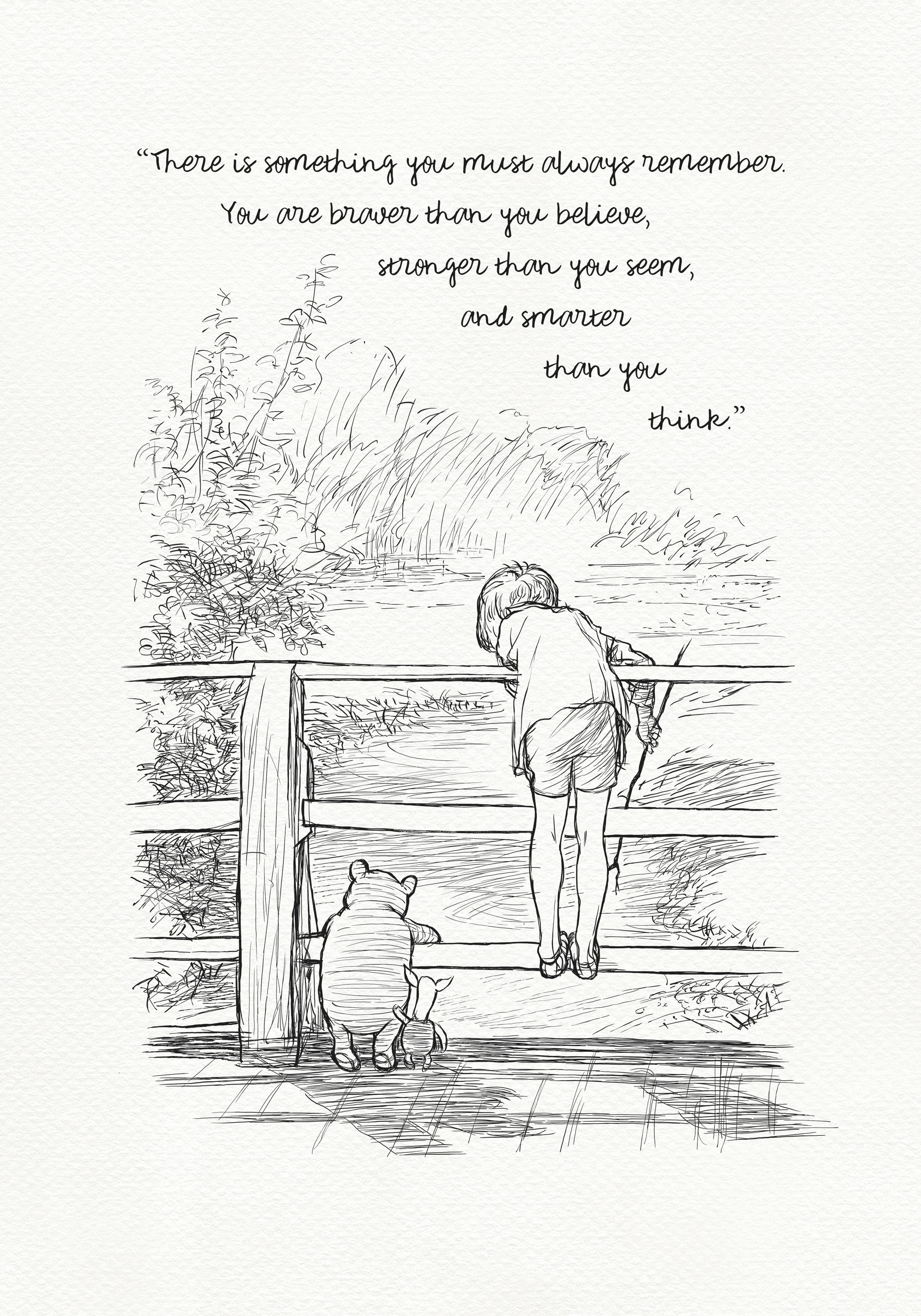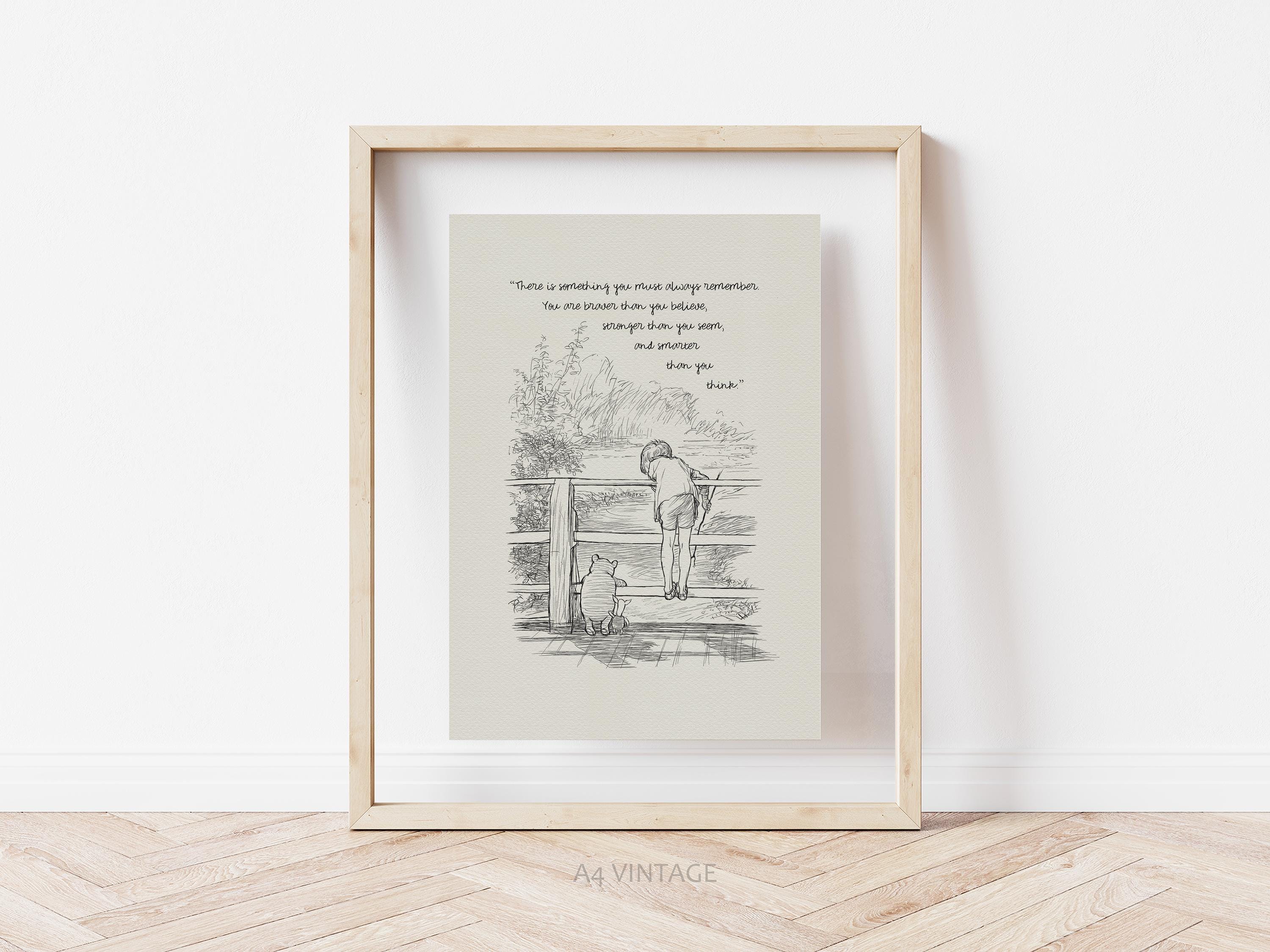 Step back in time to the beloved world of Winnie the Pooh with this meticulously crafted vintage-style black-and-white graphic featuring Winnie the Pooh, Christopher Robin, and Piglet on a bridge playing Poohsticks—a timeless scene from A.A. Milne's classic stories. The illustration is accompanied by an inspiring quote by Carter Crocker: “There is something you must always remember. You are braver than you believe, stronger than you seem, and smarter than you think,” reminding us all of our inner strength and resilience.