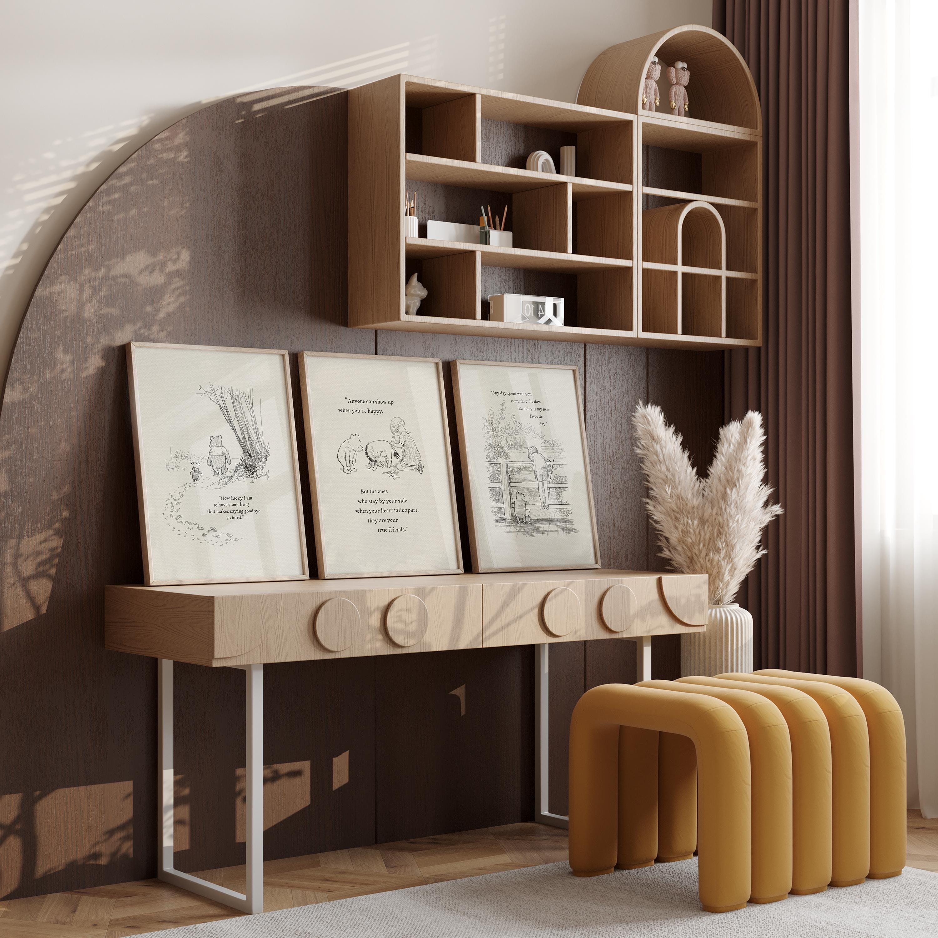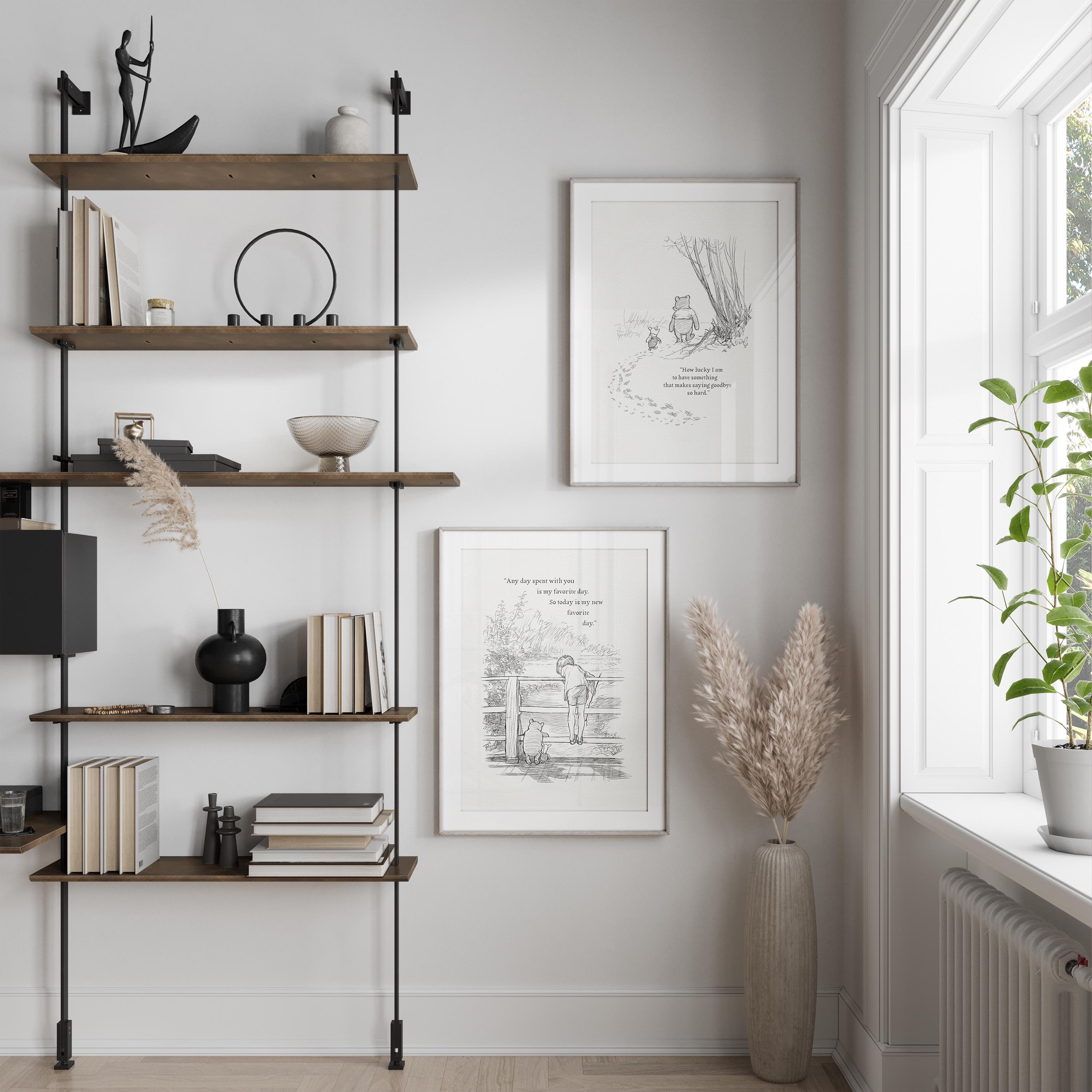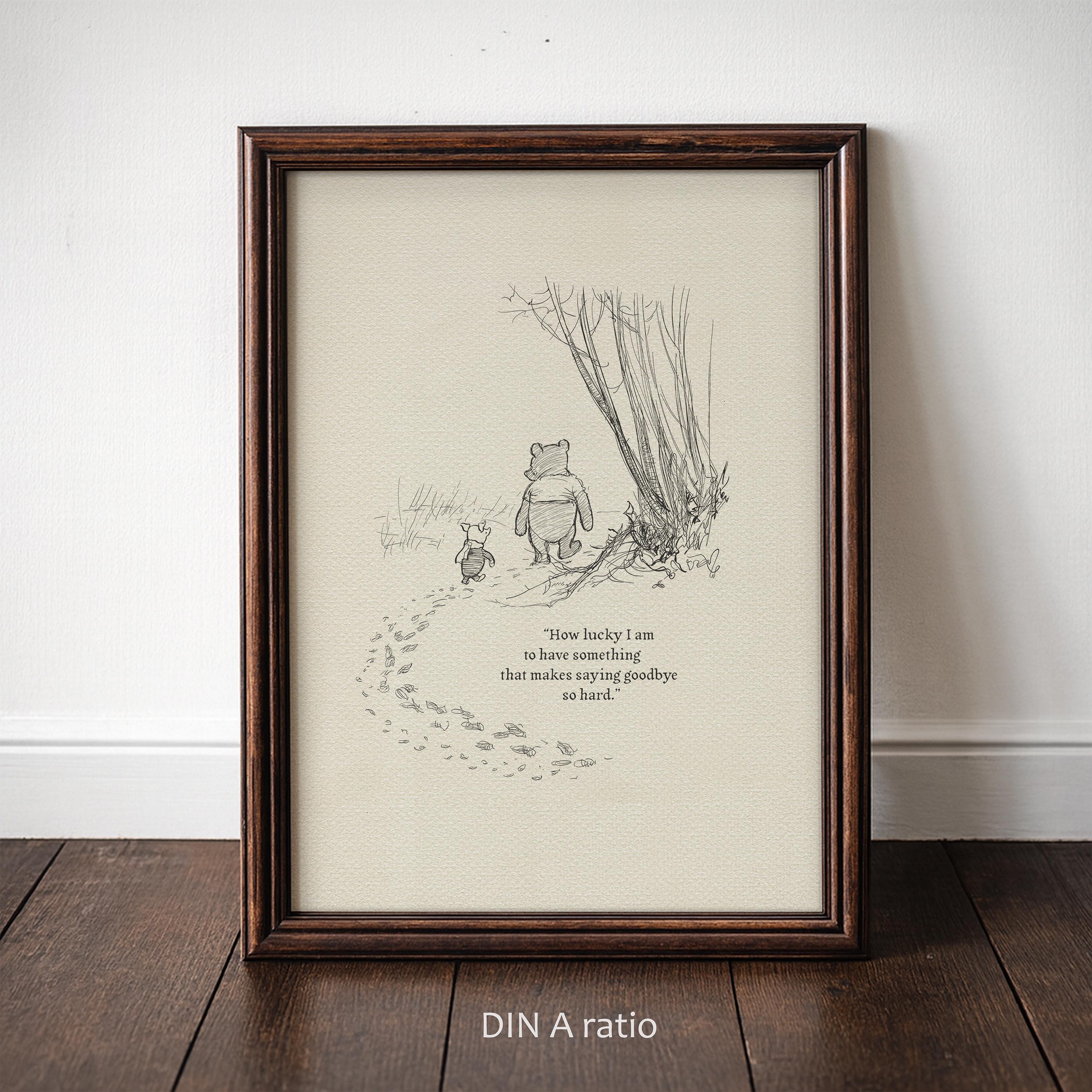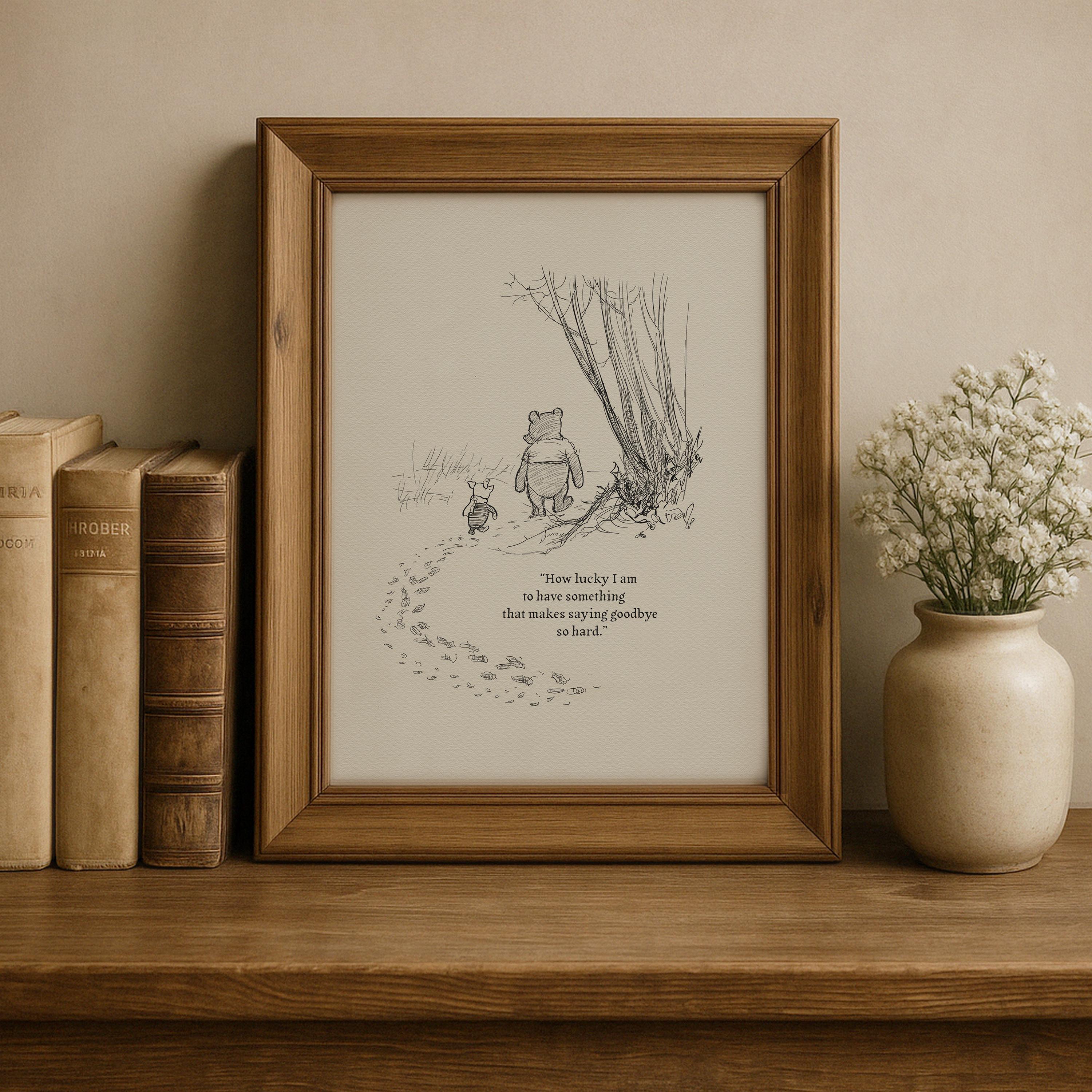 Step back in time to the beloved world of Winnie the Pooh with this meticulously crafted vintage-style black-and-white graphic featuring two inseparable friends walking arm in arm through the wintery Hundred Acre Wood—a timeless scene “in which Pooh and Piglet go hunting and nearly catch a Woozle.” The quote, “How lucky I am to have something that makes saying goodbye so hard,” adds a heartfelt touch, making this print a meaningful and nostalgic piece for fans of the timeless classic.