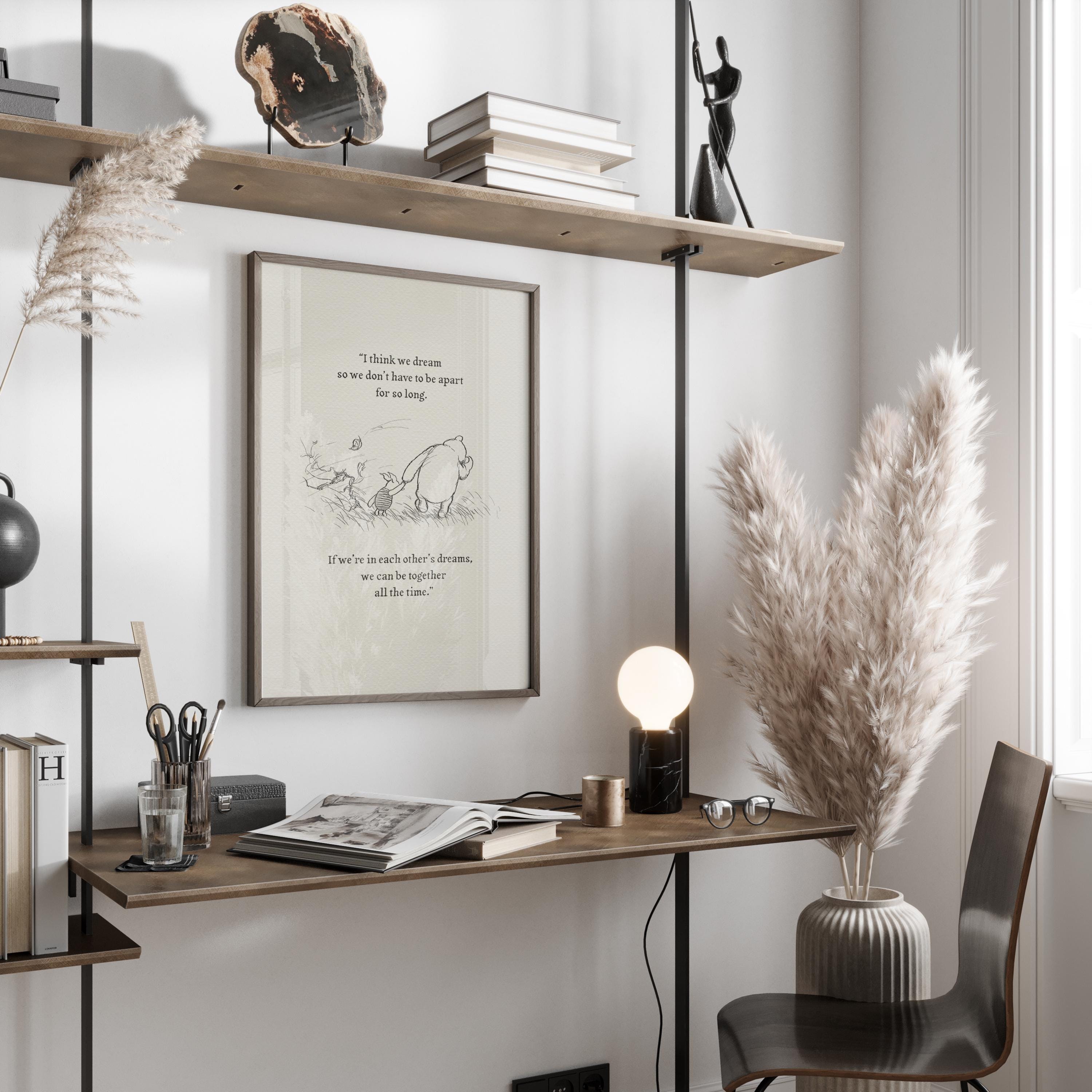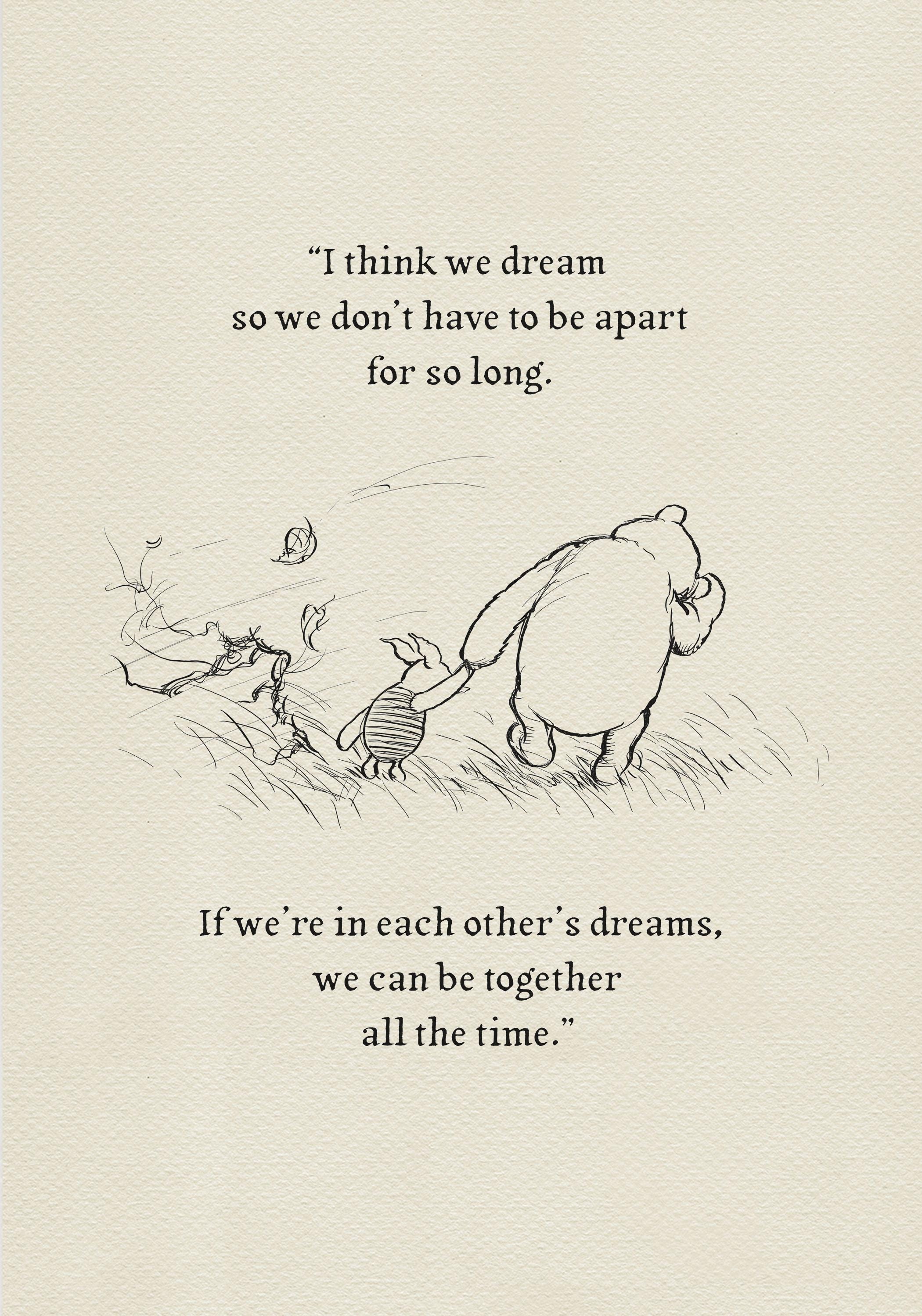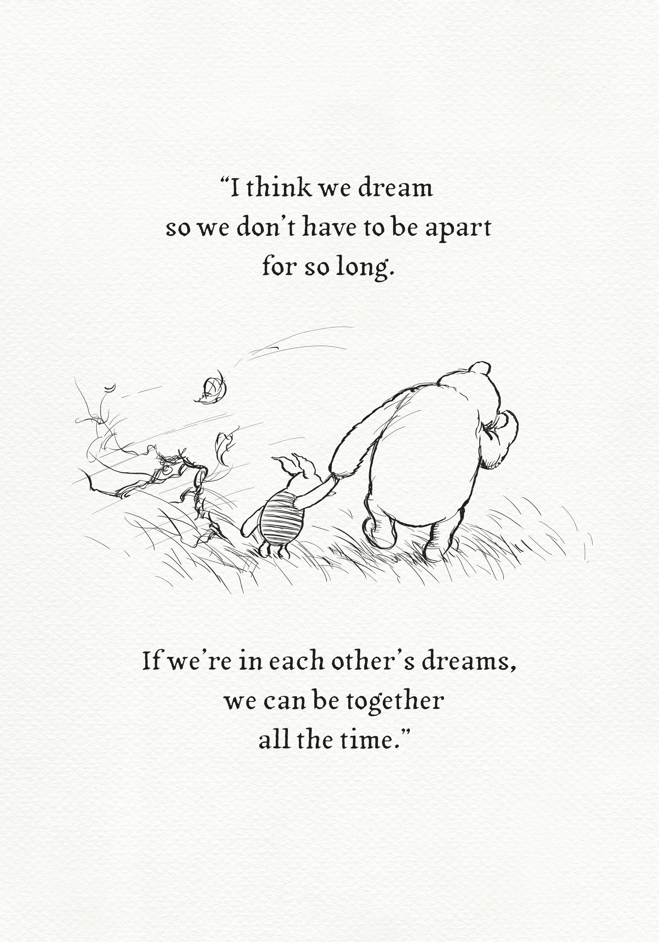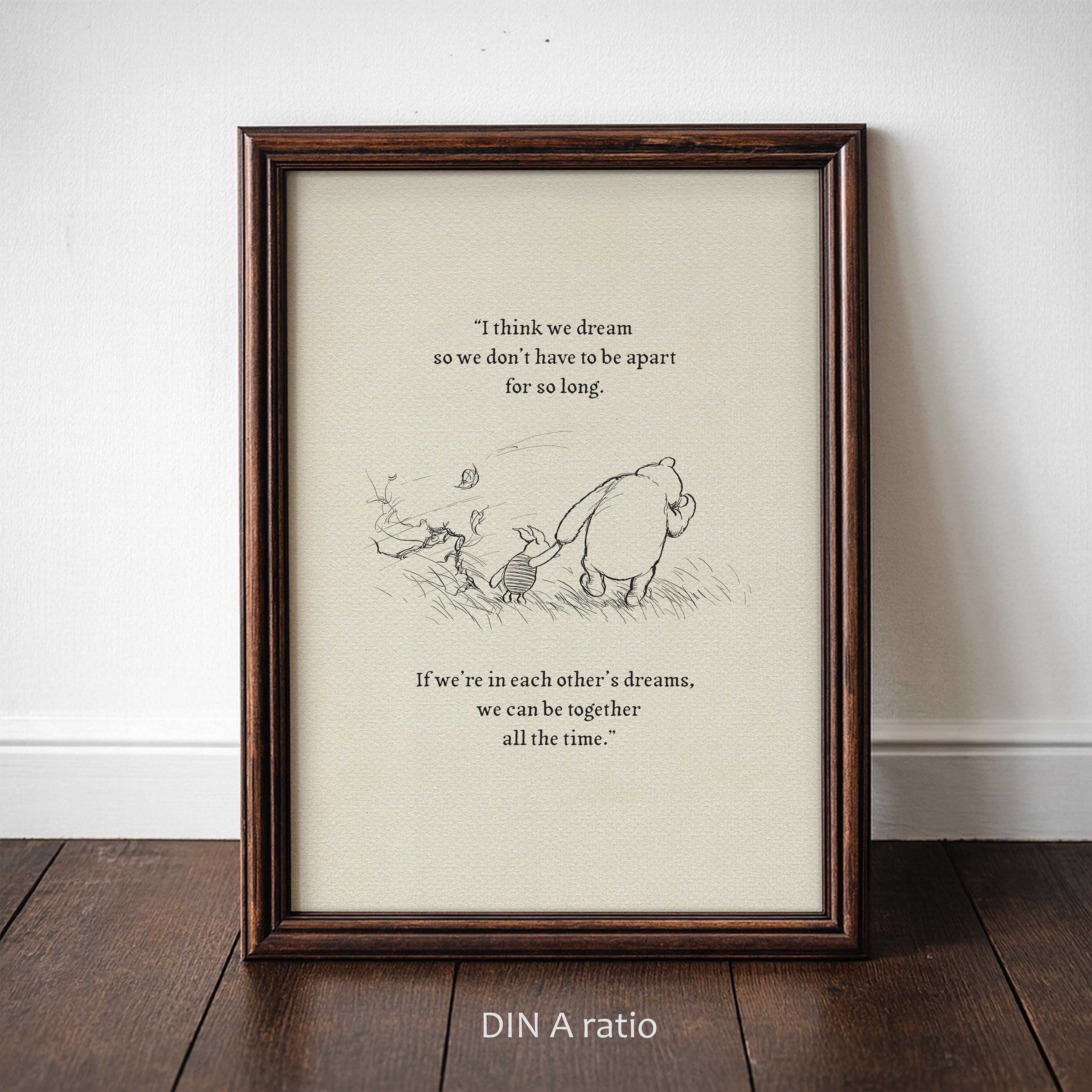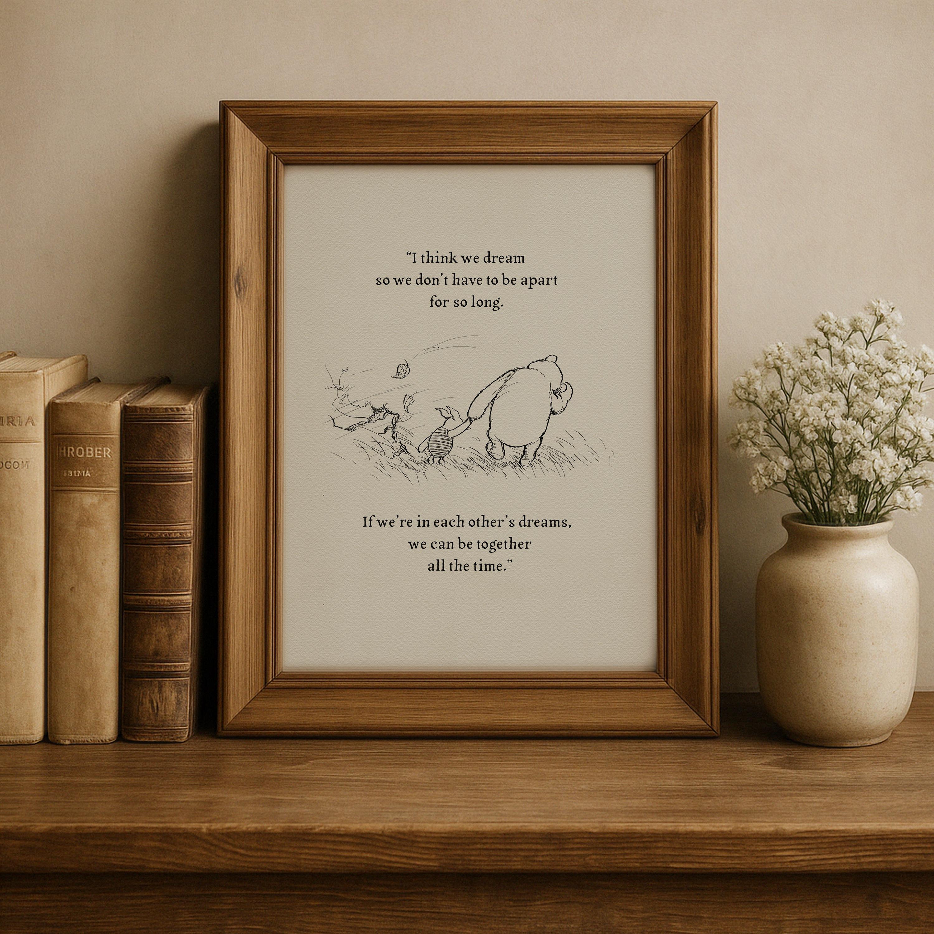 Step back in time to the beloved world of Winnie the Pooh with this meticulously crafted vintage-style black-and-white graphic, depicting the timeless scene where Piglet and Pooh set off on a Very Windy Thursday "to wish everybody a Very Happy Thursday". An added heartfelt quote—"I think we dream so we don’t have to be apart for so long. If we’re in each other’s dreams, we can be together all the time."—enhances the sentimental appeal of this piece, making it a perfect gift or keepsake for Pooh fans and sentimental souls alike.
