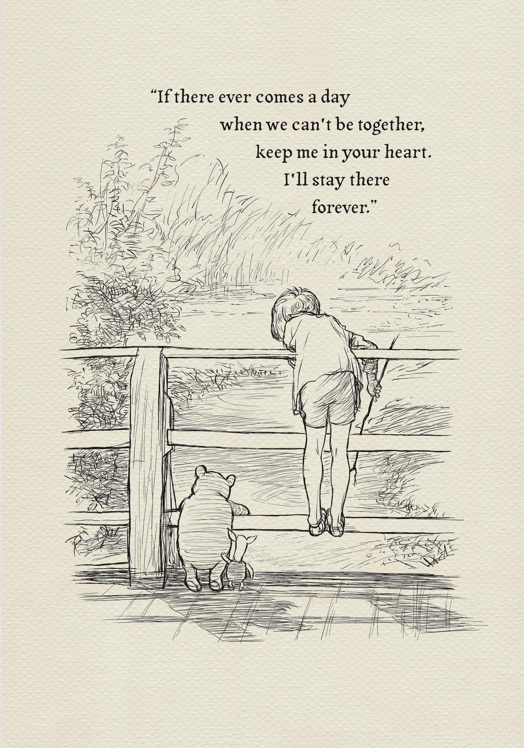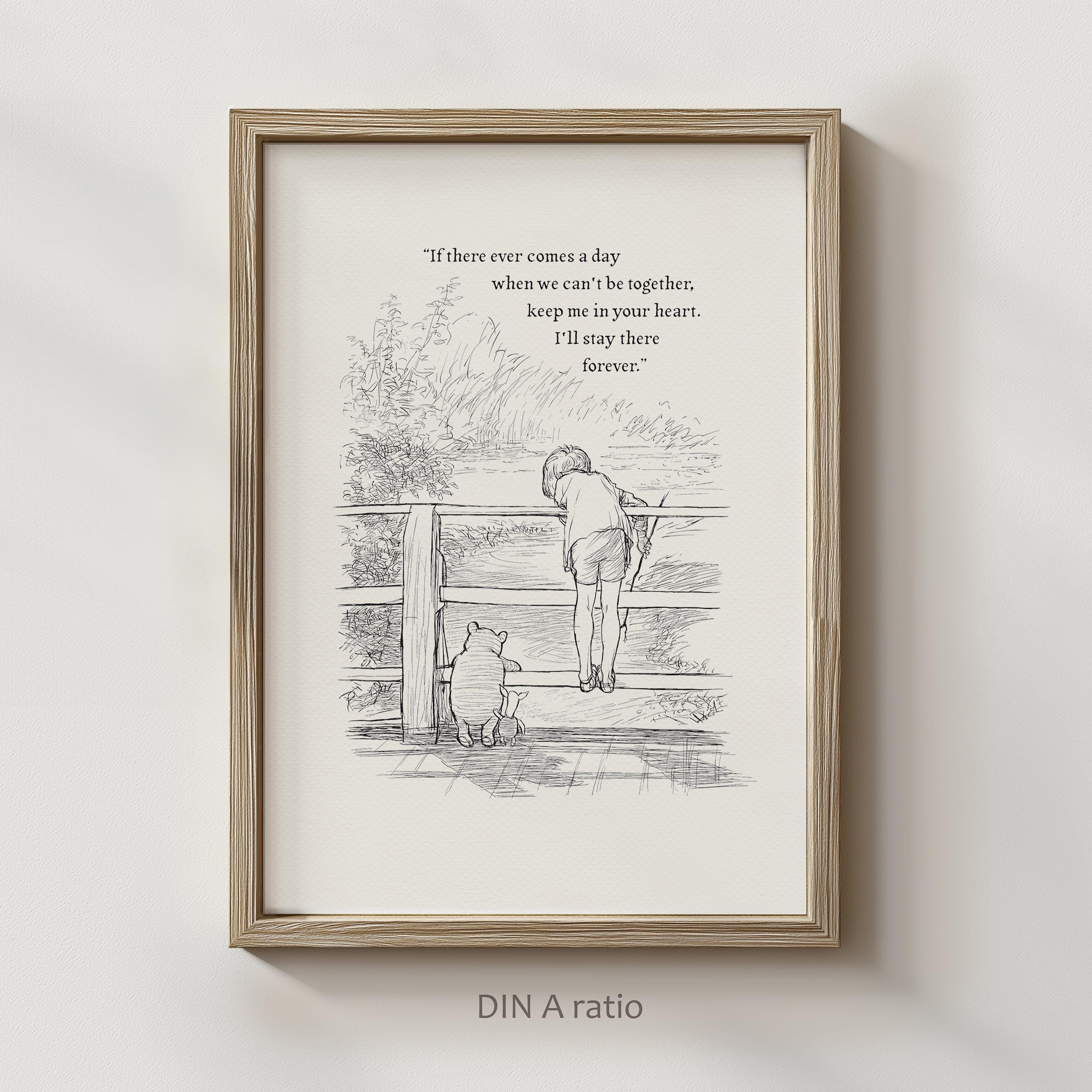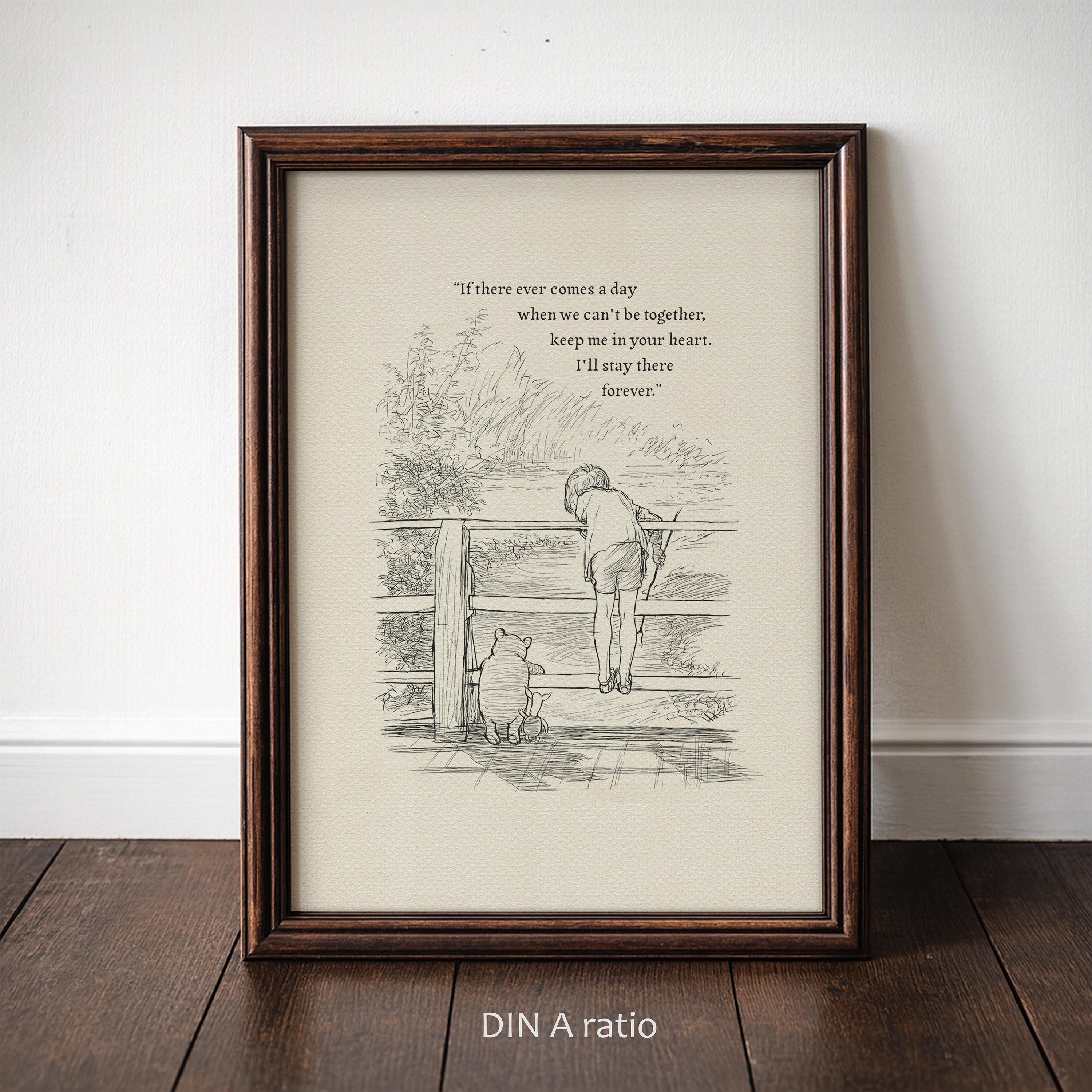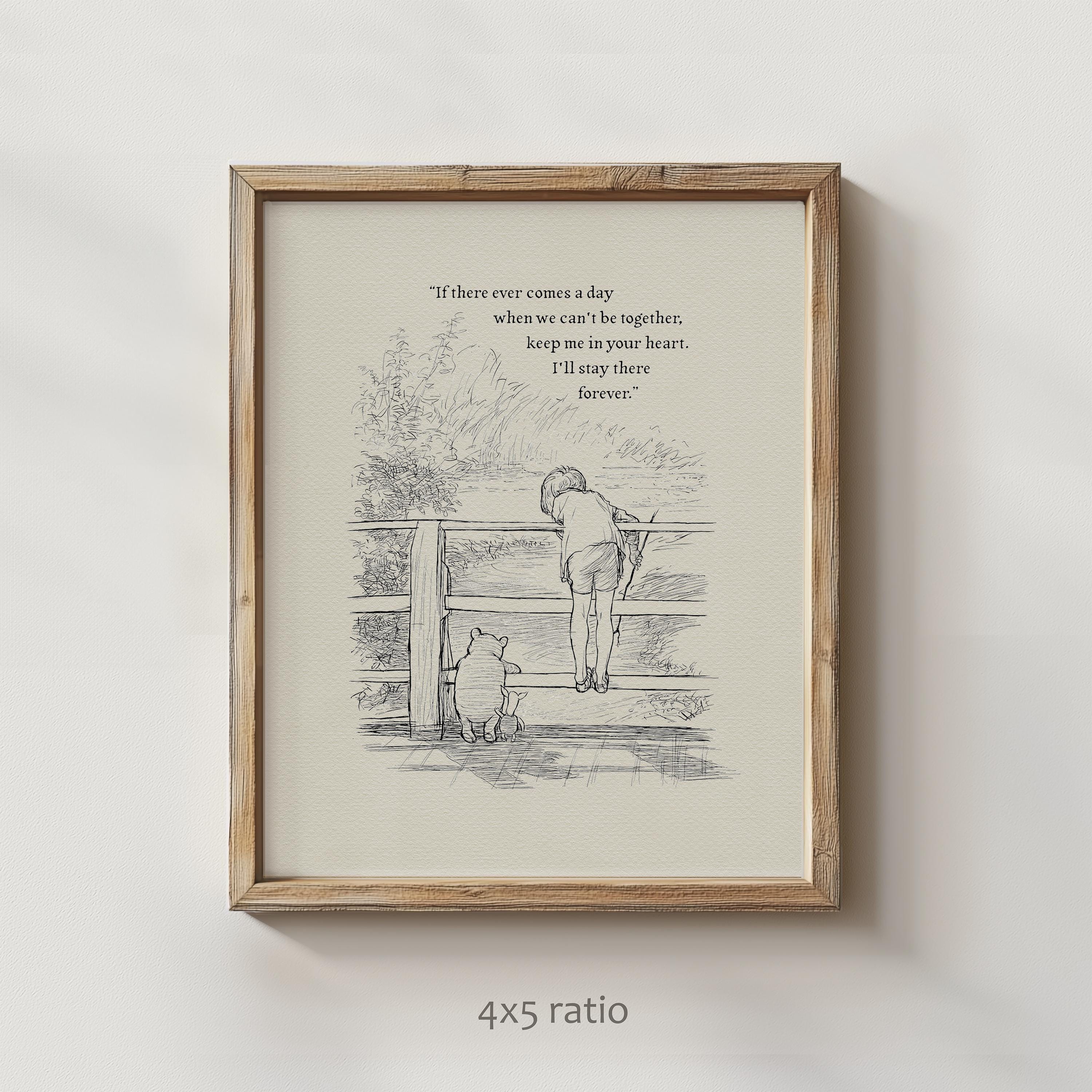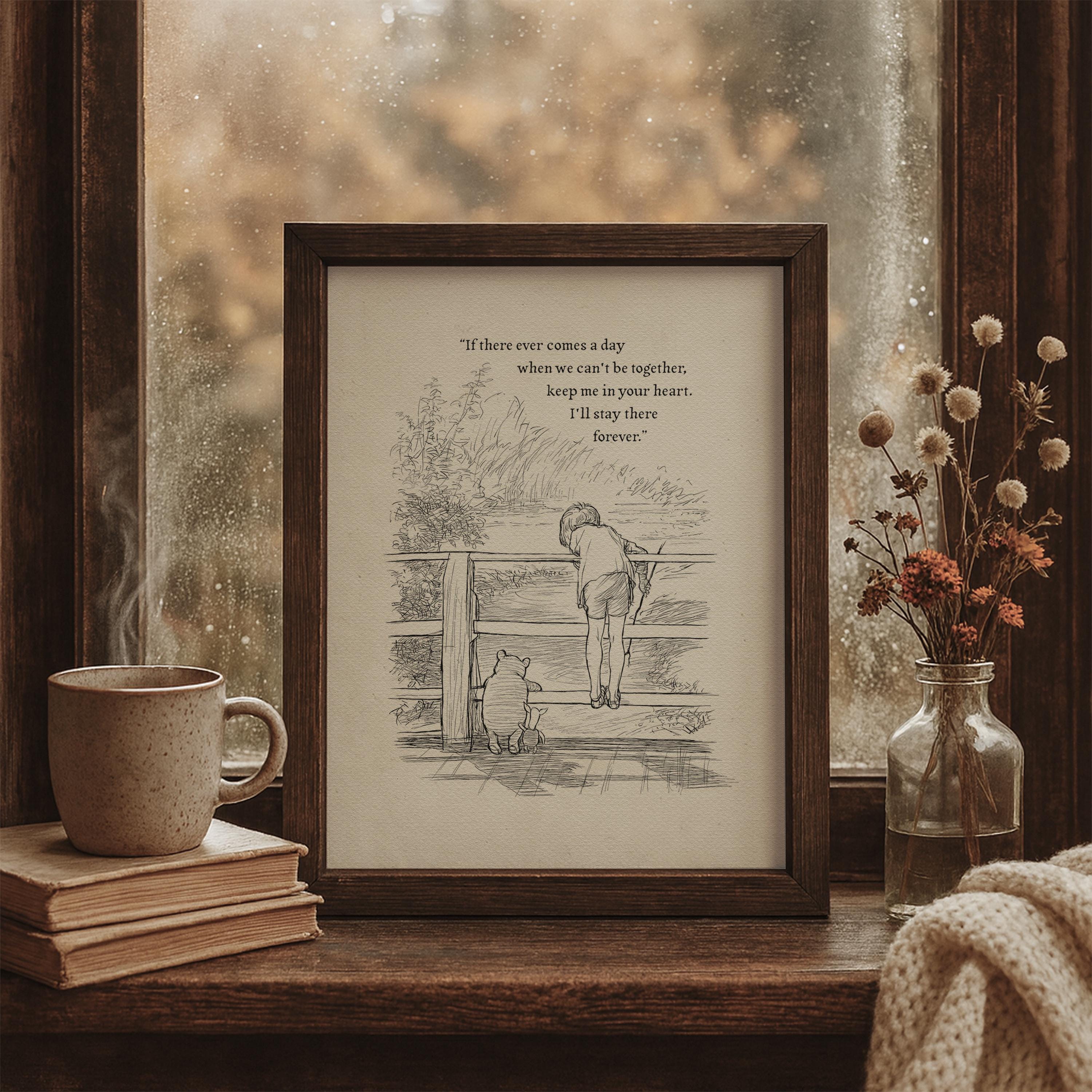 Step back in time to the beloved world of Winnie the Pooh with this meticulously crafted vintage-style black-and-white graphic featuring Winnie the Pooh, Christopher Robin, and Piglet on a bridge playing Poohsticks—a timeless scene from A.A. Milne's classic stories. An added heartfelt quote—"If there ever comes a day when we can't be together, keep me in your heart. I'll stay there forever,"—enhances the sentimental appeal of this piece, making it a perfect gift or keepsake for Pooh fans and sentimental souls alike.