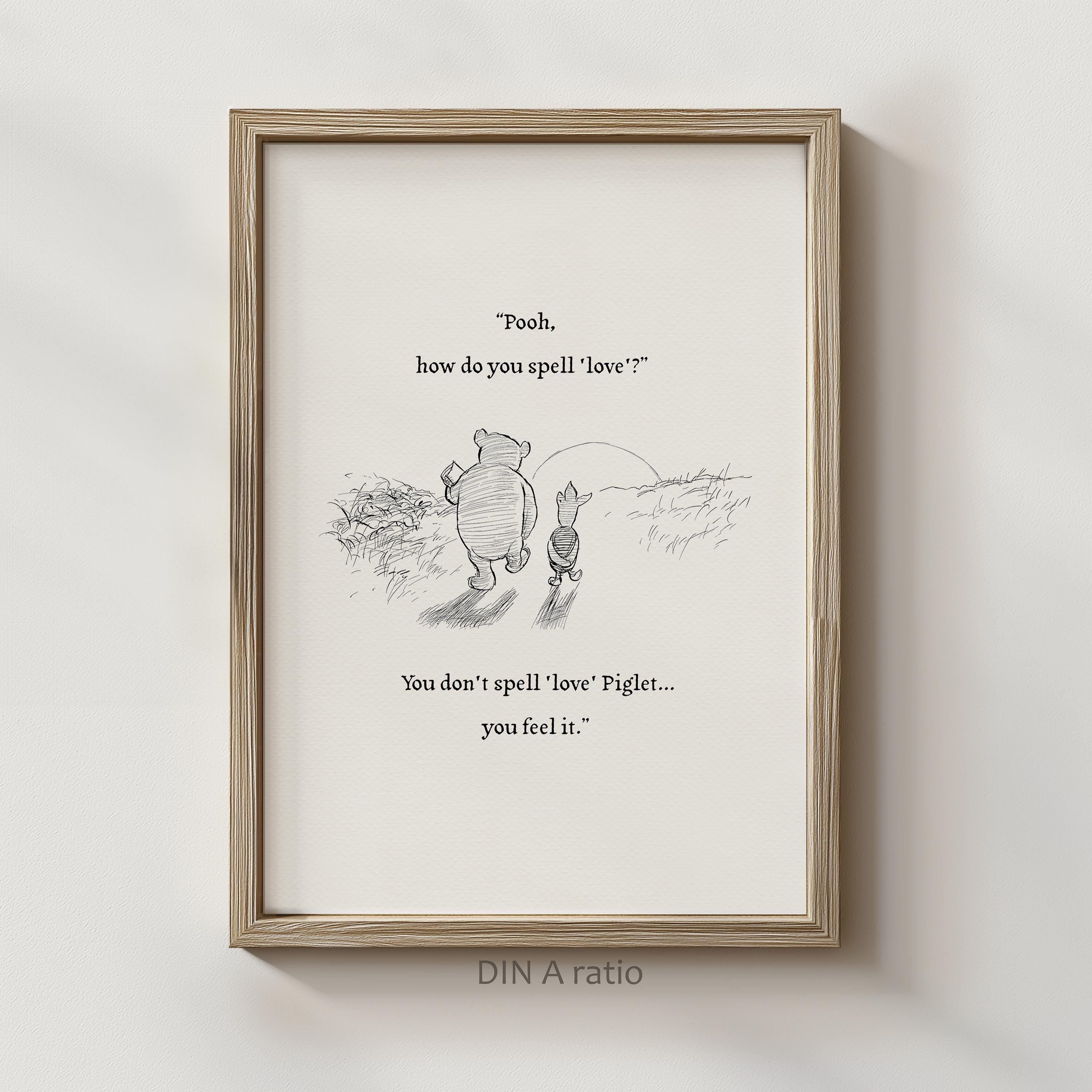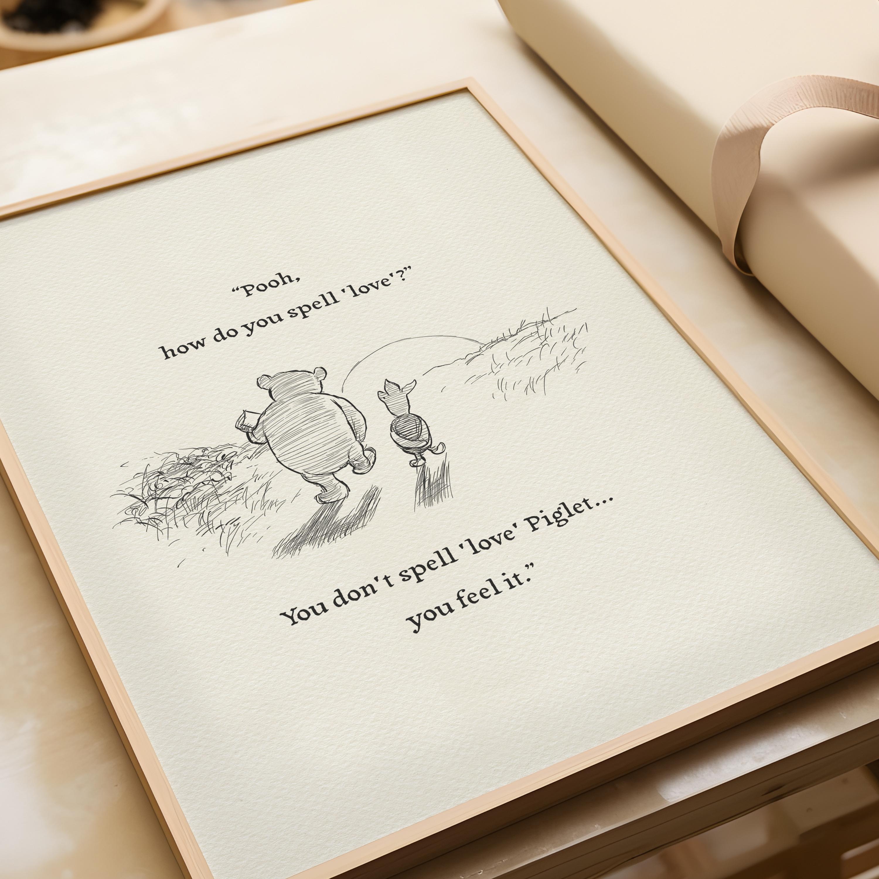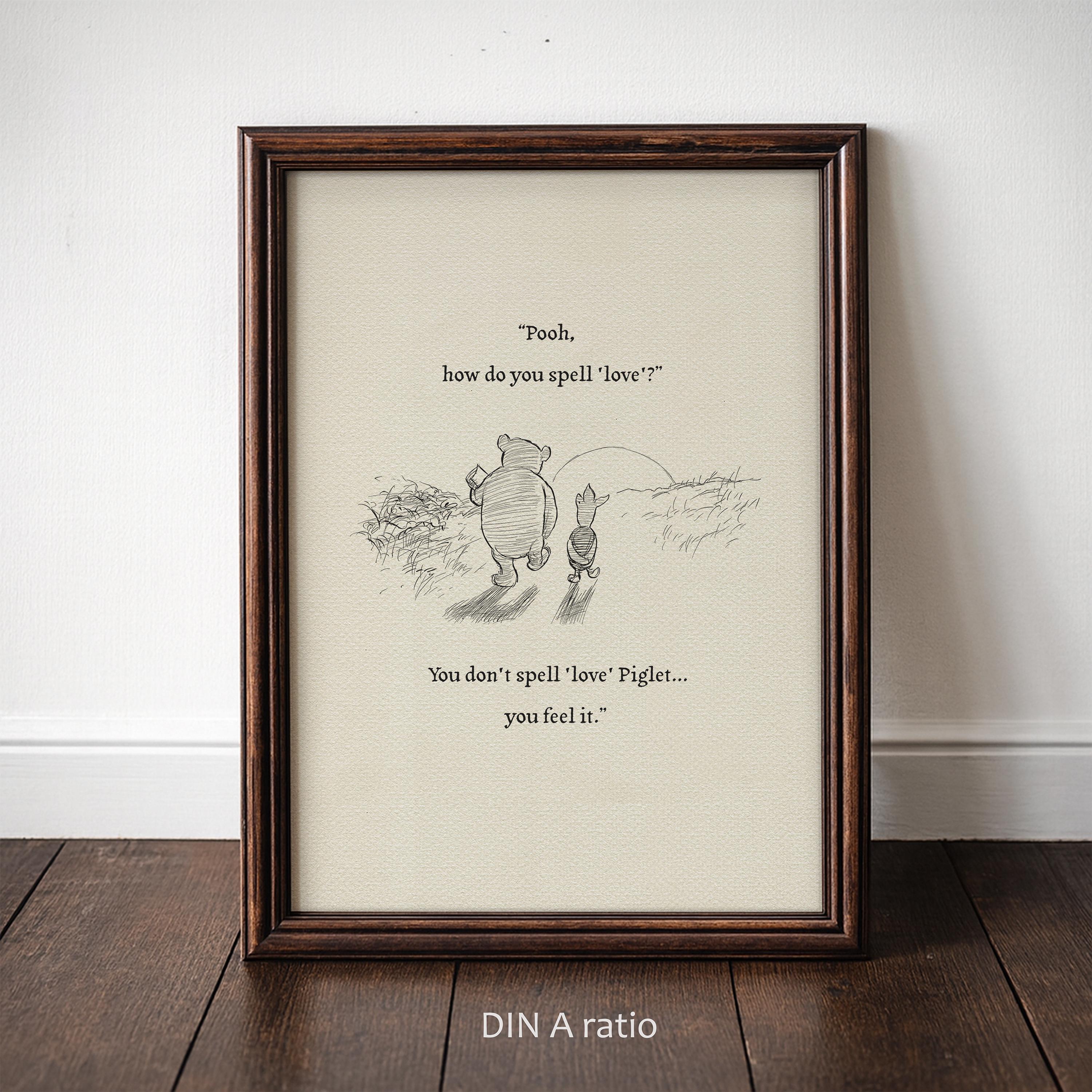 Step back in time to the beloved world of Winnie the Pooh with this meticulously crafted vintage-style black-and-white graphic depicting a tender moment as Pooh and Piglet stroll together in the glow of the setting sun—the timeless "We say Good-Bye" scene. Enriched with a touching quote — "Pooh, how do you spell 'love'?" "You don't spell 'love' Piglet, you feel it." — this poster not only captures this famous scene, but also celebrates the enduring power of love and friendship.