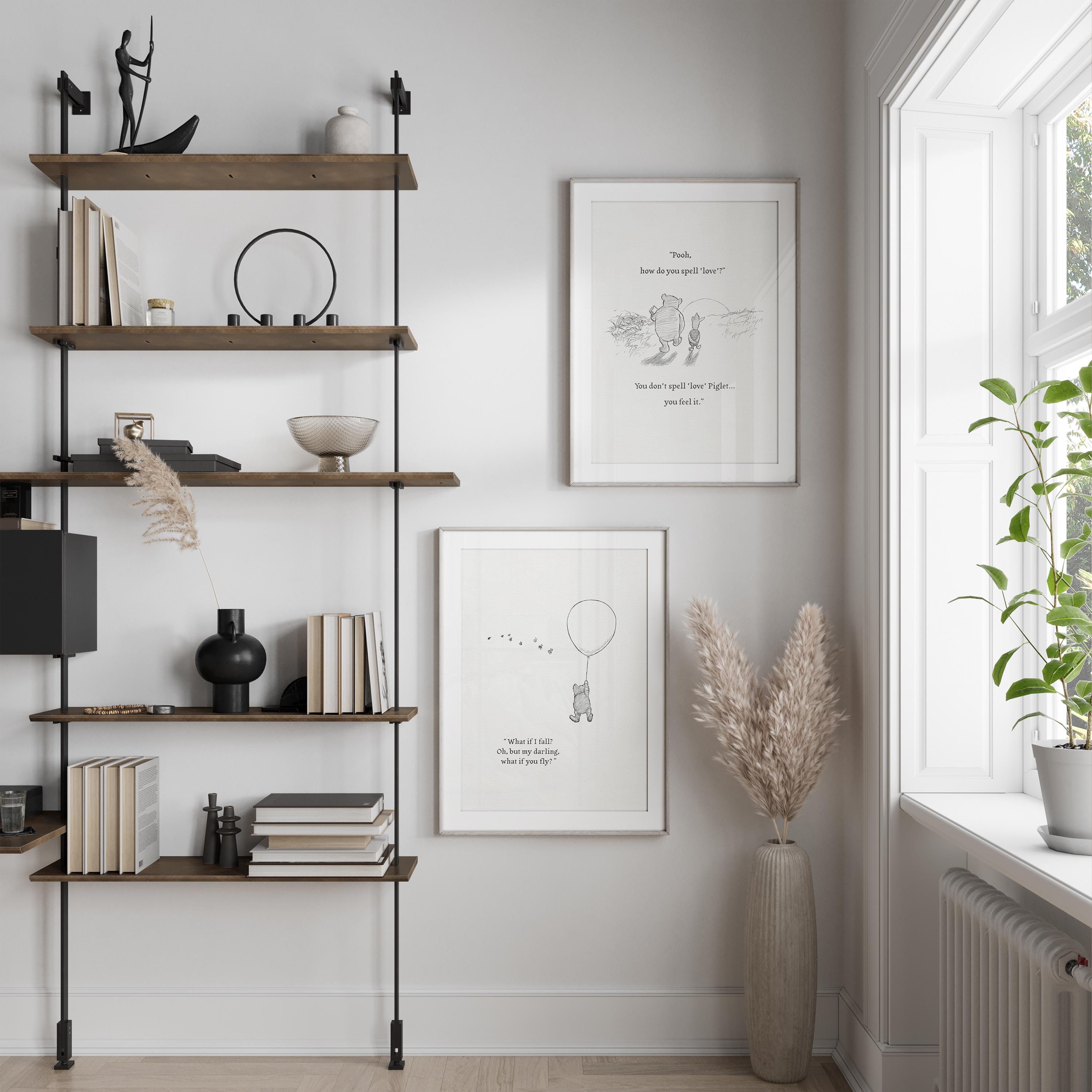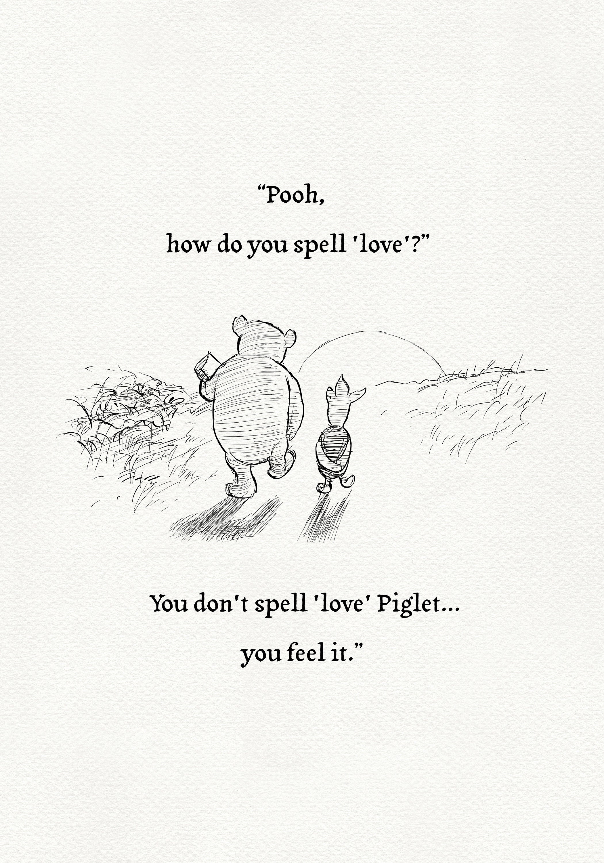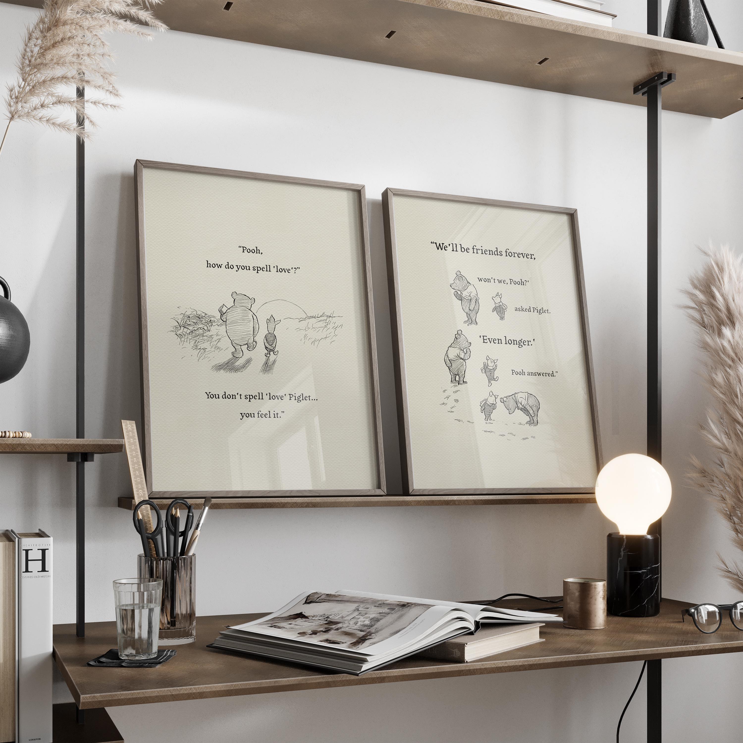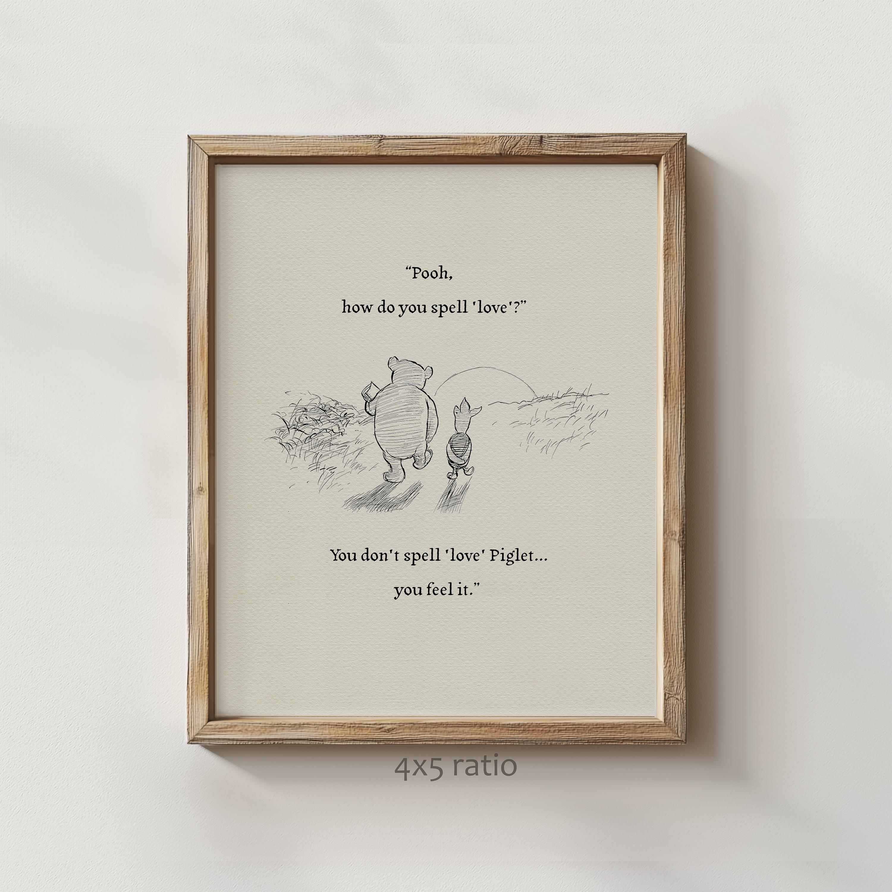 Step back in time to the beloved world of Winnie the Pooh with this meticulously crafted vintage-style black-and-white graphic depicting a tender moment as Pooh and Piglet stroll together in the glow of the setting sun—the timeless "We say Good-Bye" scene. Enriched with a touching quote — "Pooh, how do you spell 'love'?" "You don't spell 'love' Piglet, you feel it." — this poster not only captures this famous scene, but also celebrates the enduring power of love and friendship.