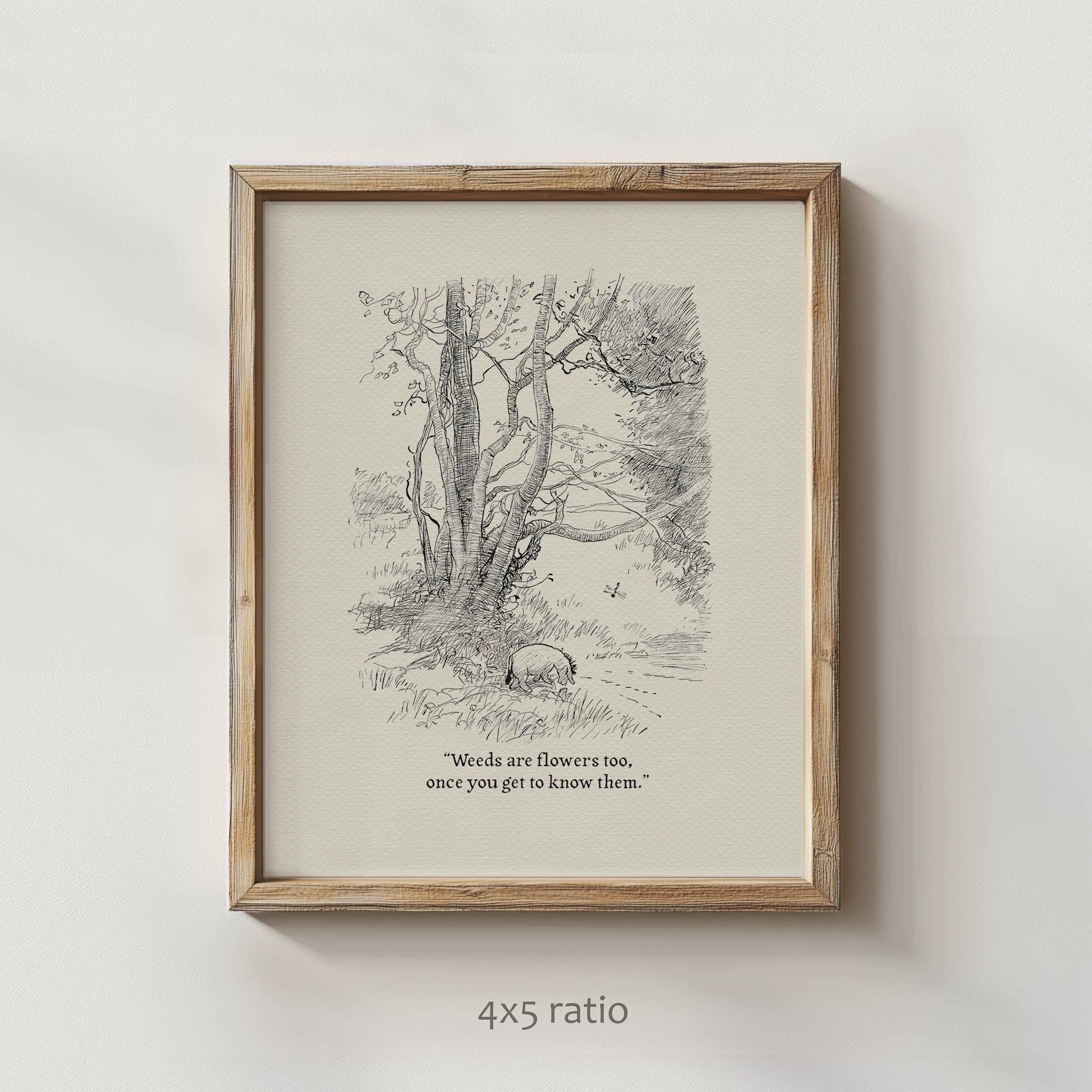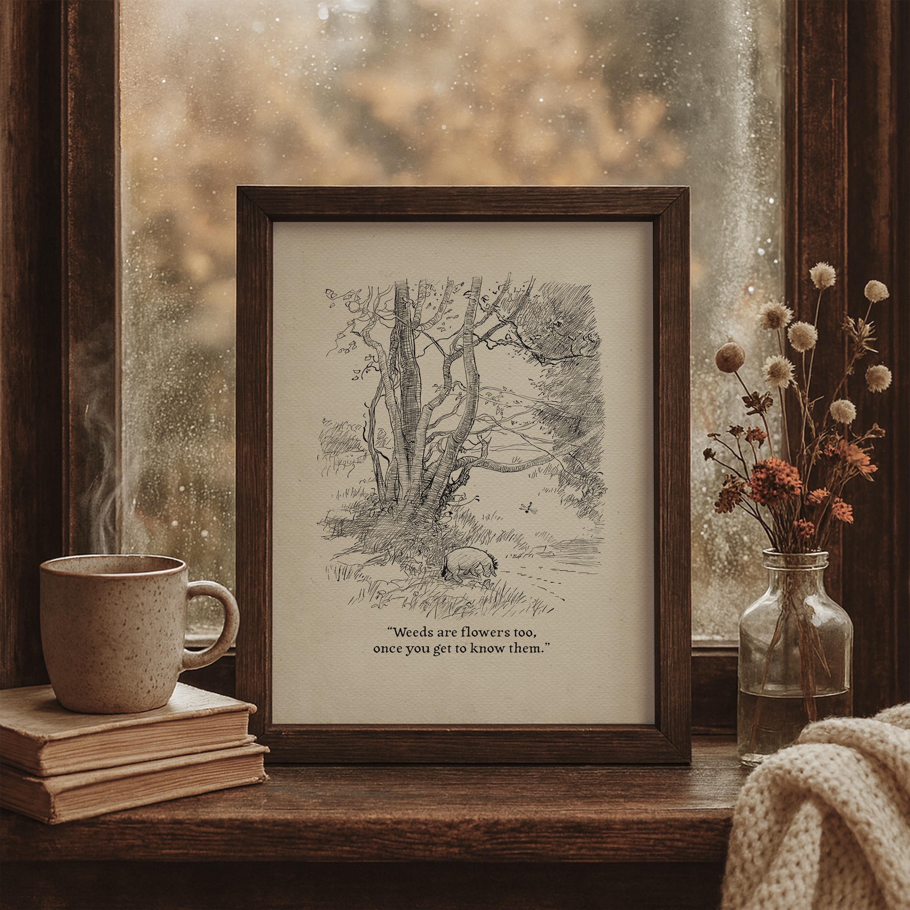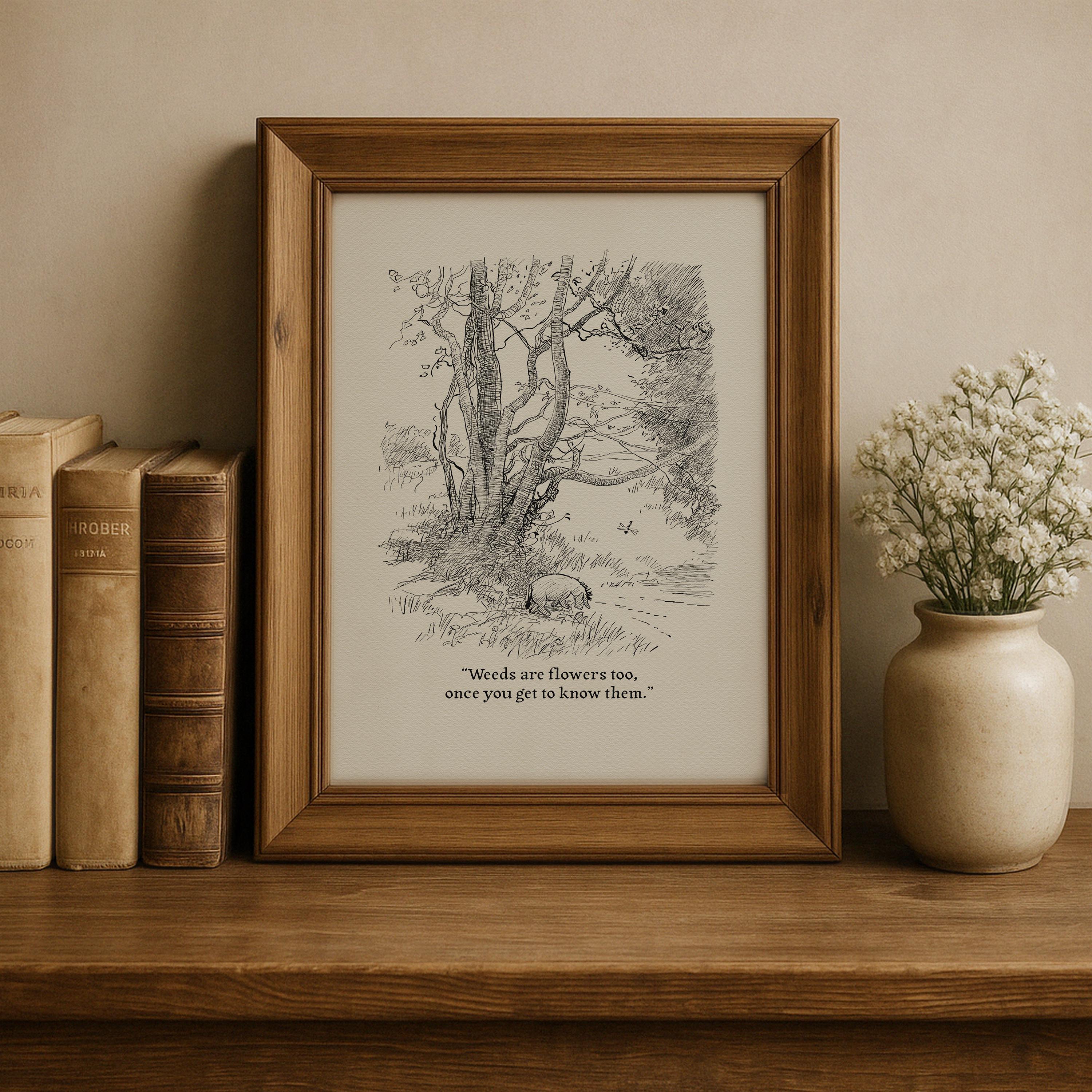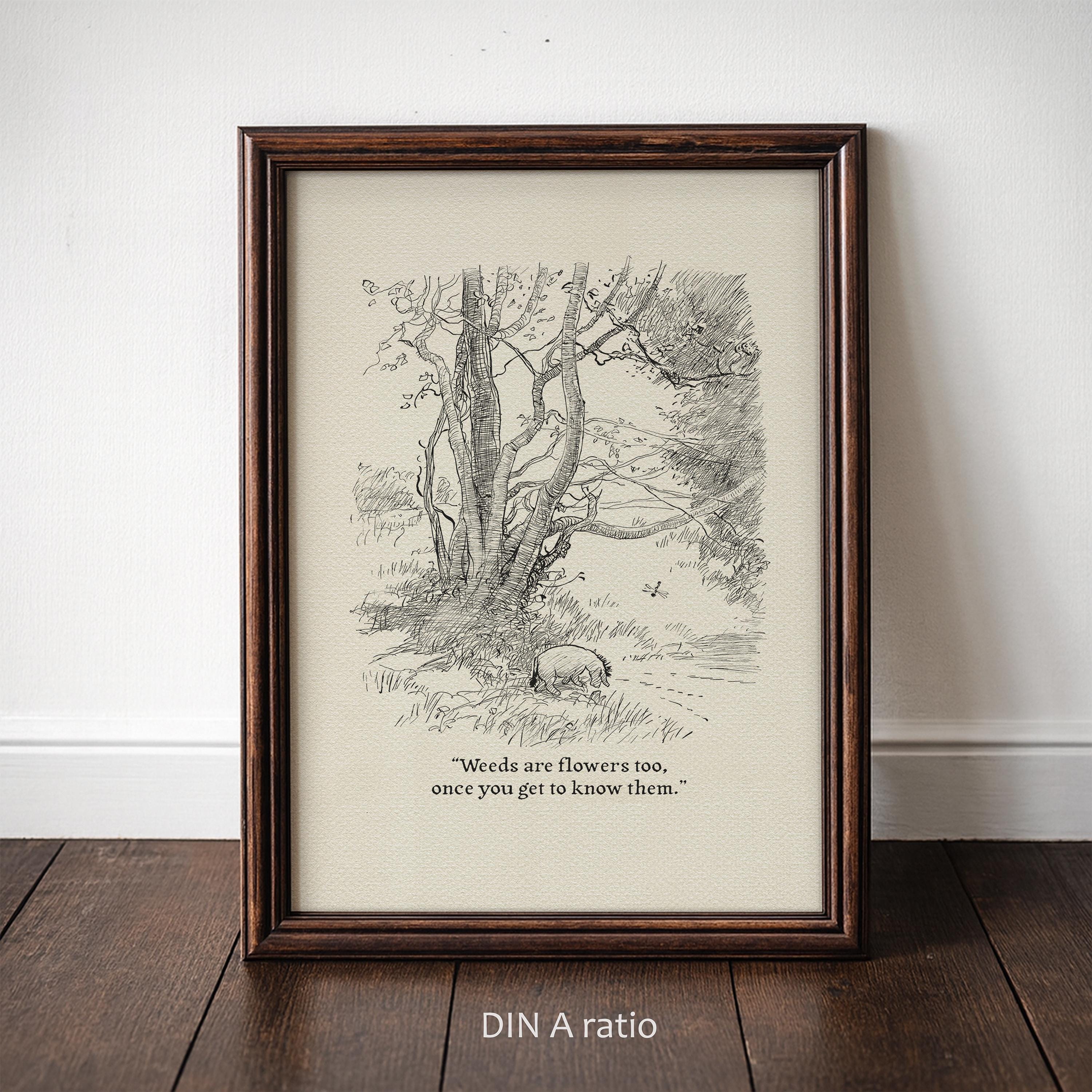 Step back in time to the beloved world of Winnie the Pooh with this meticulously crafted vintage-style black-and-white graphic featuring "Eeyore, the old grey Donkey, standing by the side of the stream, and looked at himself in the water." The soft vintage background and subtle linework create a nostalgic, cozy atmosphere, perfect for children's spaces. The scene is enhanced with an intriguing quote: “Weeds are flowers, too, once you get to know them,” making it a quirky and cozy addition to your little one's room.