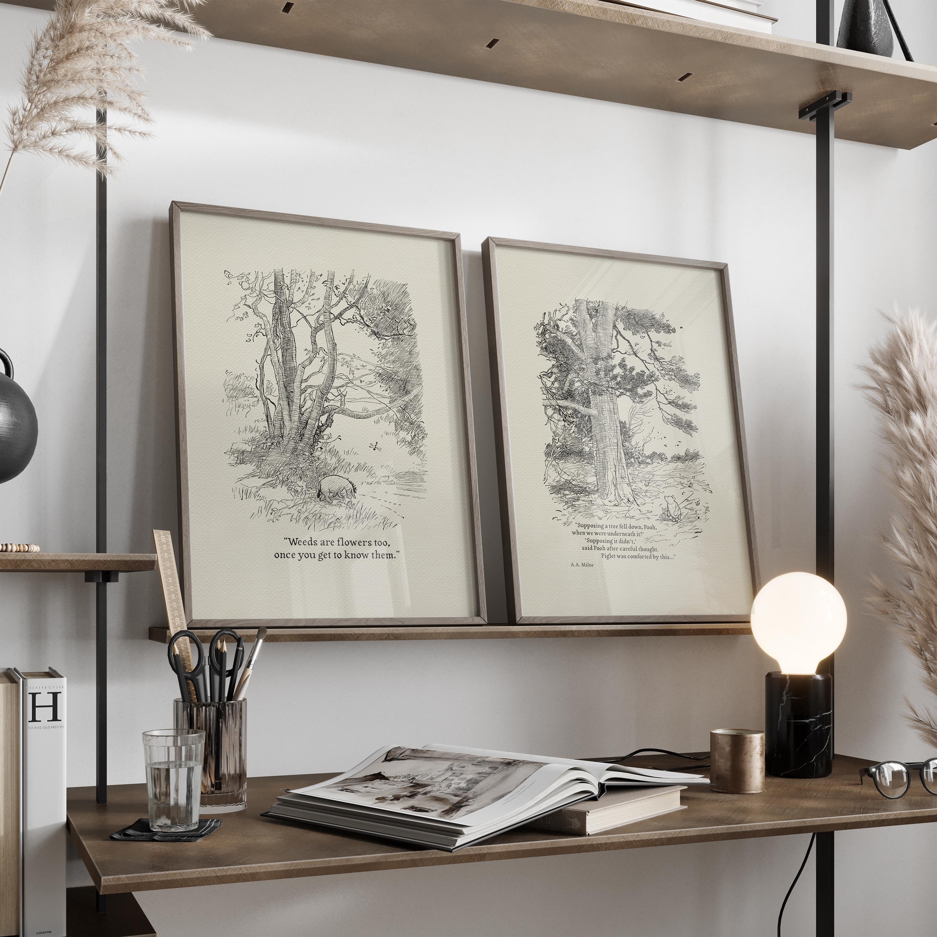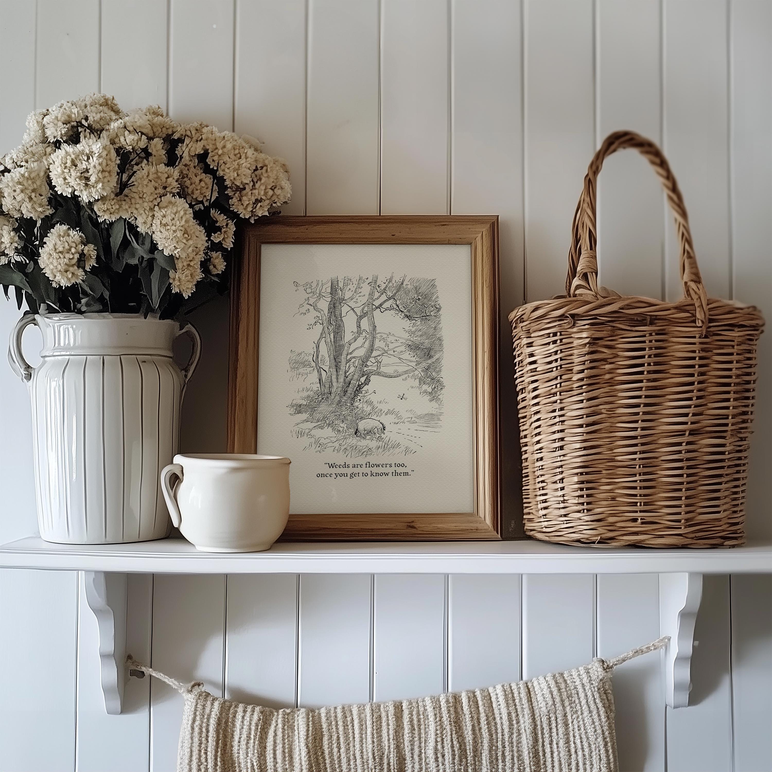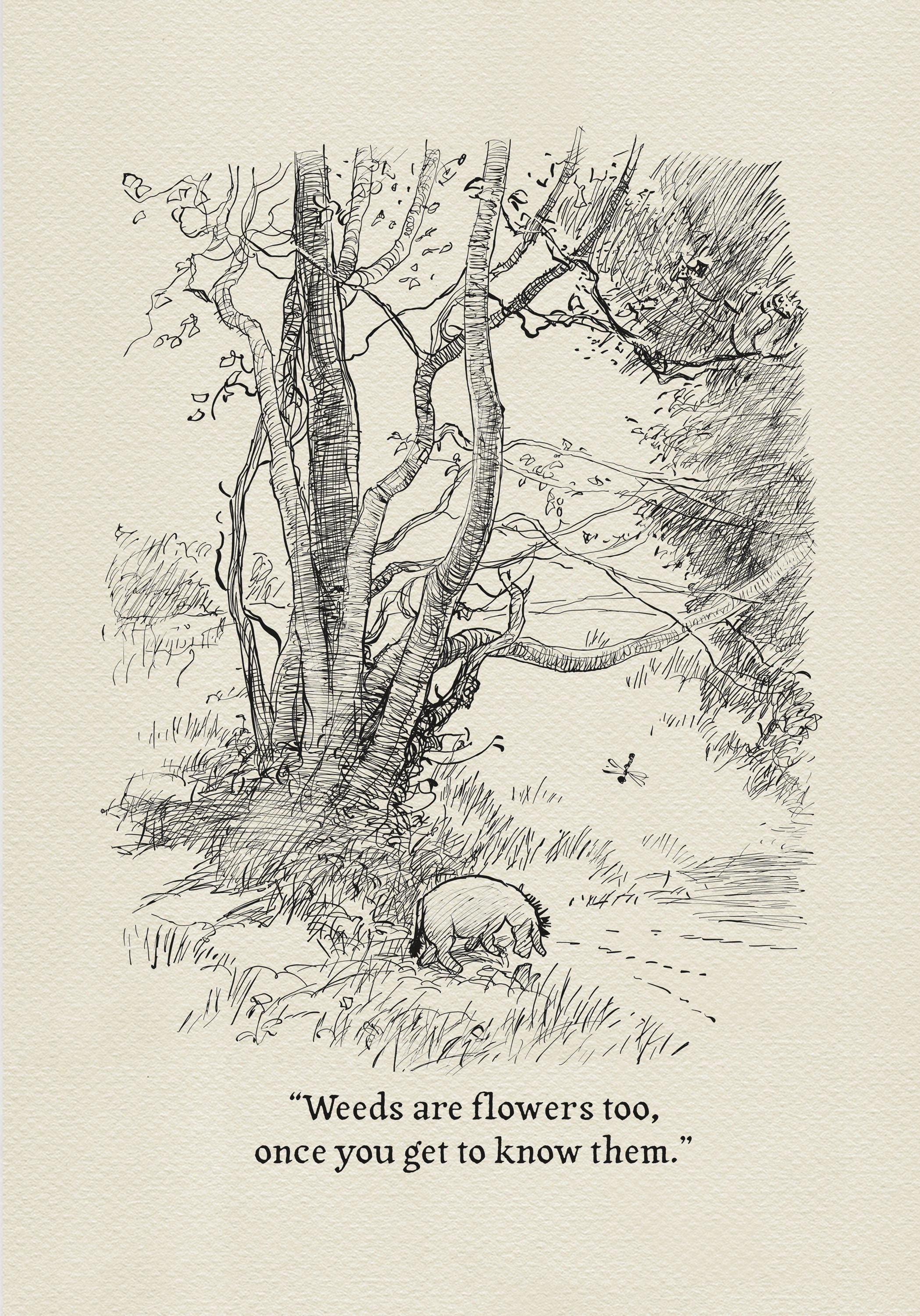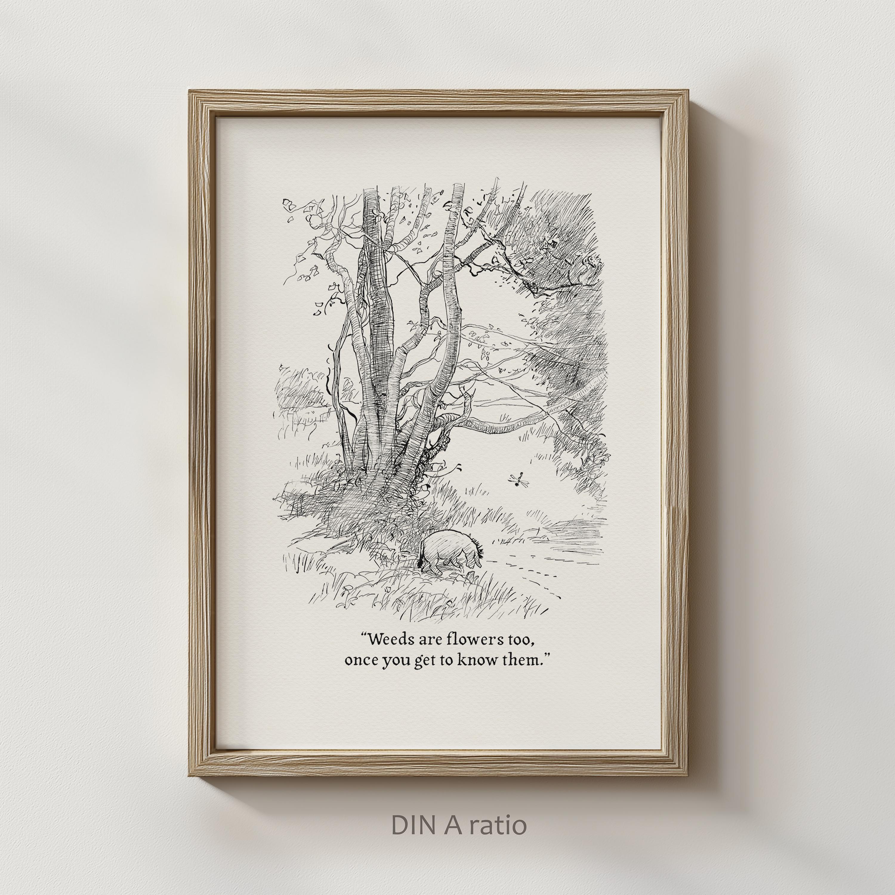 Step back in time to the beloved world of Winnie the Pooh with this meticulously crafted vintage-style black-and-white graphic featuring "Eeyore, the old grey Donkey, standing by the side of the stream, and looked at himself in the water." The soft vintage background and subtle linework create a nostalgic, cozy atmosphere, perfect for children's spaces. The scene is enhanced with an intriguing quote: “Weeds are flowers, too, once you get to know them,” making it a quirky and cozy addition to your little one's room.