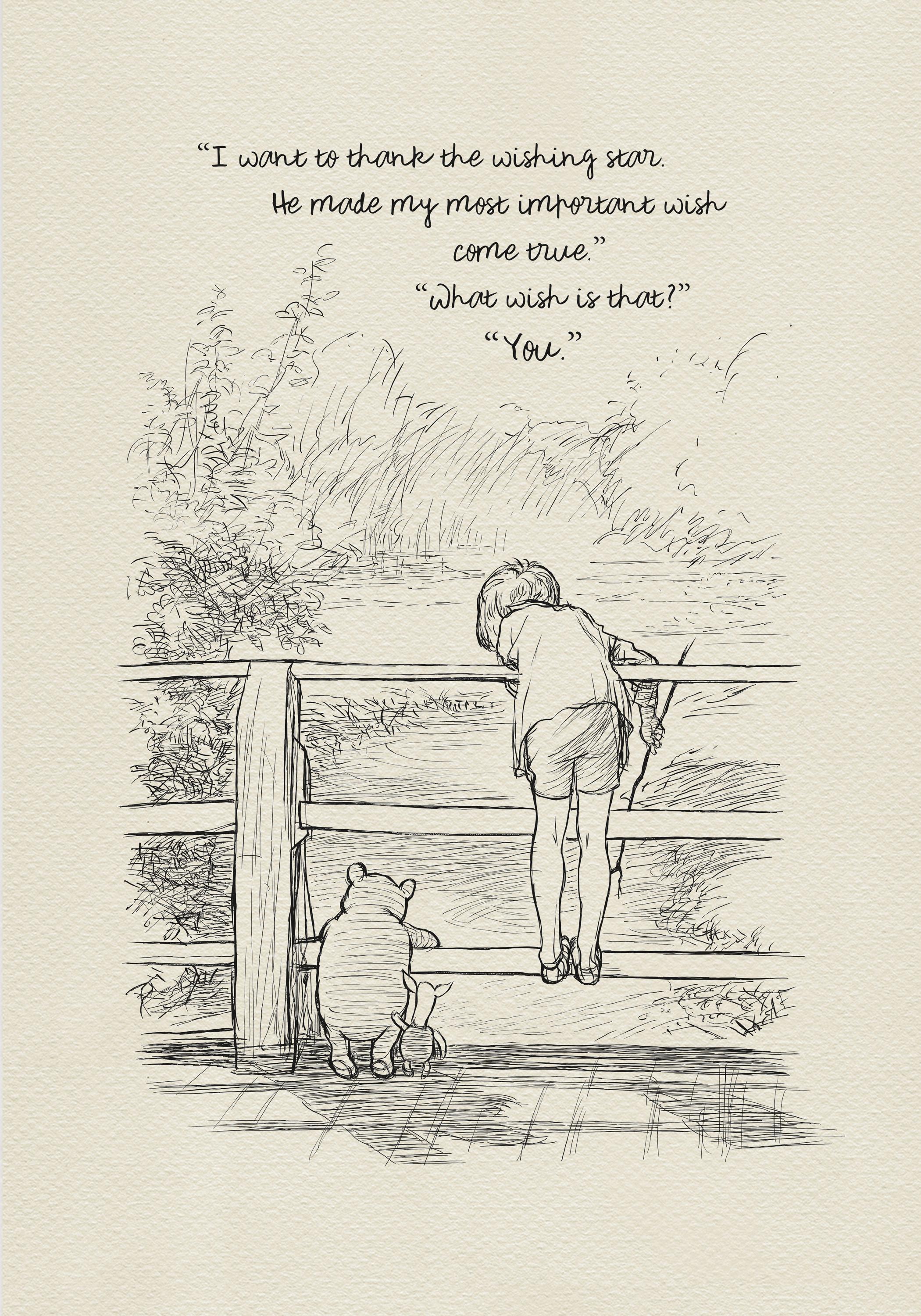 Step back in time to the beloved world of Winnie the Pooh with this meticulously crafted vintage-style black-and-white graphic featuring Winnie the Pooh, Christopher Robin, and Piglet on a bridge playing Poohsticks—a timeless scene from A.A. Milne's classic stories. An added heartfelt quote—"I want to thank the wishing star. He made my most important wish come true..."—enhances the sentimental appeal of this piece, making it a perfect gift or keepsake for Pooh fans and sentimental souls alike.