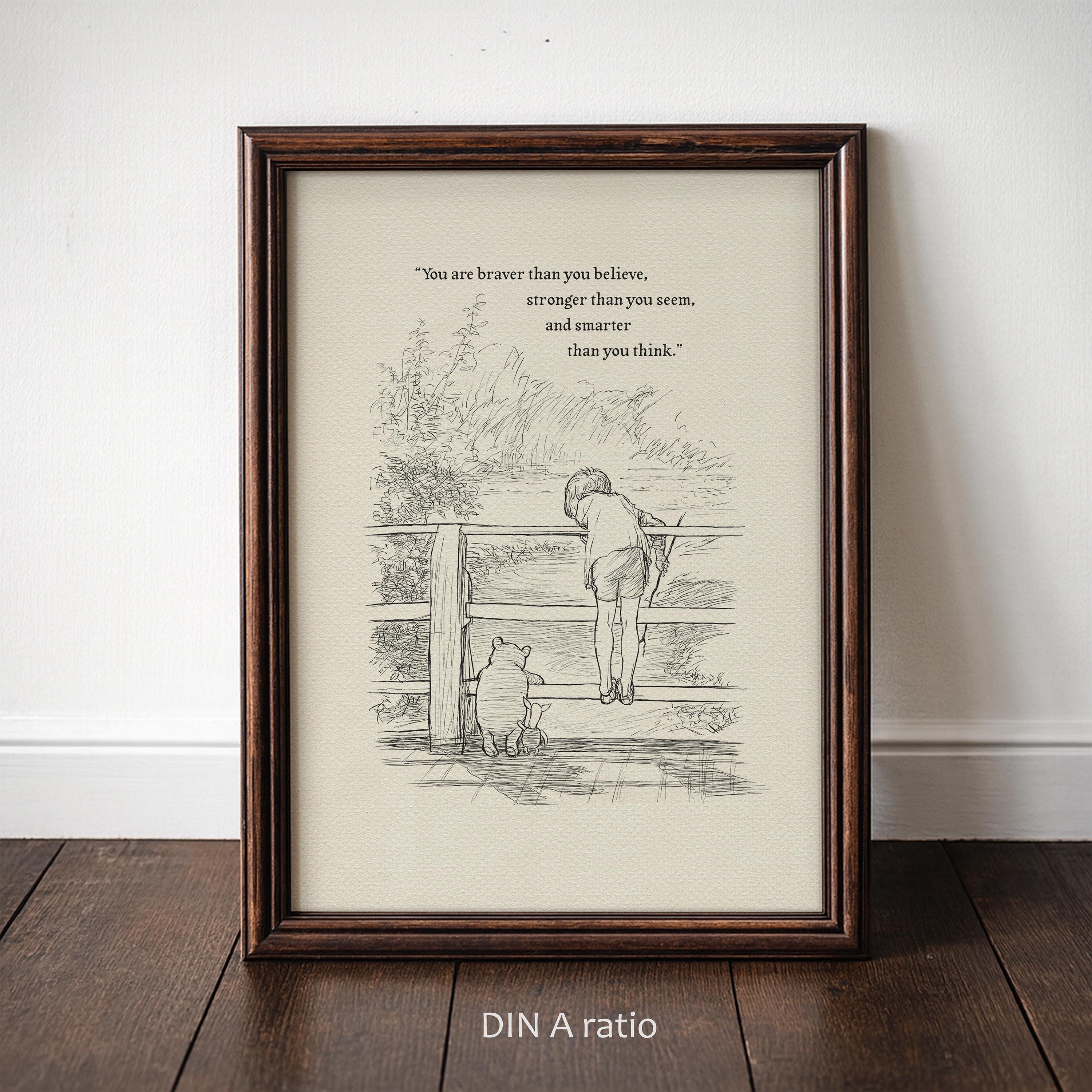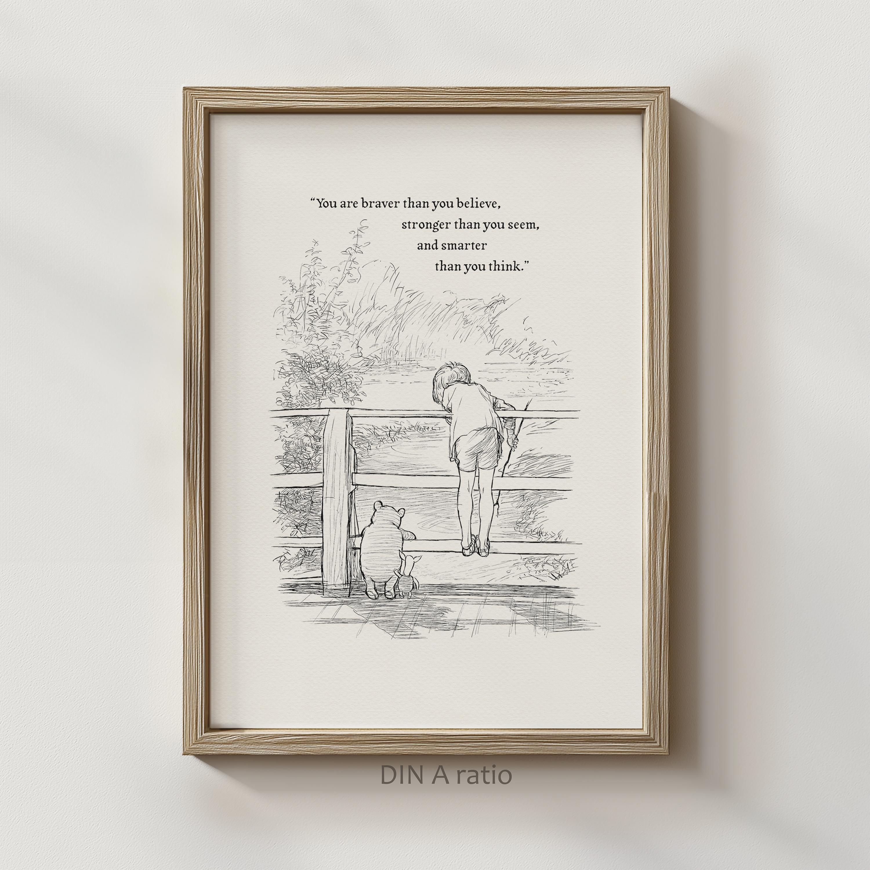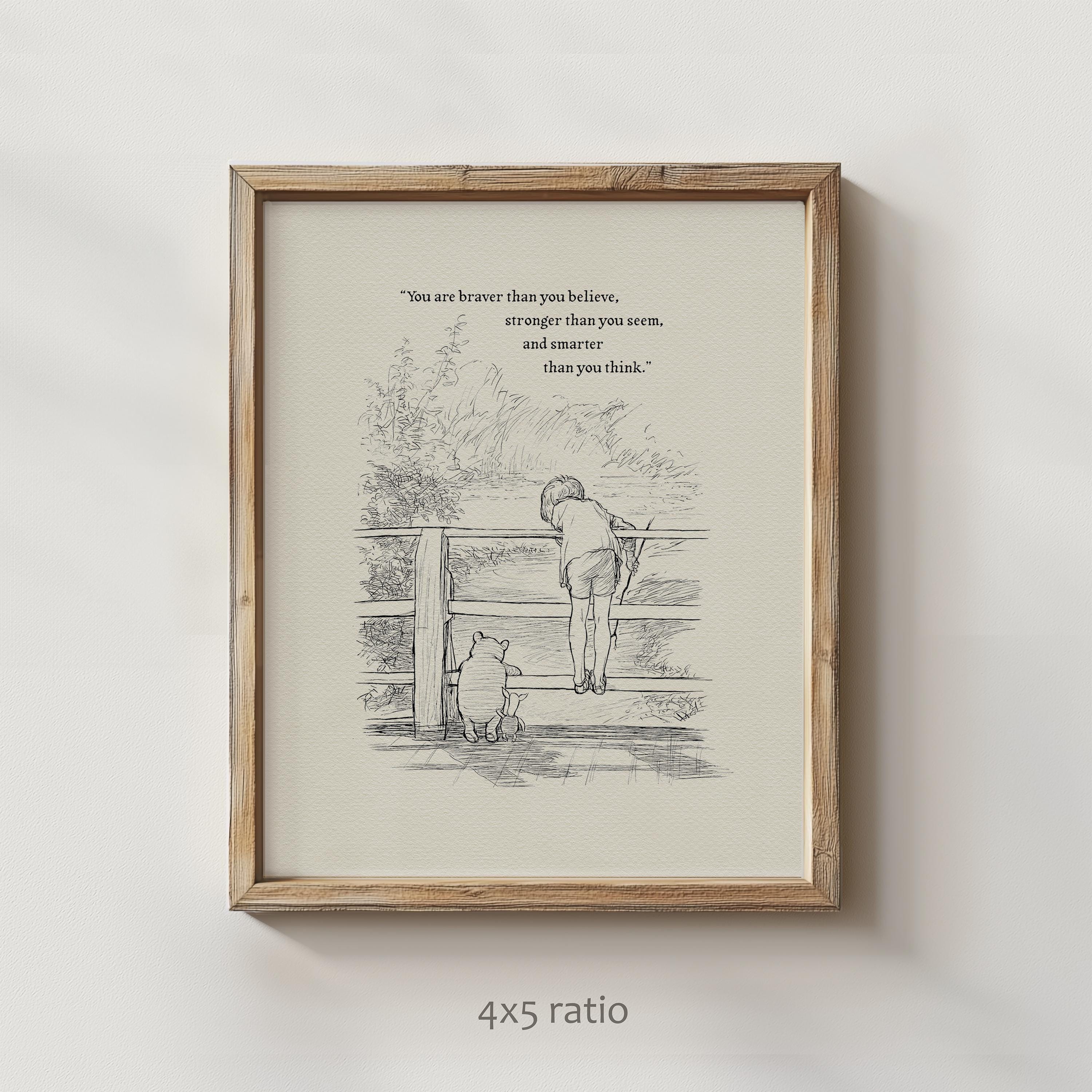 Step back in time to the beloved world of Winnie the Pooh with this meticulously crafted vintage-style black-and-white graphic featuring Winnie the Pooh, Christopher Robin, and Piglet on a bridge playing Poohsticks—a timeless scene from A.A. Milne's classic stories. The illustration is accompanied by an inspiring quote by Carter Crocker: “You are braver than you believe, stronger than you seem, and smarter than you think,” reminding us all of our inner strength and resilience.