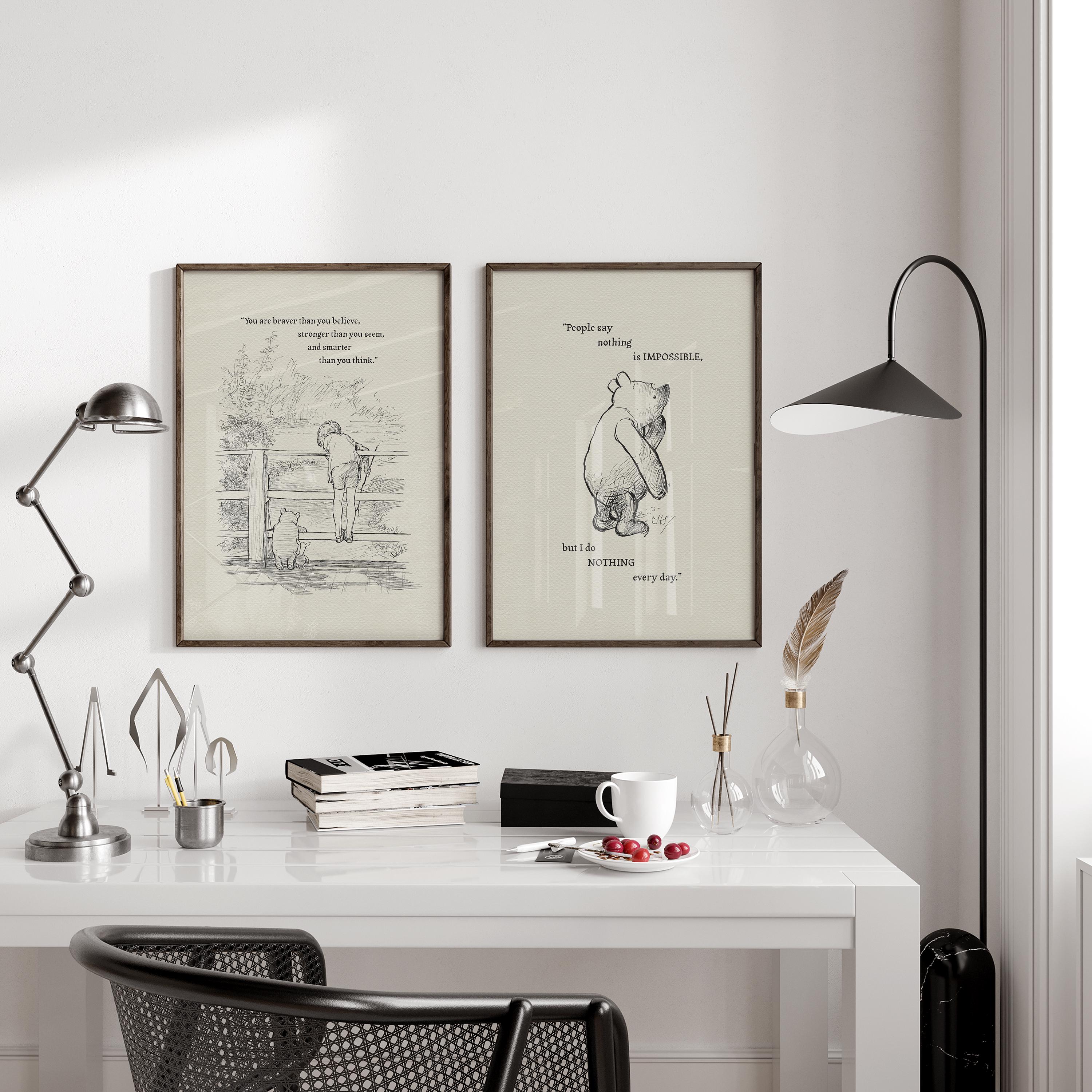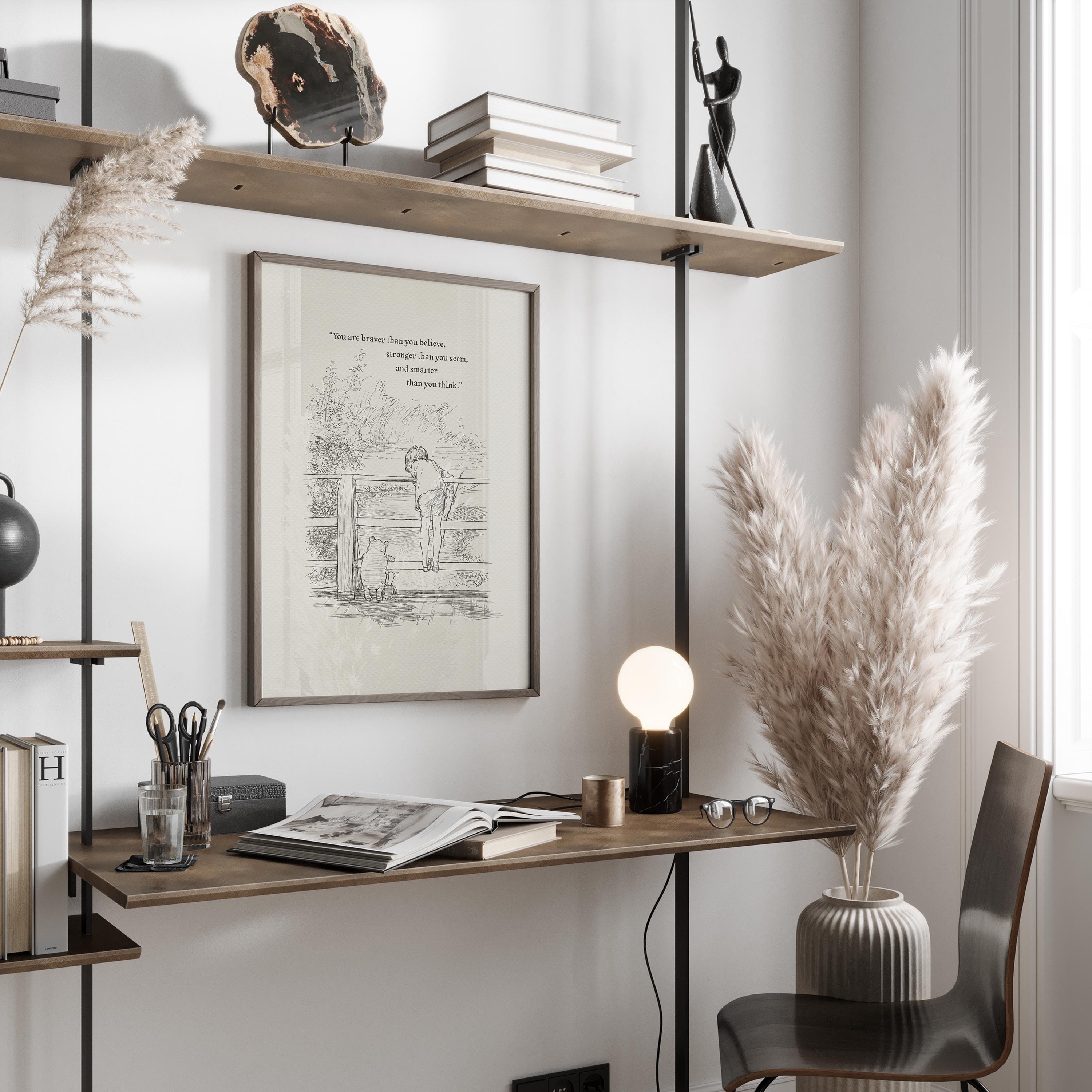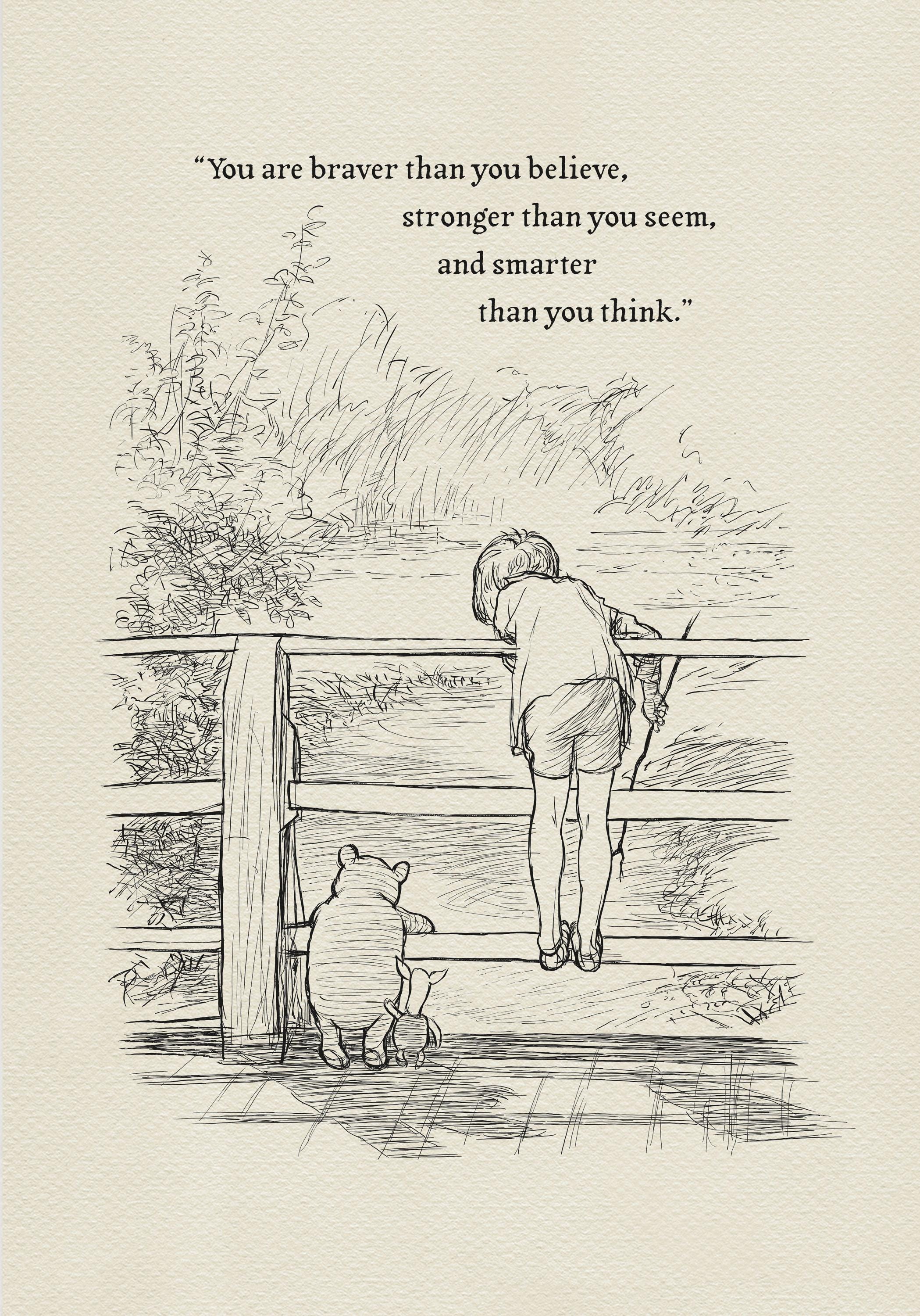Step back in time to the beloved world of Winnie the Pooh with this meticulously crafted vintage-style black-and-white graphic featuring Winnie the Pooh, Christopher Robin, and Piglet on a bridge playing Poohsticks—a timeless scene from A.A. Milne's classic stories. The illustration is accompanied by an inspiring quote by Carter Crocker: “You are braver than you believe, stronger than you seem, and smarter than you think,” reminding us all of our inner strength and resilience.
