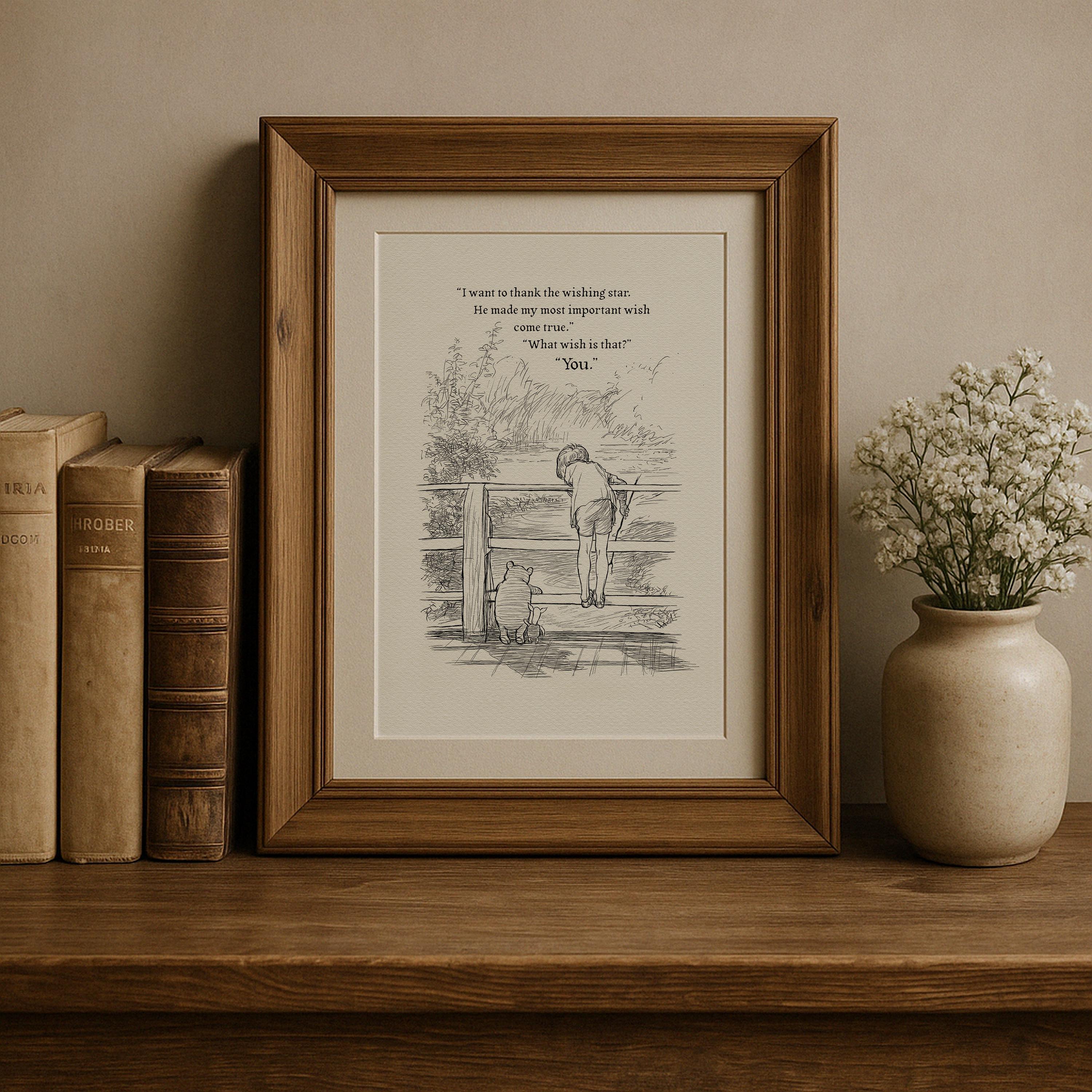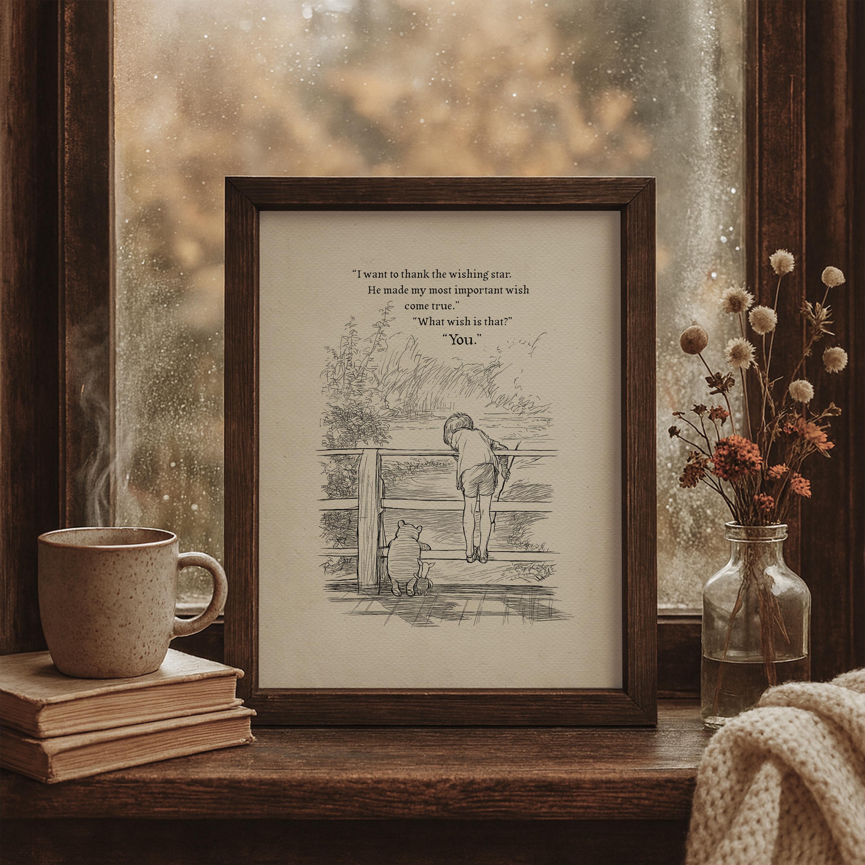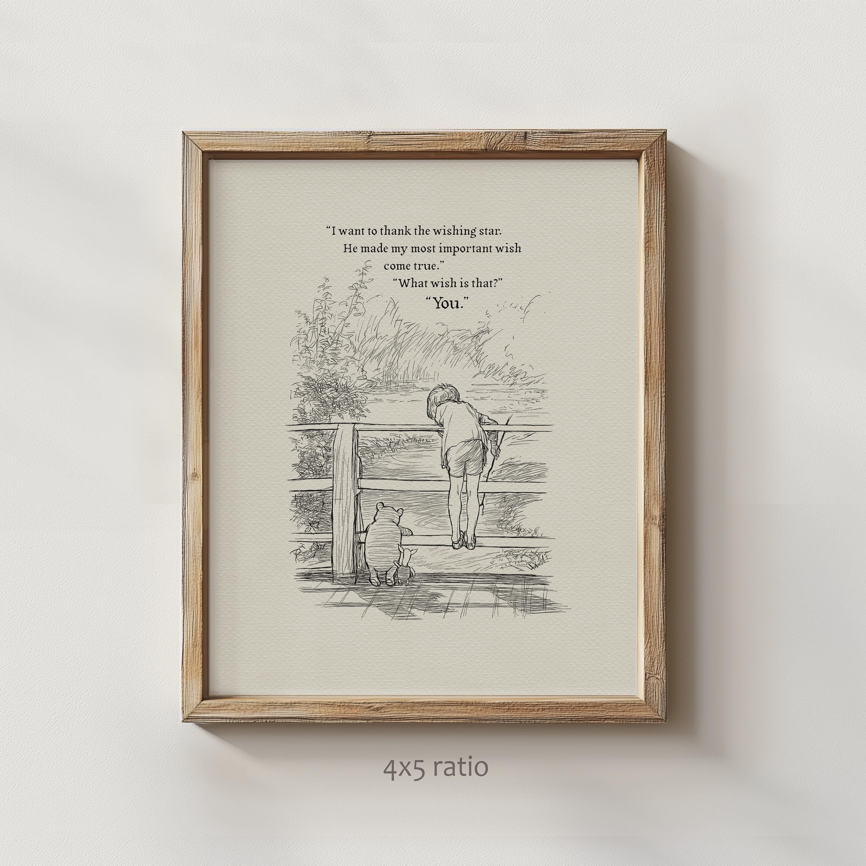 Step back in time to the beloved world of Winnie the Pooh with this meticulously crafted vintage-style black-and-white graphic featuring Winnie the Pooh, Christopher Robin, and Piglet on a bridge playing Poohsticks—a timeless scene from A.A. Milne's classic stories. An added heartfelt quote—"I want to thank the wishing star. He made my most important wish come true..."—enhances the sentimental appeal of this piece, making it a perfect gift or keepsake for Pooh fans and sentimental souls alike.