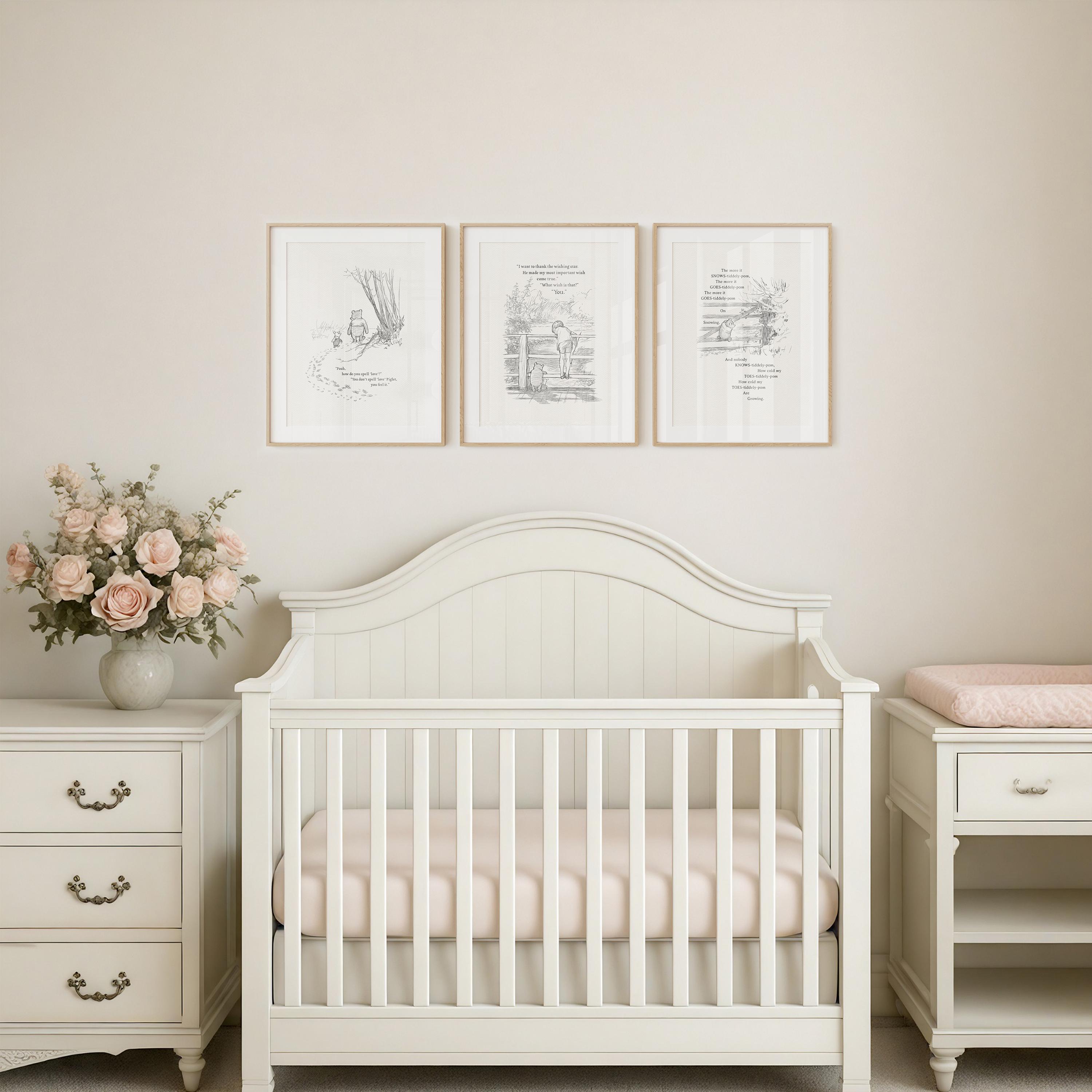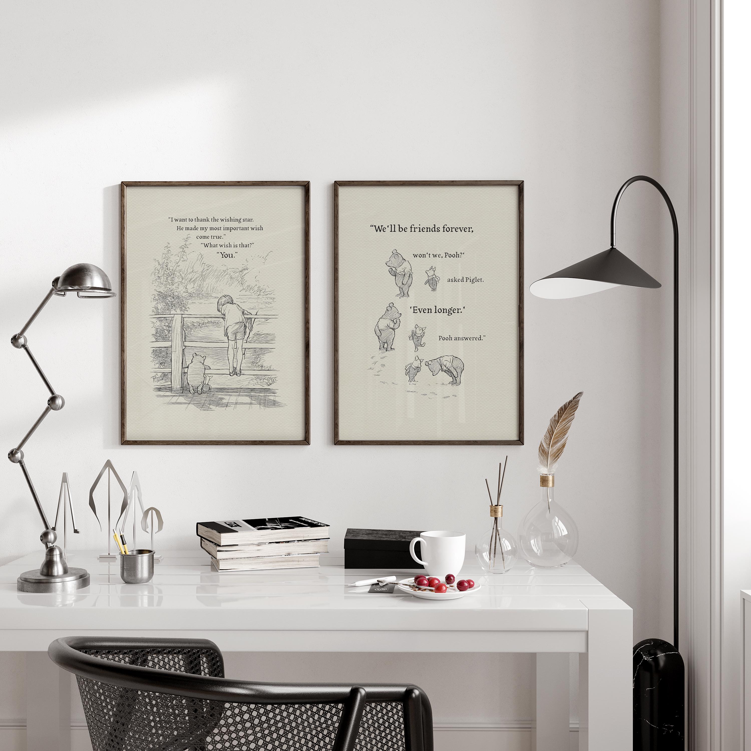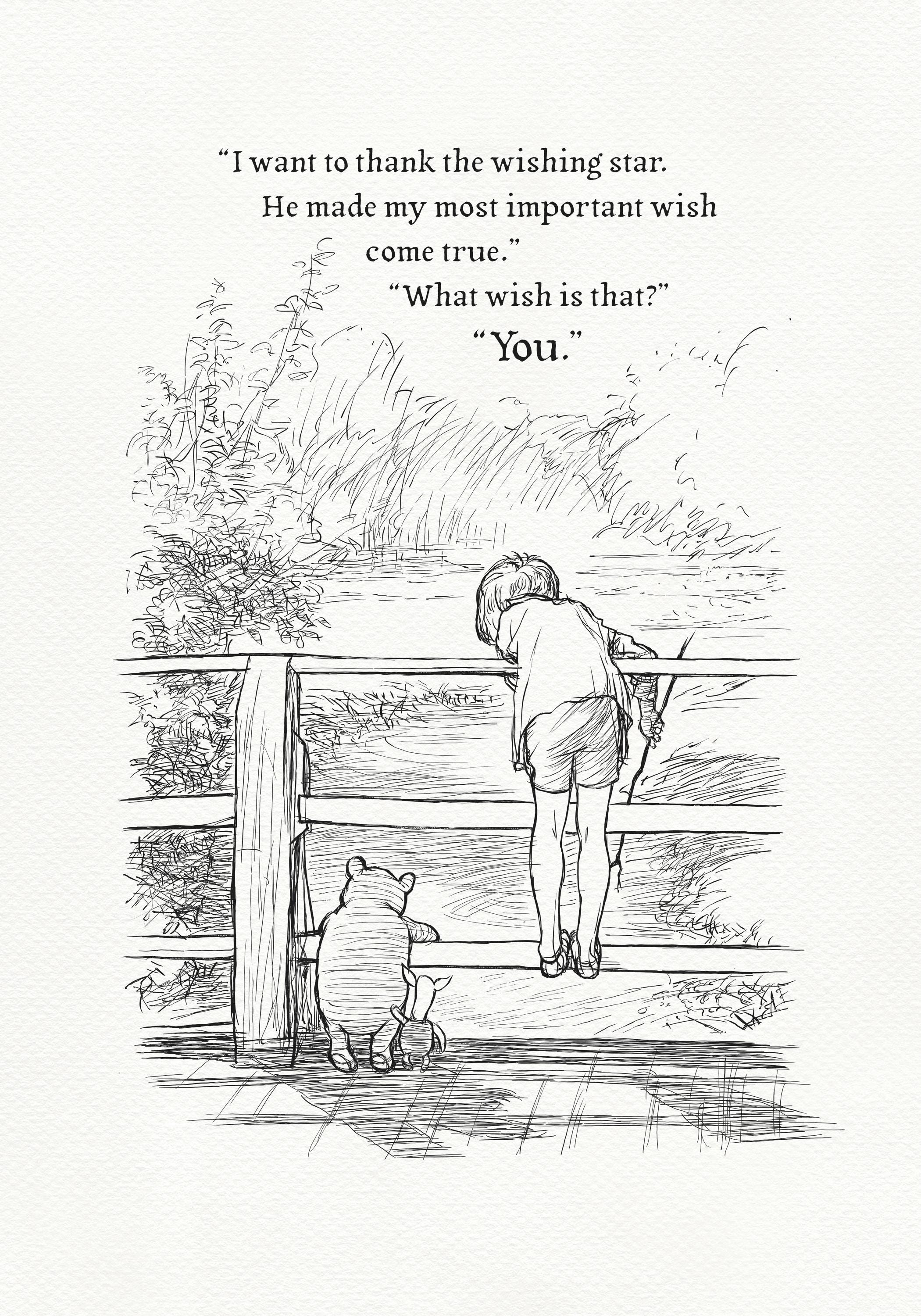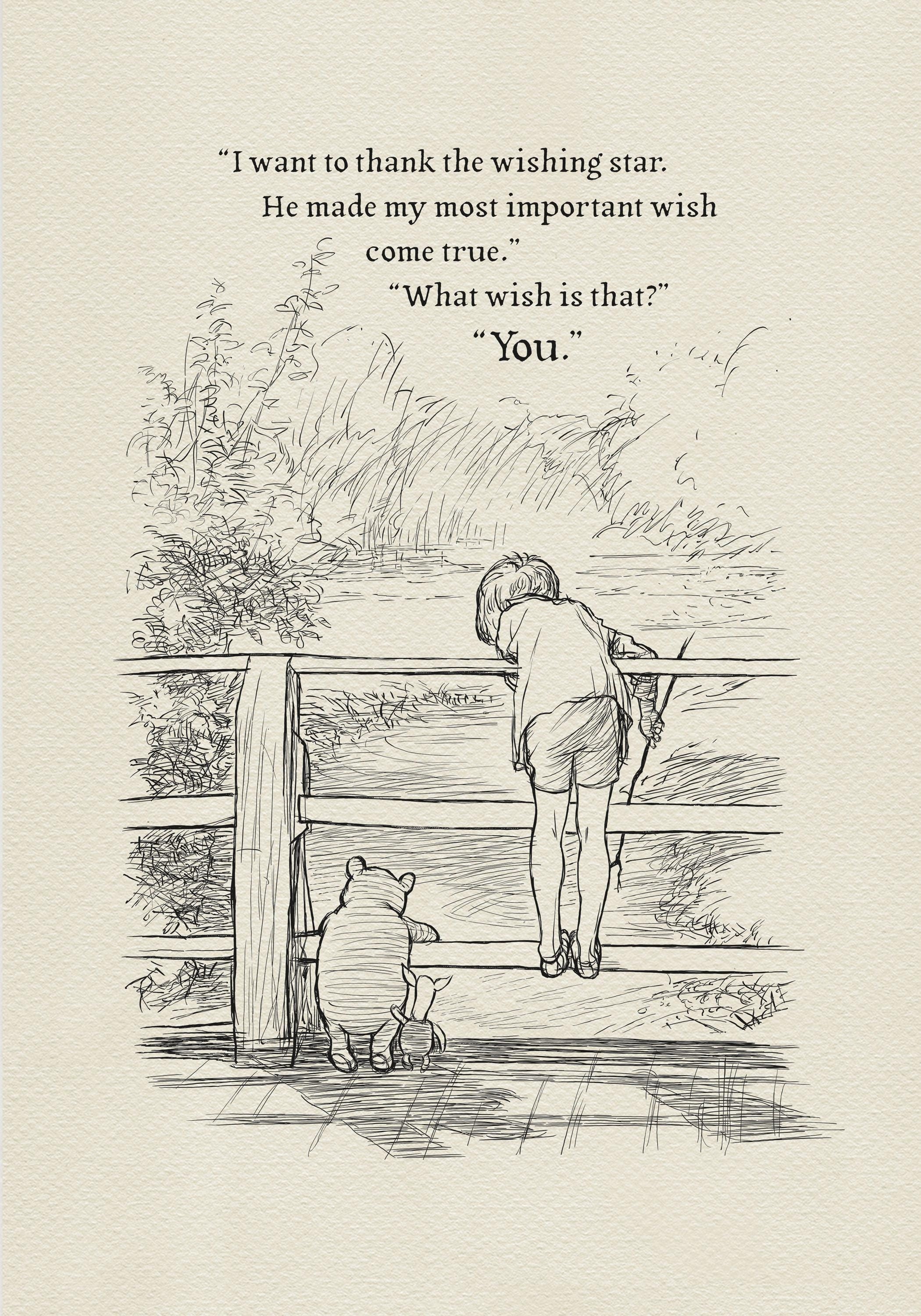 Step back in time to the beloved world of Winnie the Pooh with this meticulously crafted vintage-style black-and-white graphic featuring Winnie the Pooh, Christopher Robin, and Piglet on a bridge playing Poohsticks—a timeless scene from A.A. Milne's classic stories. An added heartfelt quote—"I want to thank the wishing star. He made my most important wish come true..."—enhances the sentimental appeal of this piece, making it a perfect gift or keepsake for Pooh fans and sentimental souls alike.