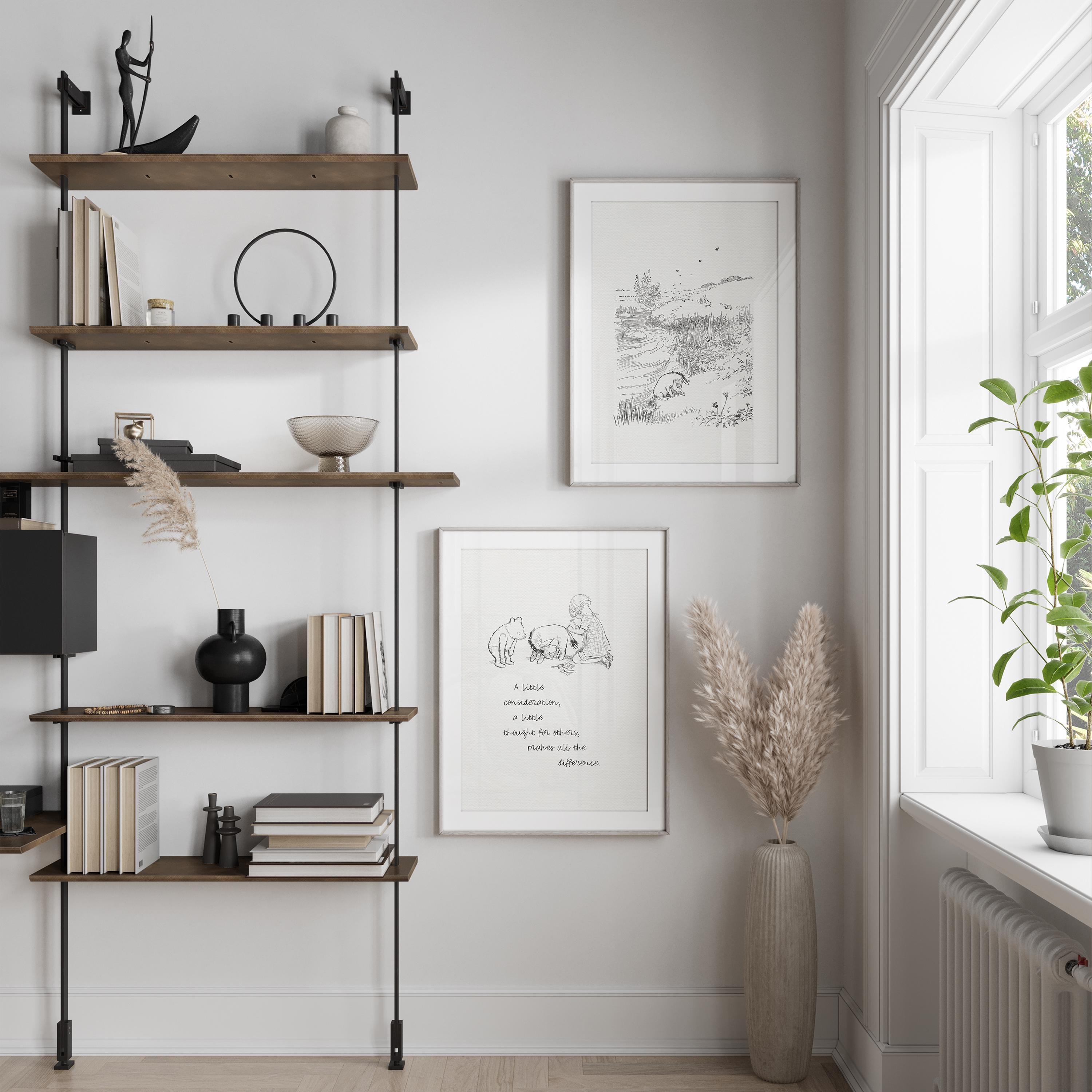 Step back in time to the beloved world of Winnie the Pooh with this meticulously crafted vintage-style black-and-white graphic depicting the moment "in which Eeyore loses a tail and Pooh finds one" —a timeless scene from A.A. Milne's classic stories. The print is enhanced with an inspiring quote: “A little consideration, a little thought for others, makes all the difference.” This heartwarming message makes this print not only a charming decoration, but also a reminder of mutual empathy, trust, and support.