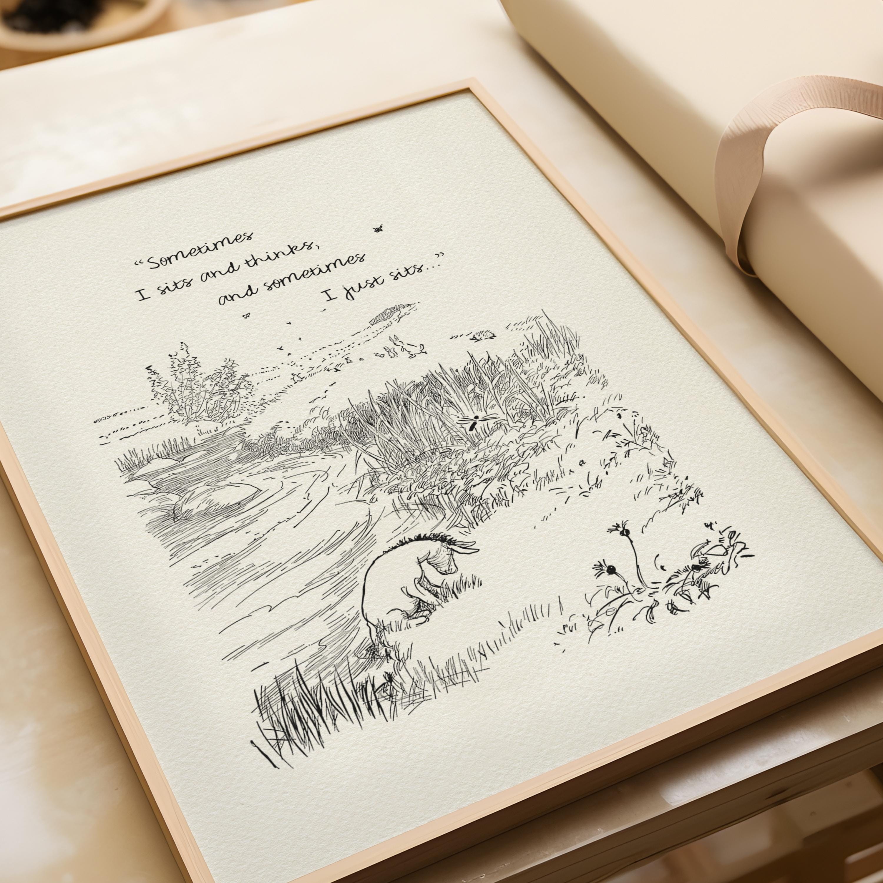 Step back in time to the beloved world of Winnie the Pooh with this meticulously crafted vintage-style black-and-white graphic. The illustration comes from the chapter "In Which Christopher Robin Leads an Expotition to the North Pole" and Eeyore tries to rescue the swimming Roo. The inspiring quote, "Sometimes I sit and think, and sometimes I just sit...", is a subtle reminder to enjoy moments of peace and quiet.