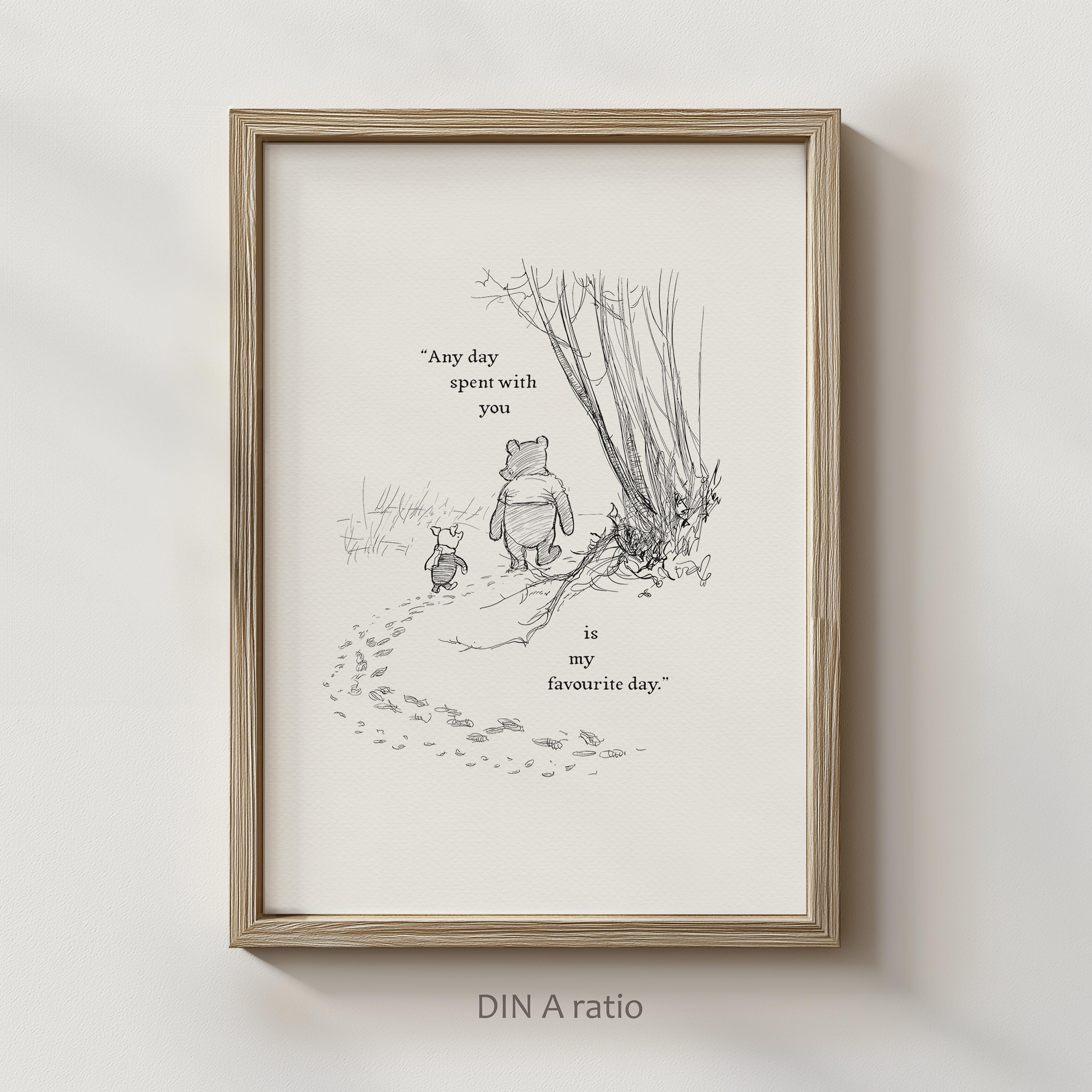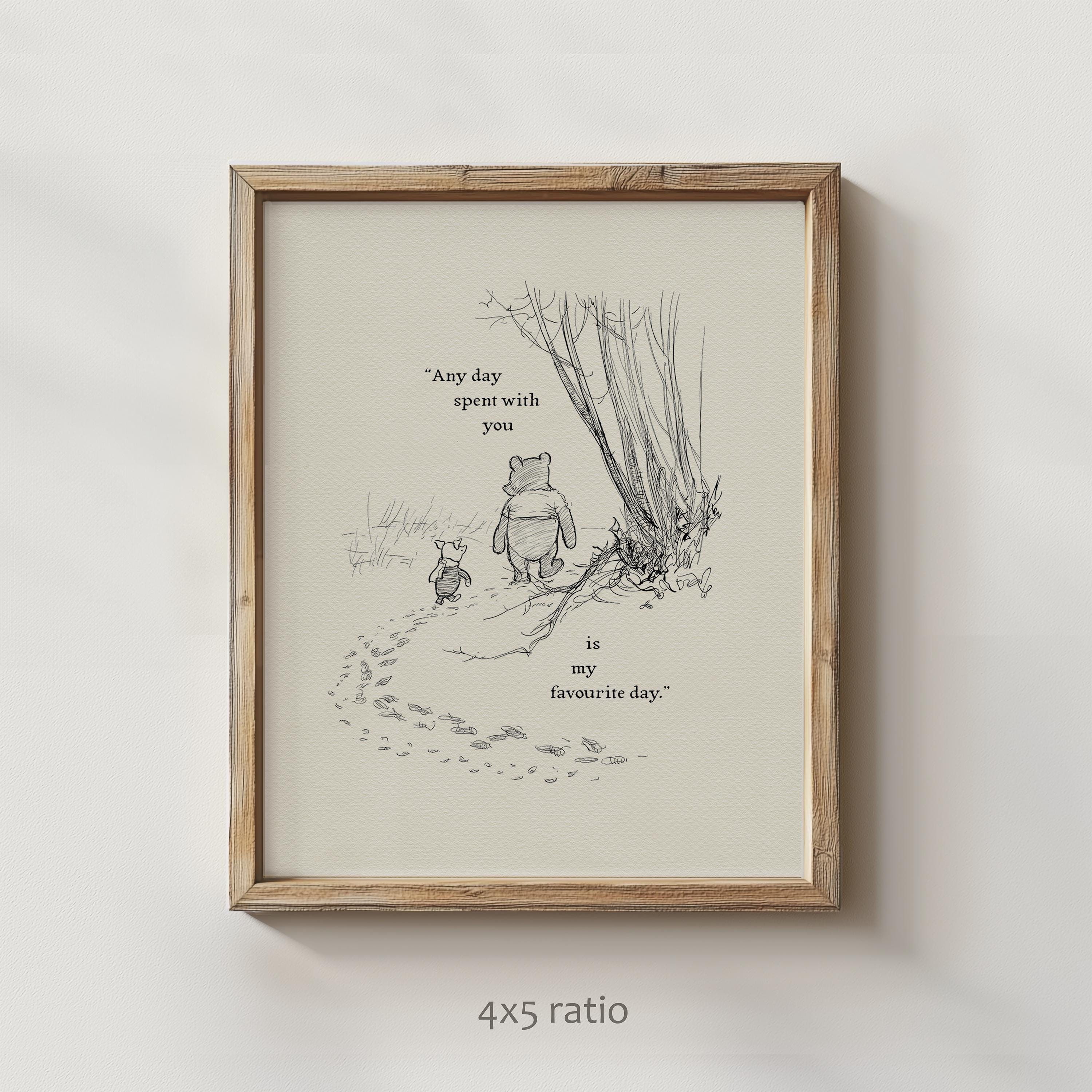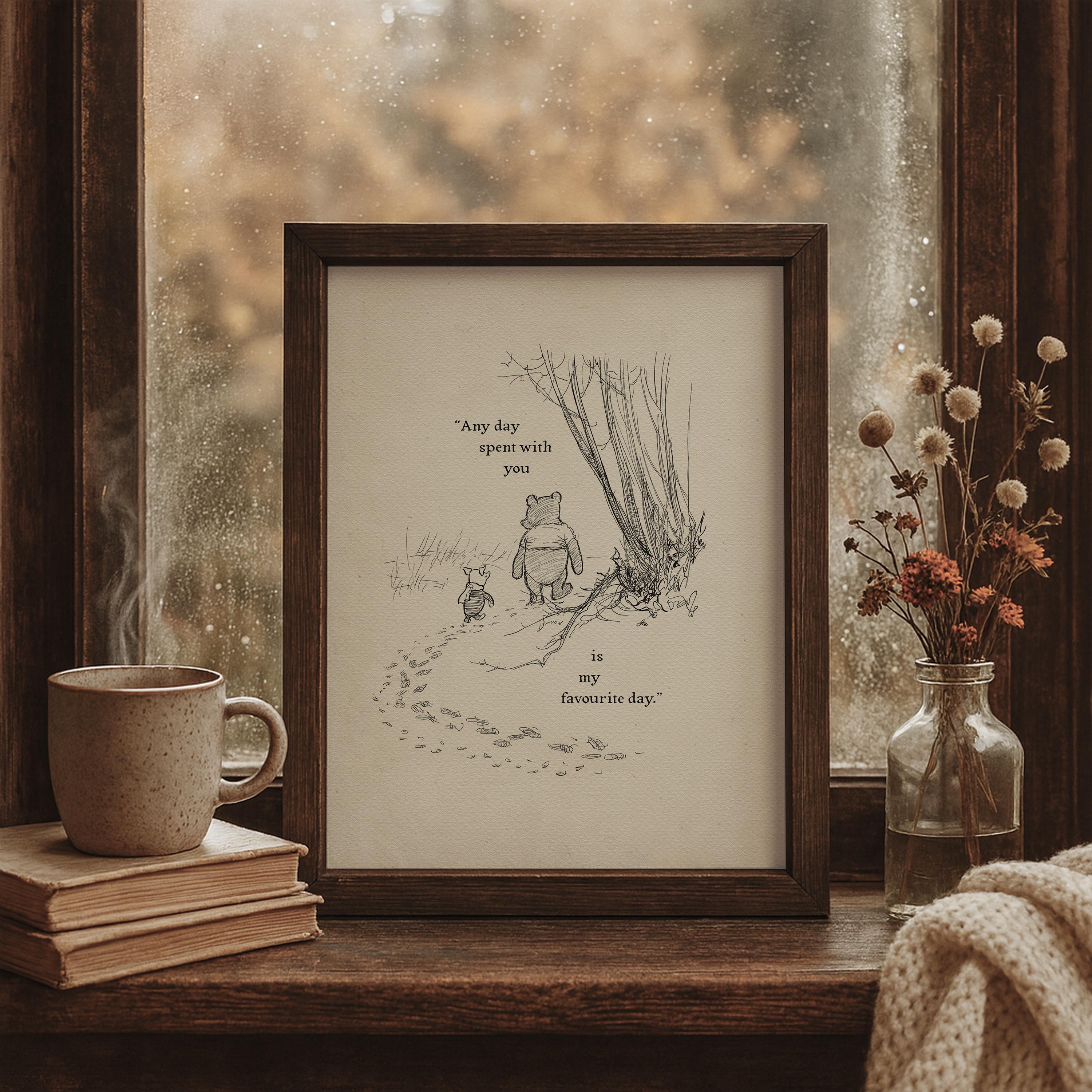 Step back in time to the beloved world of Winnie the Pooh with this meticulously crafted vintage-style black-and-white graphic featuring two inseparable friends walking arm in arm through the wintery Hundred Acre Wood—a timeless scene “in which Pooh and Piglet go hunting and nearly catch a Woozle.” Complemented by the quote, "Any day spent with you is my favourite day. So today is my new favourite day," this print captures the warmth, nostalgia, and innocence of childhood friendships.