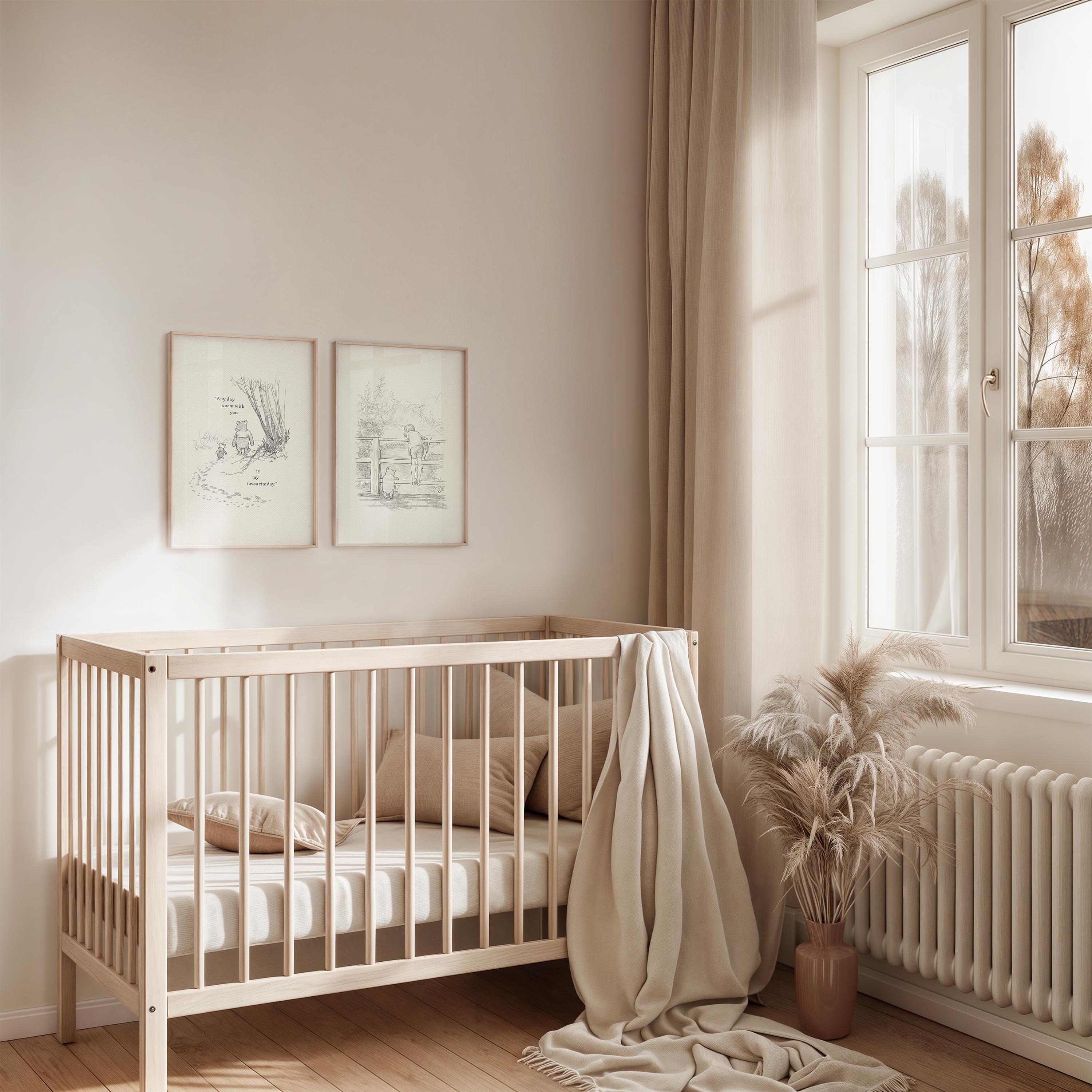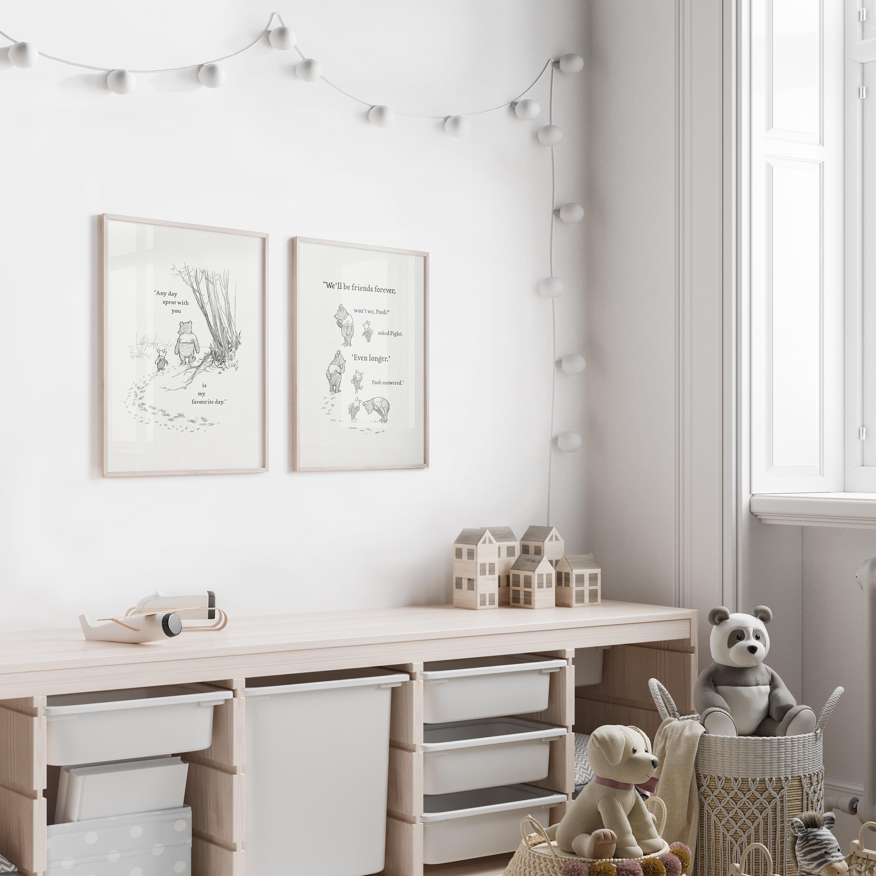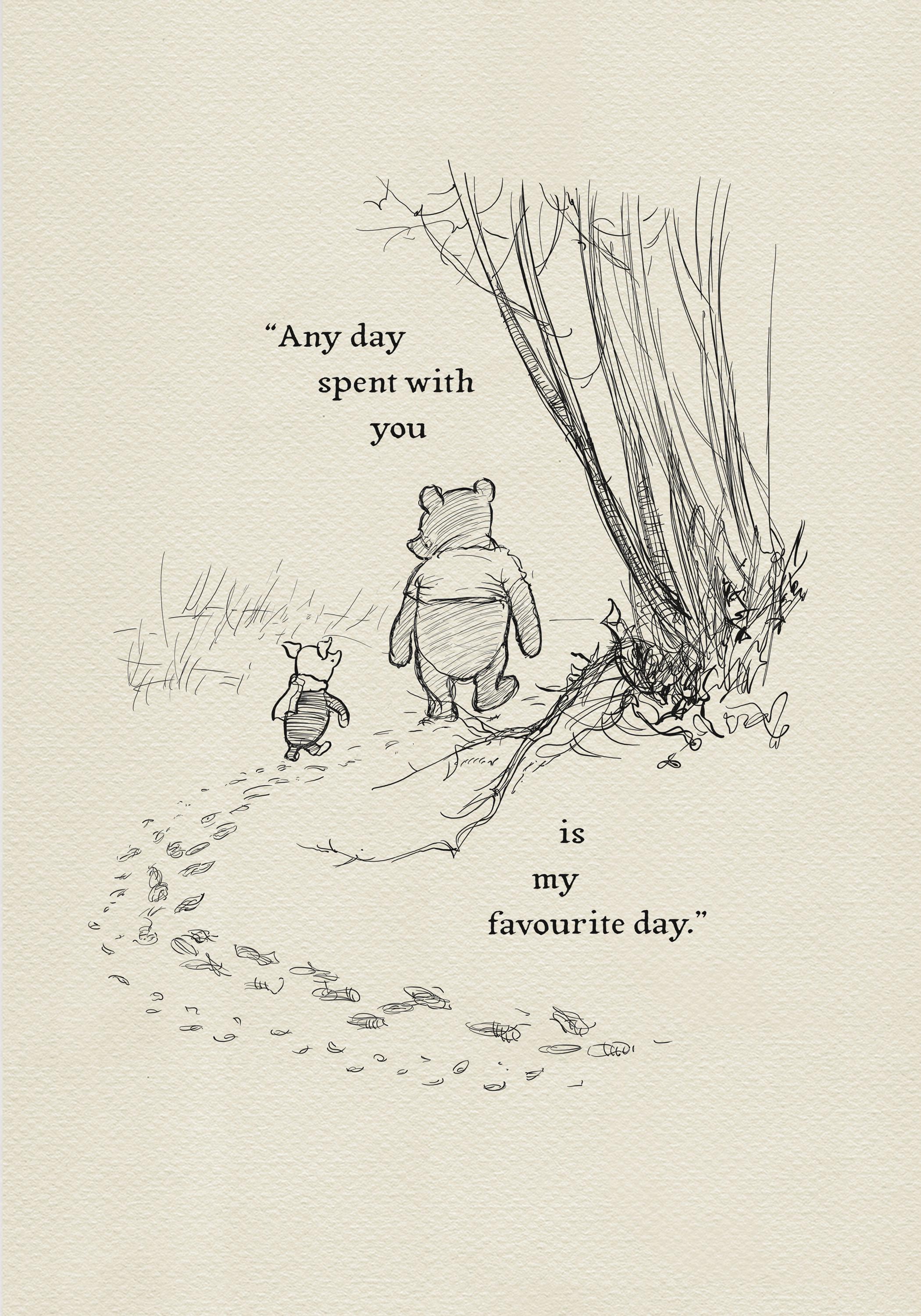 Step back in time to the beloved world of Winnie the Pooh with this meticulously crafted vintage-style black-and-white graphic featuring two inseparable friends walking arm in arm through the wintery Hundred Acre Wood—a timeless scene “in which Pooh and Piglet go hunting and nearly catch a Woozle.” Complemented by the quote, "Any day spent with you is my favourite day. So today is my new favourite day," this print captures the warmth, nostalgia, and innocence of childhood friendships.