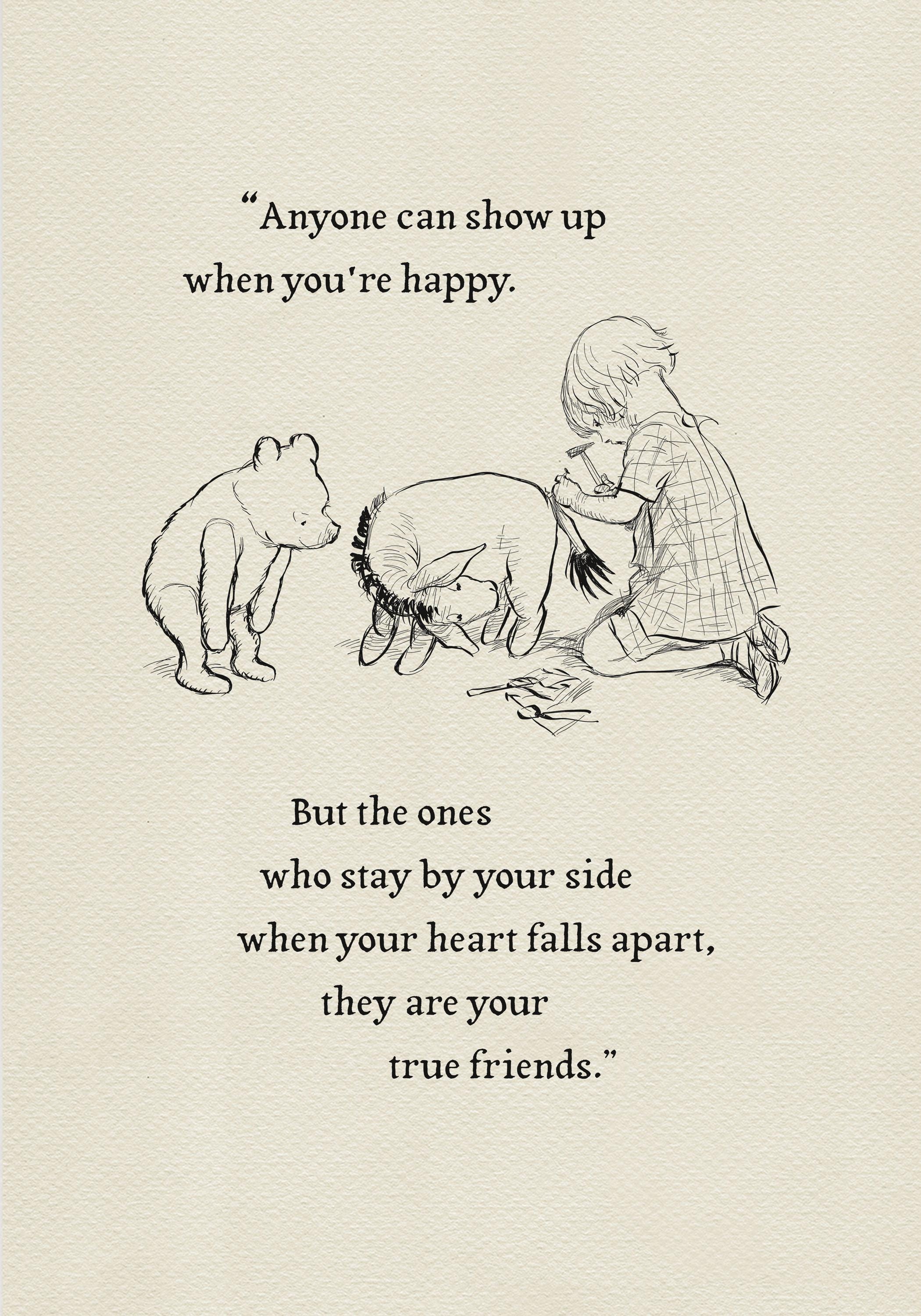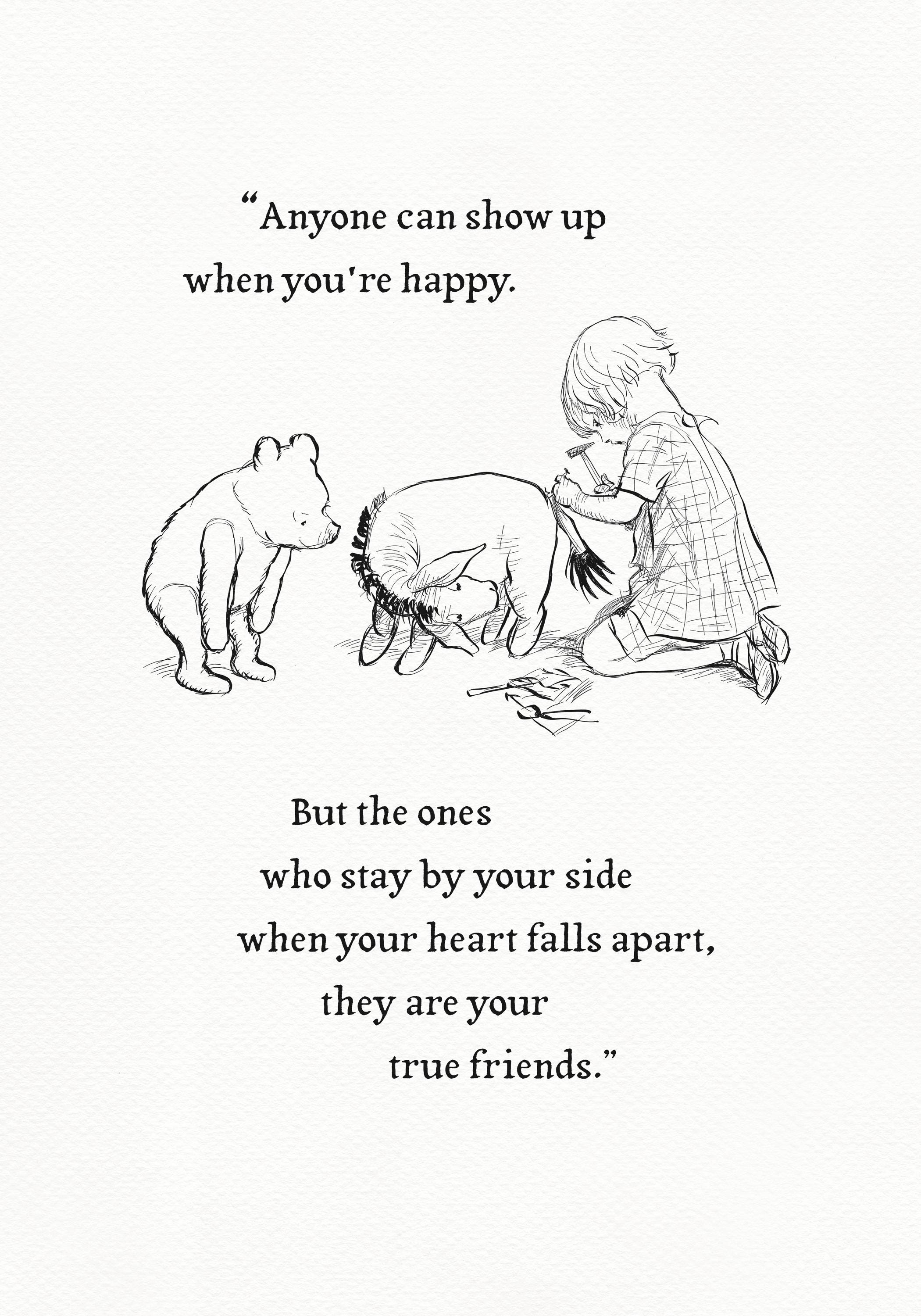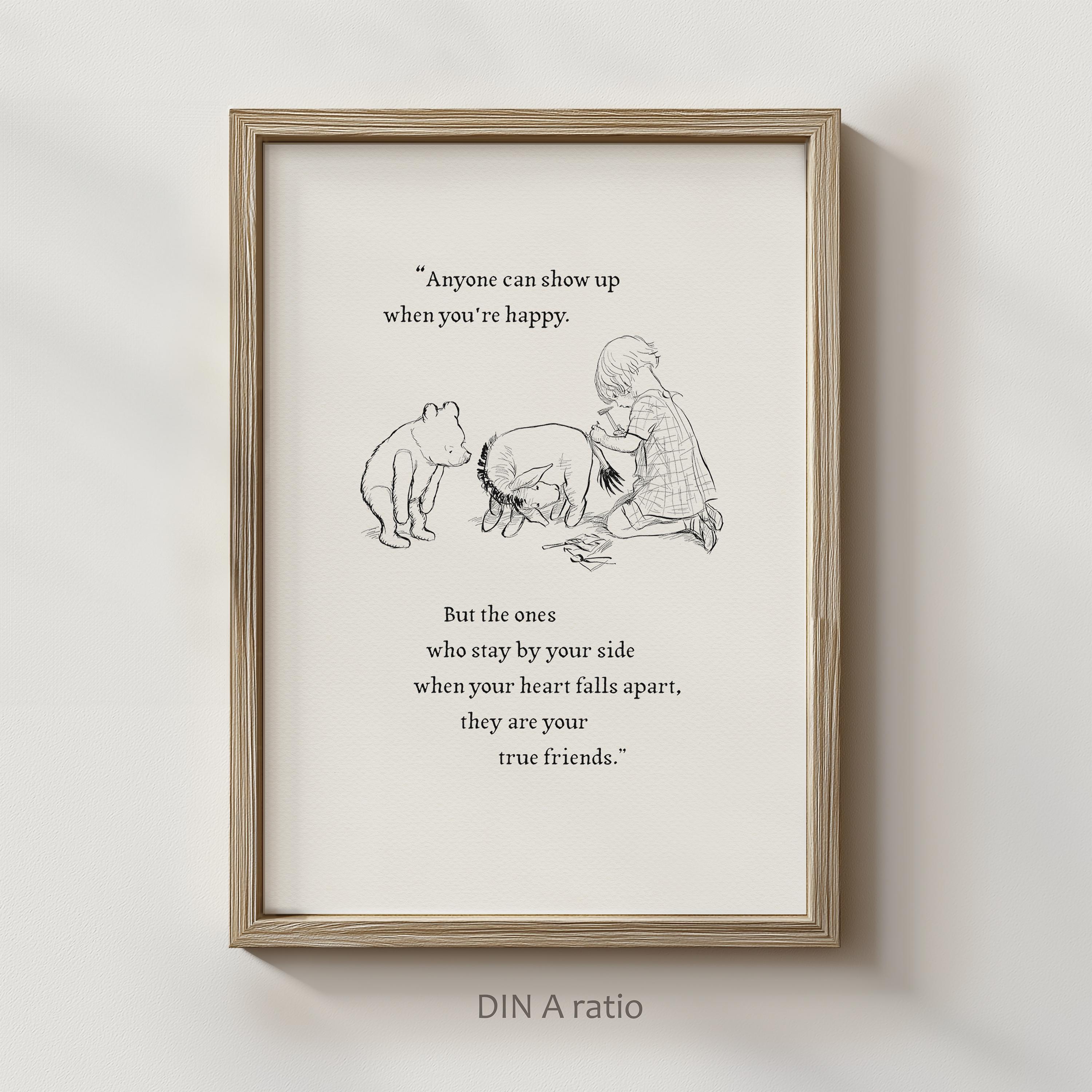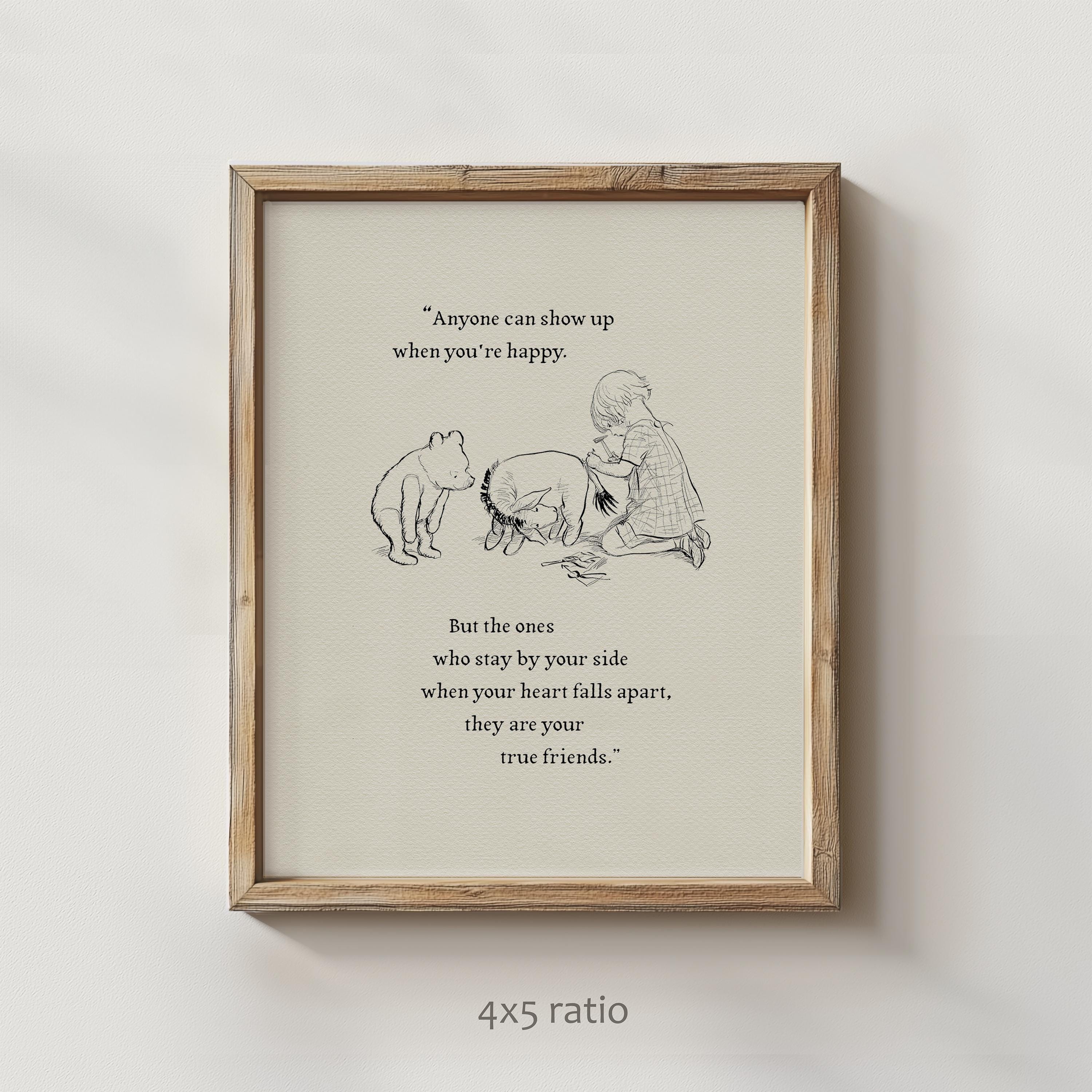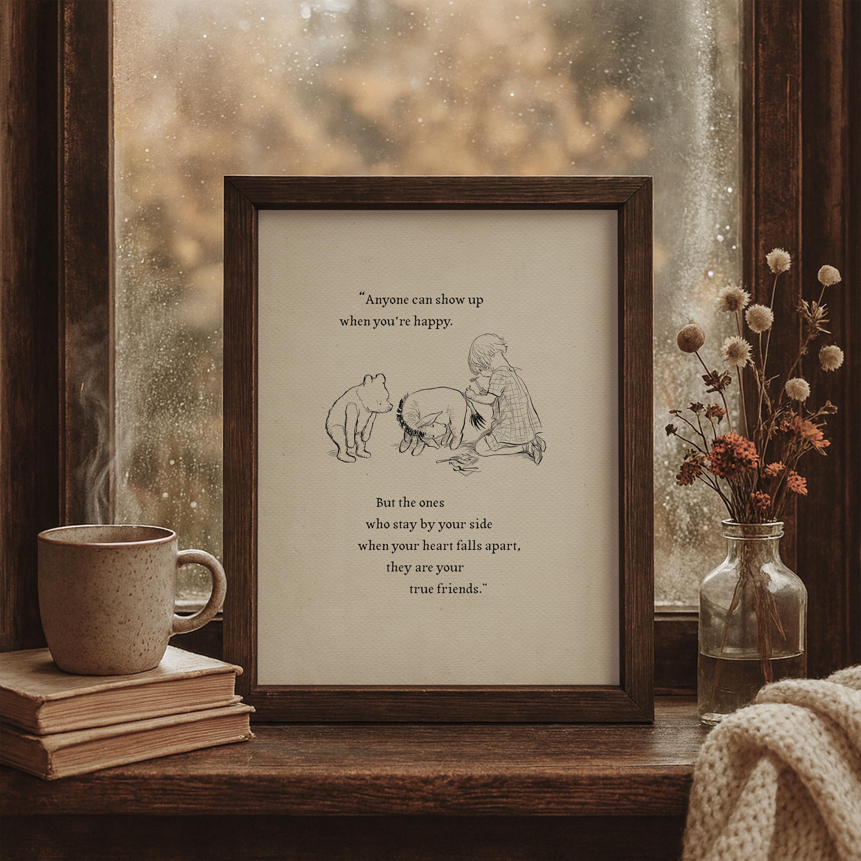 Step back in time to the beloved world of Winnie the Pooh with this meticulously crafted vintage-style black-and-white graphic depicting the moment "in which Eeyore loses a tail and Pooh finds one" —a timeless scene from A.A. Milne's classic stories. The artwork is enhanced by a meaningful quote: "Anyone can show up when you're happy. But the ones who stay by your side when your heart falls apart, they are your true friends." This touching message makes this print not only a charming decoration but also a reminder of enduring friendship and support.