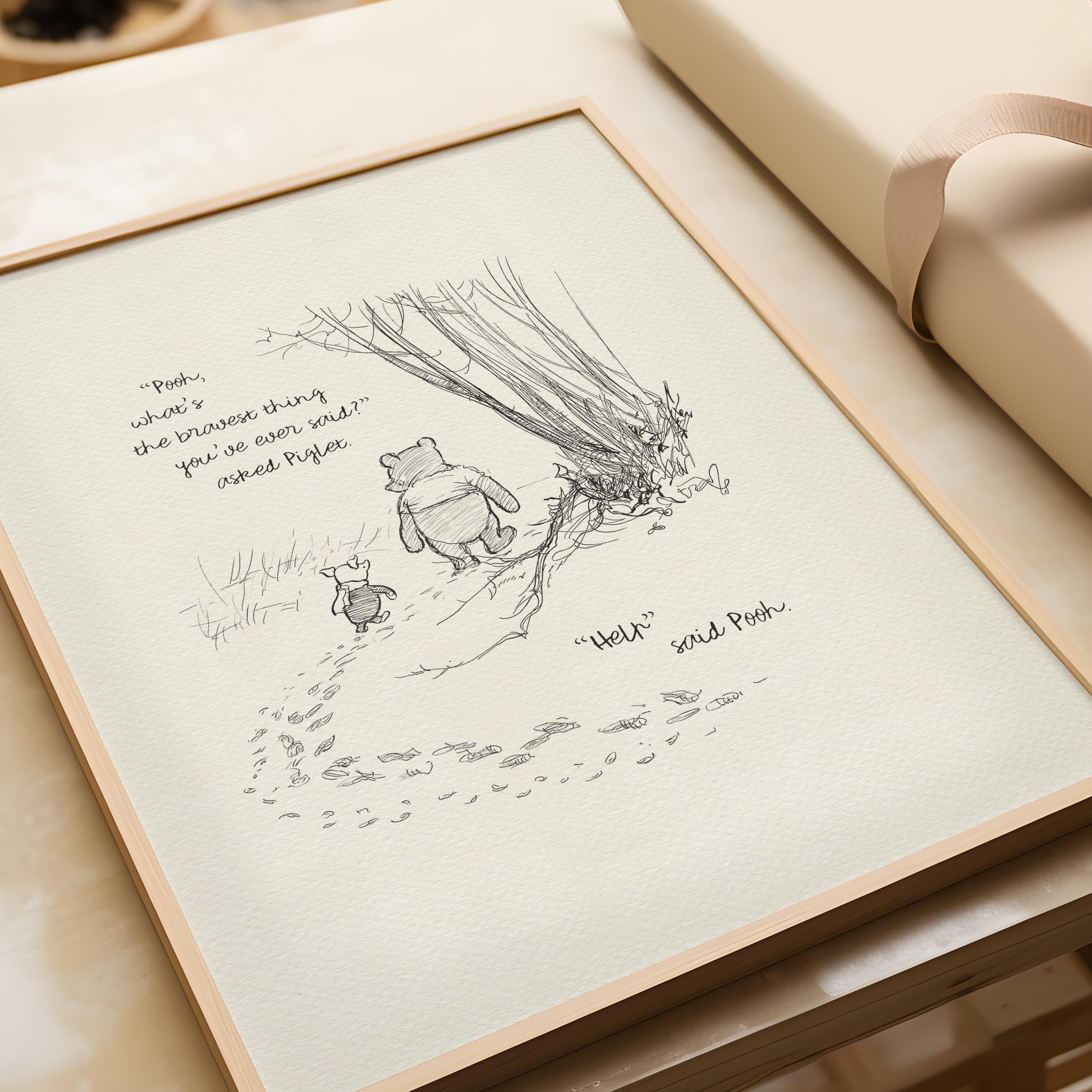 Step back in time to the beloved world of Winnie the Pooh with this meticulously crafted vintage-style black-and-white graphic featuring two inseparable friends walking arm in arm through the wintery Hundred Acre Wood—captured in the moment of conversation—Piglet asking, “Pooh, what’s the bravest thing you’ve ever said?” and Pooh’s heartfelt reply, “Help.” Behind them, delicate footprints in the snow tell a story of friendship and adventure, adding depth and warmth to this beautifully detailed illustration.