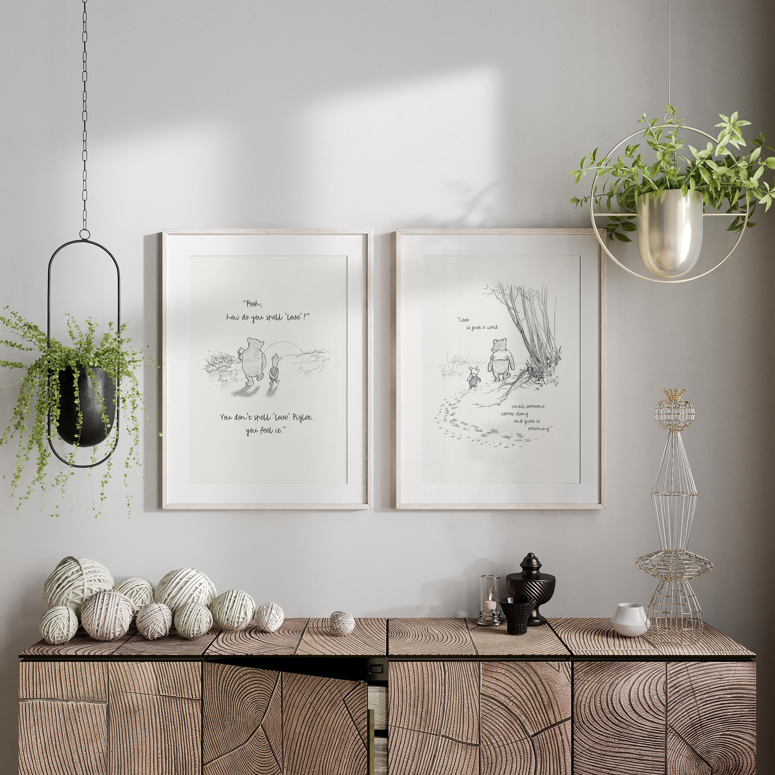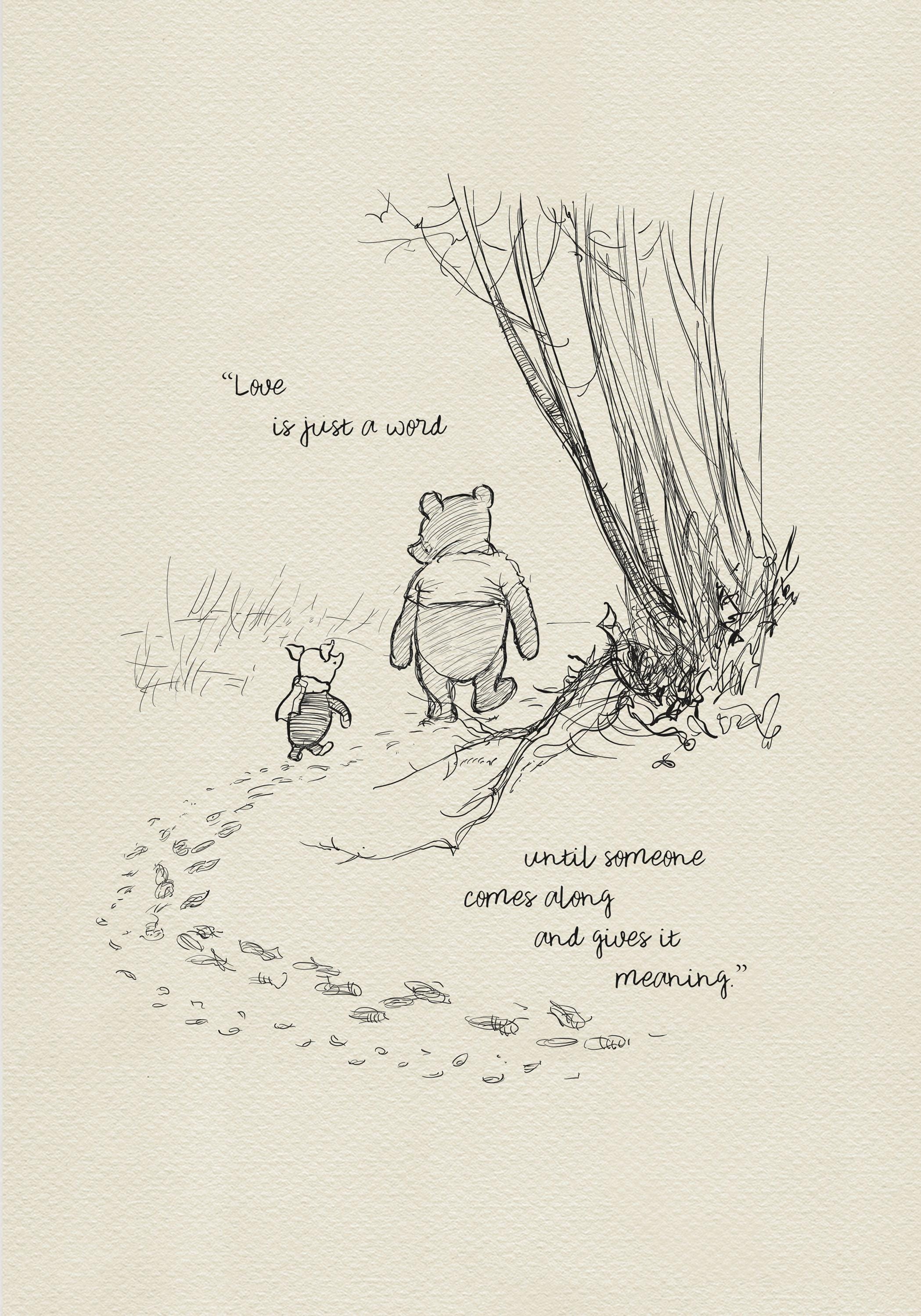 Step back in time to the beloved world of Winnie the Pooh with this meticulously crafted vintage-style black-and-white graphic featuring two inseparable friends walking arm in arm through the wintery Hundred Acre Wood—a timeless scene “in which Pooh and Piglet go hunting and nearly catch a Woozle.” Enhanced with a poignant quote—"Love is just a word until someone comes along and gives it meaning."—this print not only captures this famous scene but also celebrates the enduring power of love and friendship.