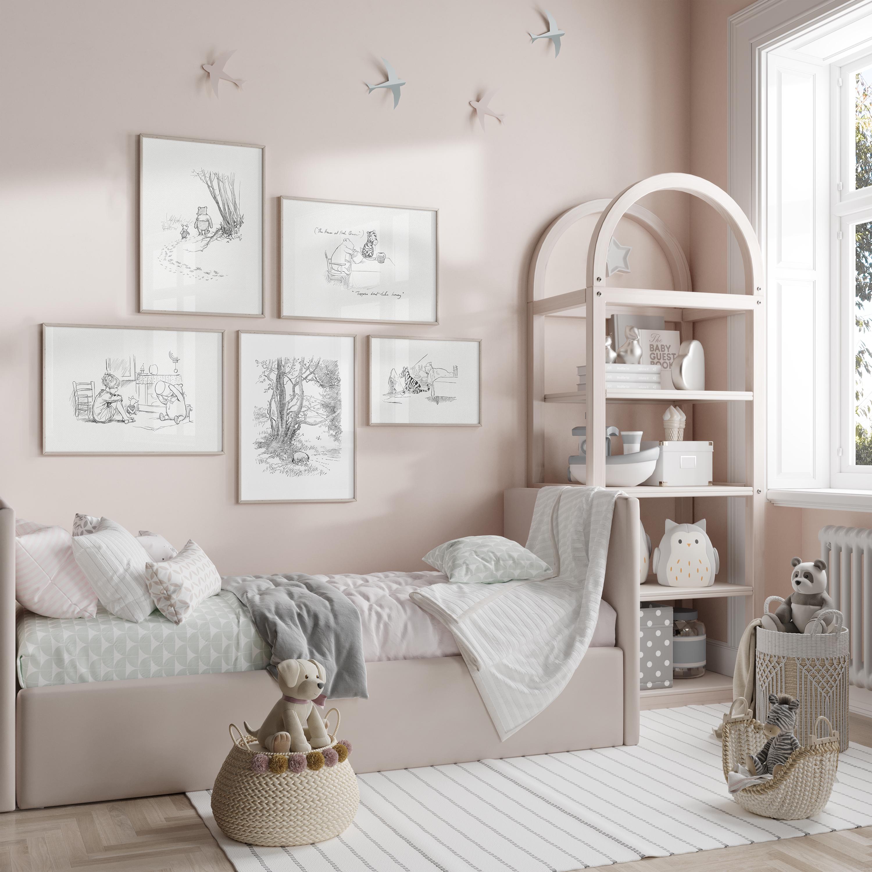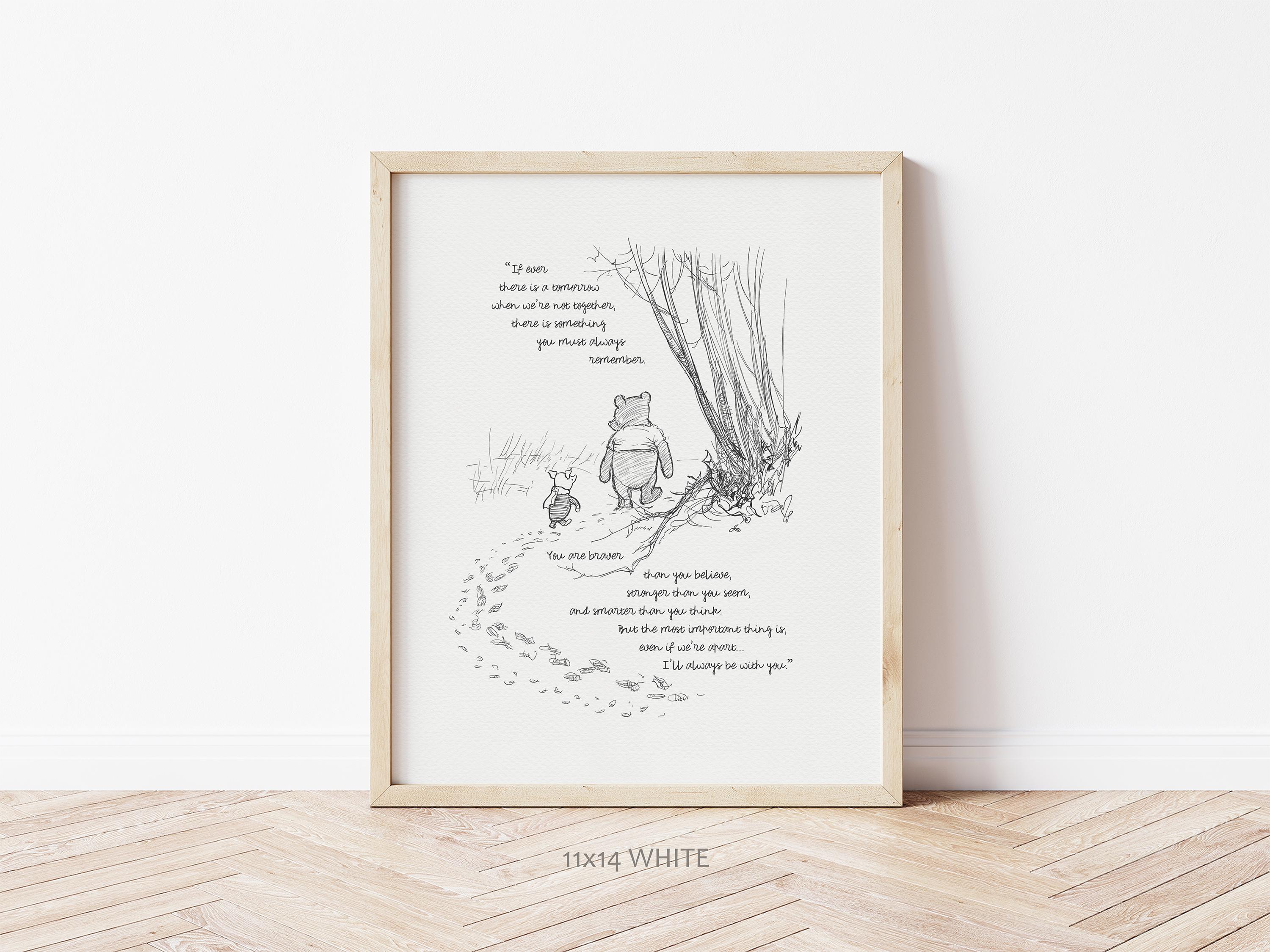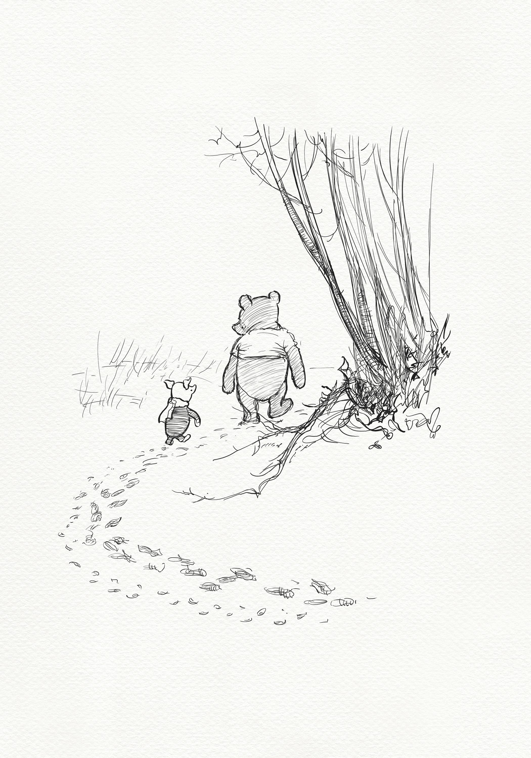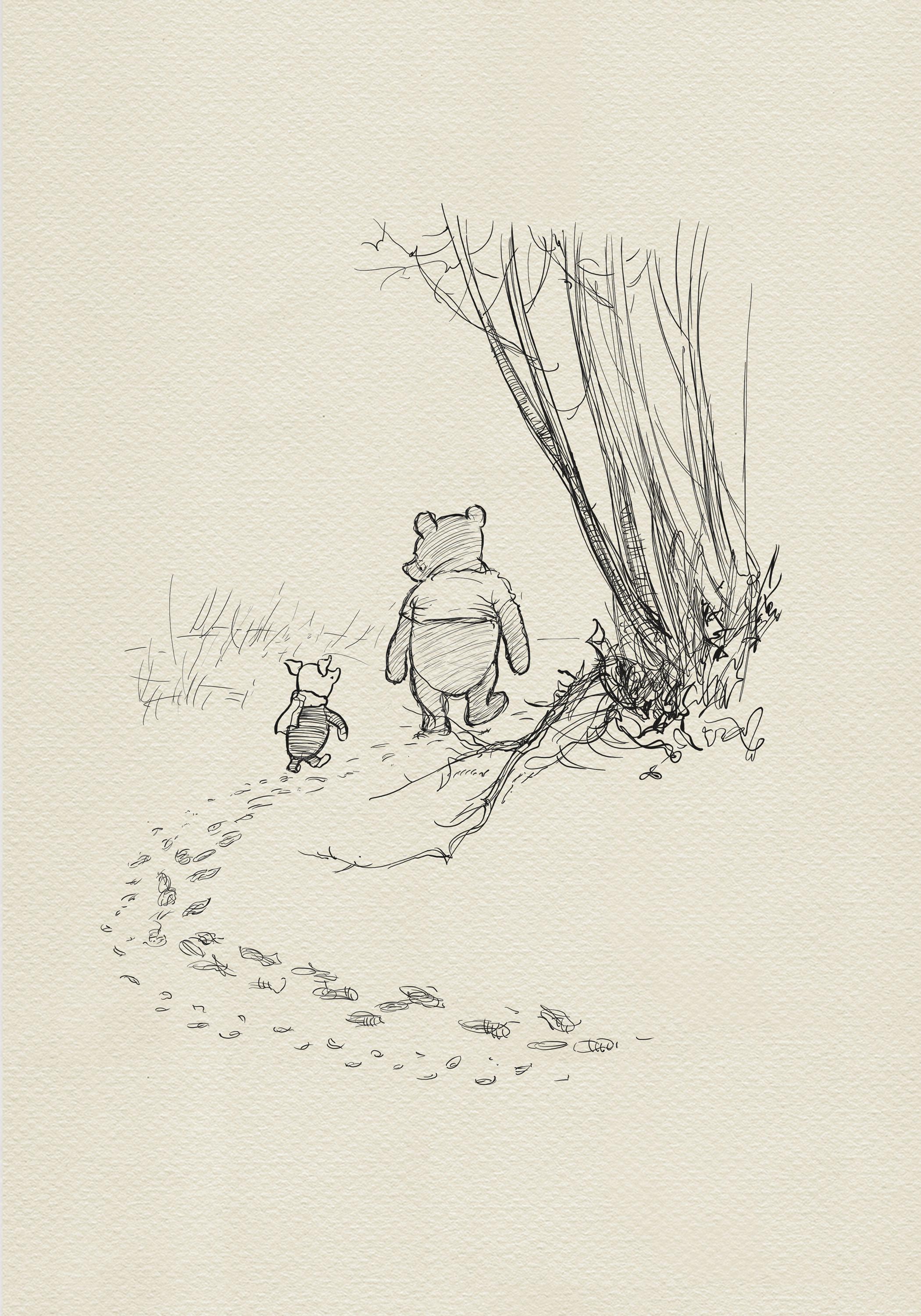 Step back in time to the beloved world of Winnie the Pooh with this meticulously crafted vintage-style black-and-white graphic featuring two inseparable friends walking arm in arm through the wintery Hundred Acre Wood—a timeless scene “in which Pooh and Piglet go hunting and nearly catch a Woozle.” The illustration is a precisely crafted adaptation based on E.H. Shepard's original sketches, redrawn by hand to preserve every gentle detail and nuance, ensuring an authentic and nostalgic feel that will evoke fond memories for both children and adults alike.