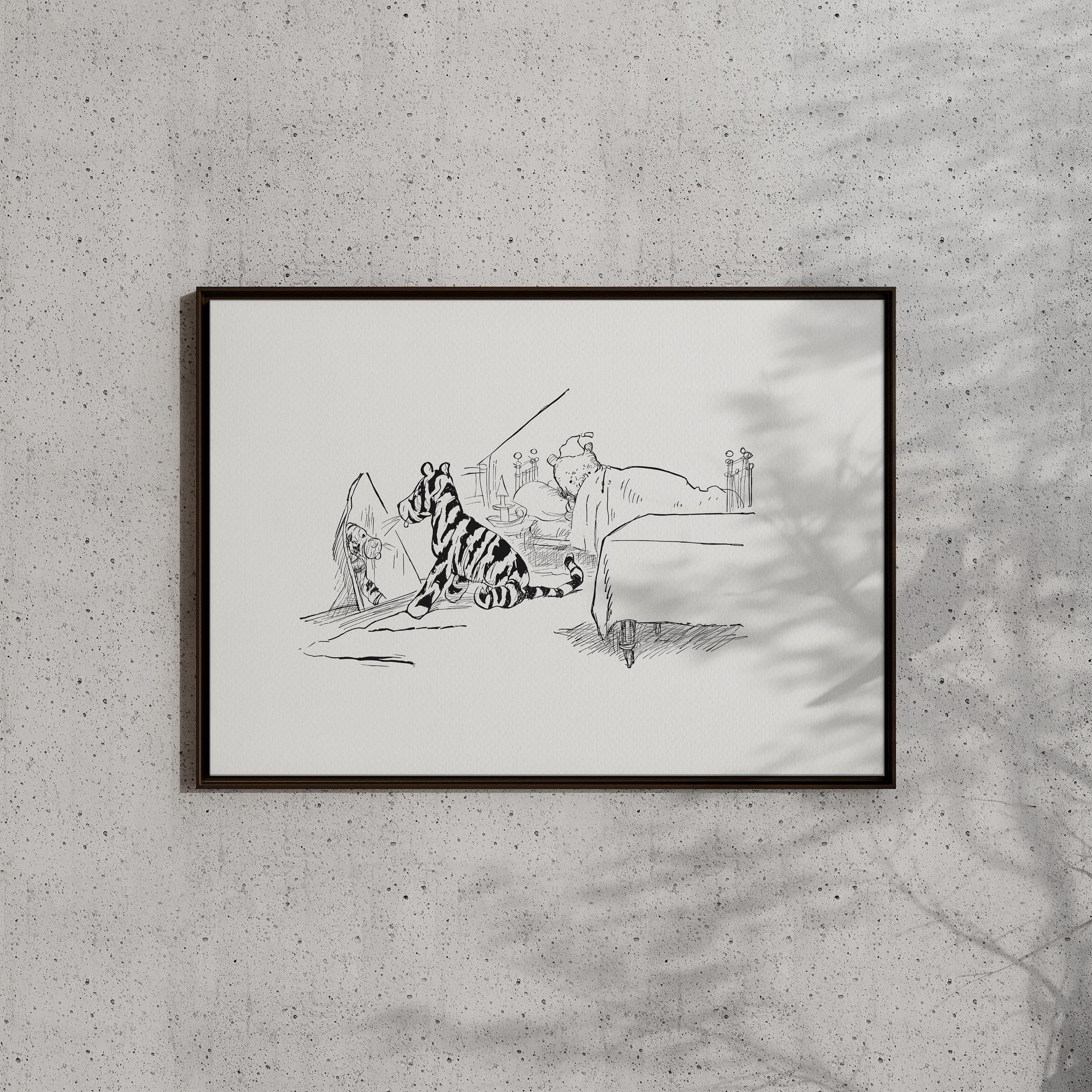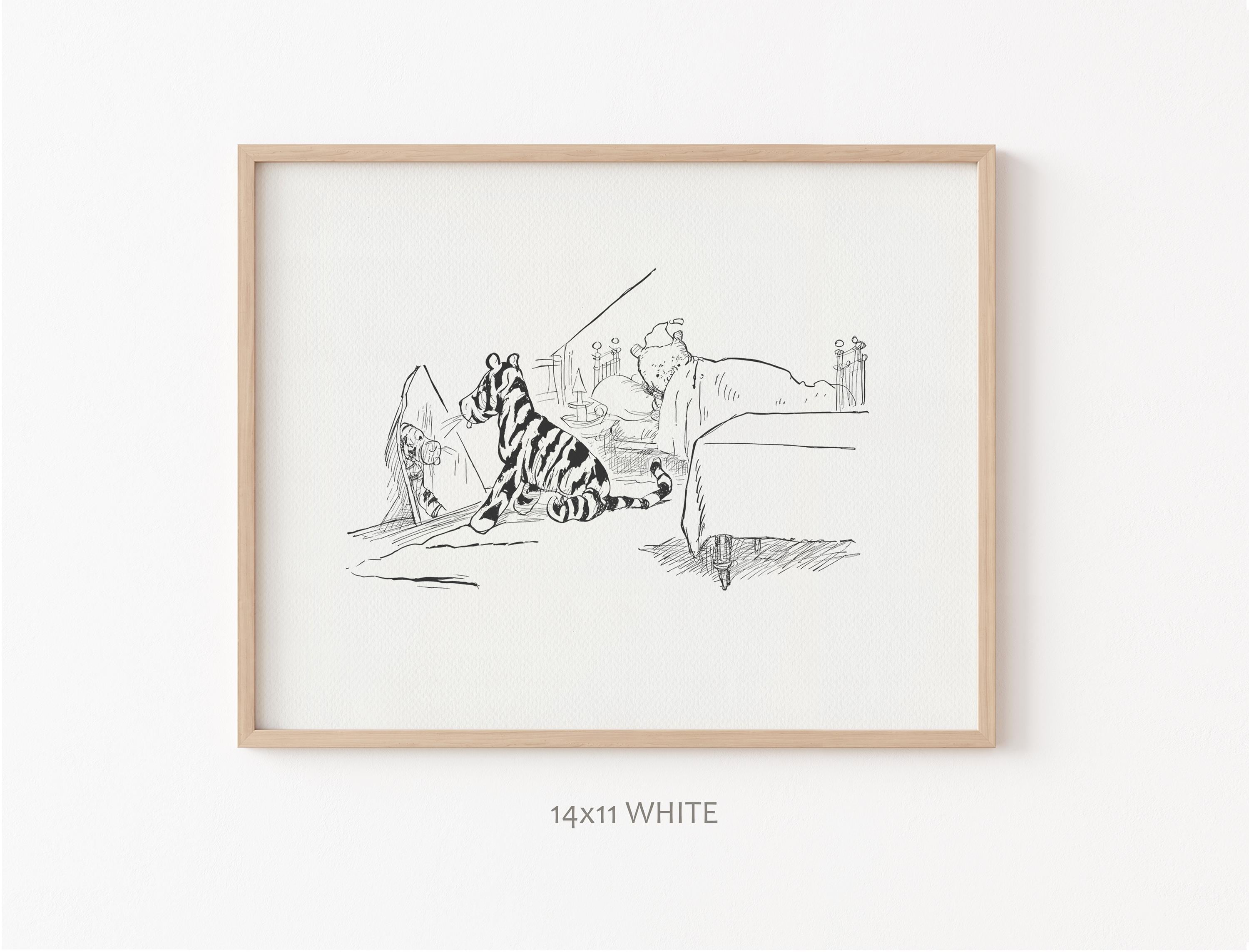 Step back in time to the beloved world of Winnie the Pooh with this meticulously crafted vintage-style black-and-white graphic depicting the moment "in which Tigger comes to the forest and has breakfast" —a timeless scene from A.A. Milne's classic stories. This print is a precisely crafted adaptation of E.H. Shepard's book illustration, redrawn by hand to preserve every delicate detail and nuance, ensuring an authentic and nostalgic feel that will bring back fond memories for children and adults alike.