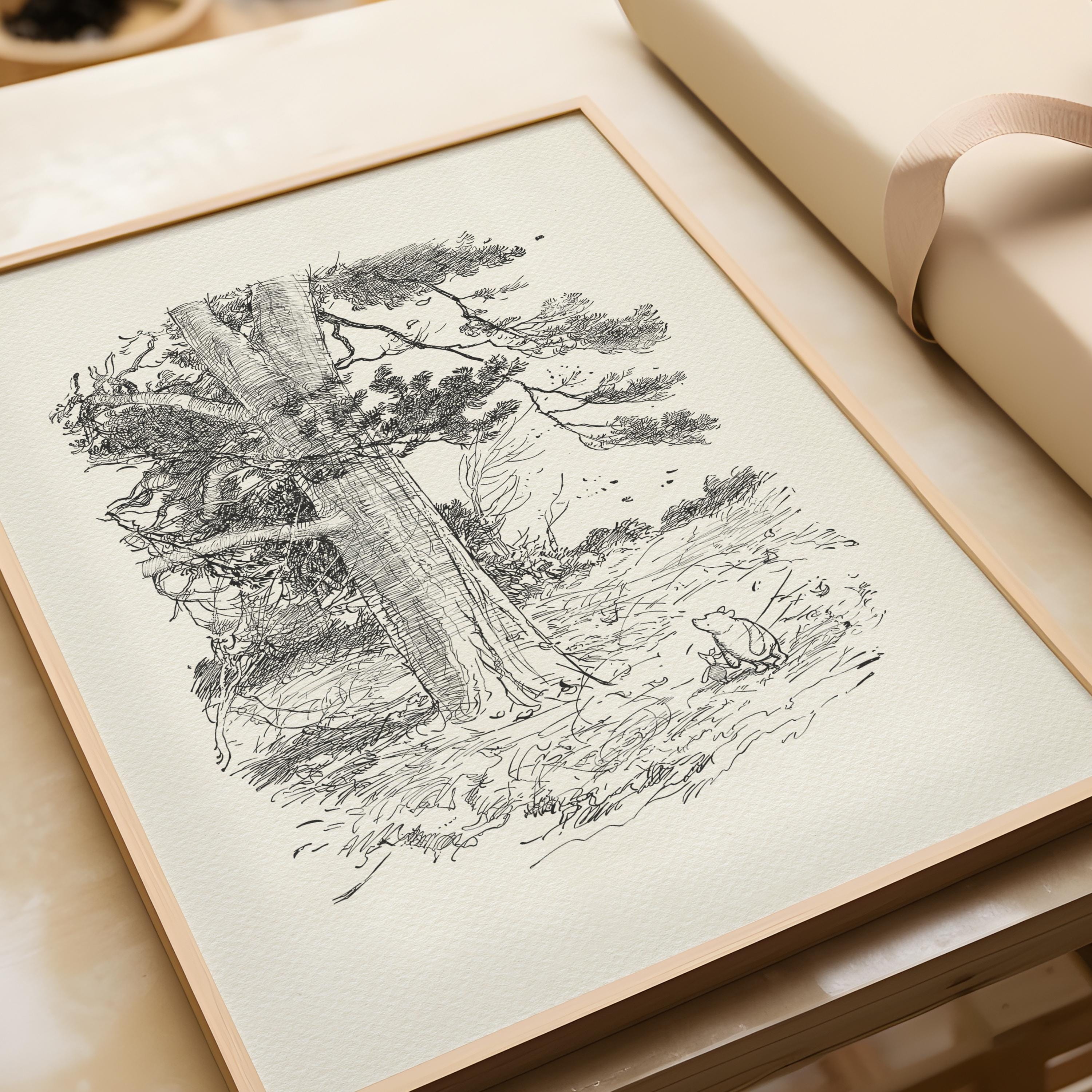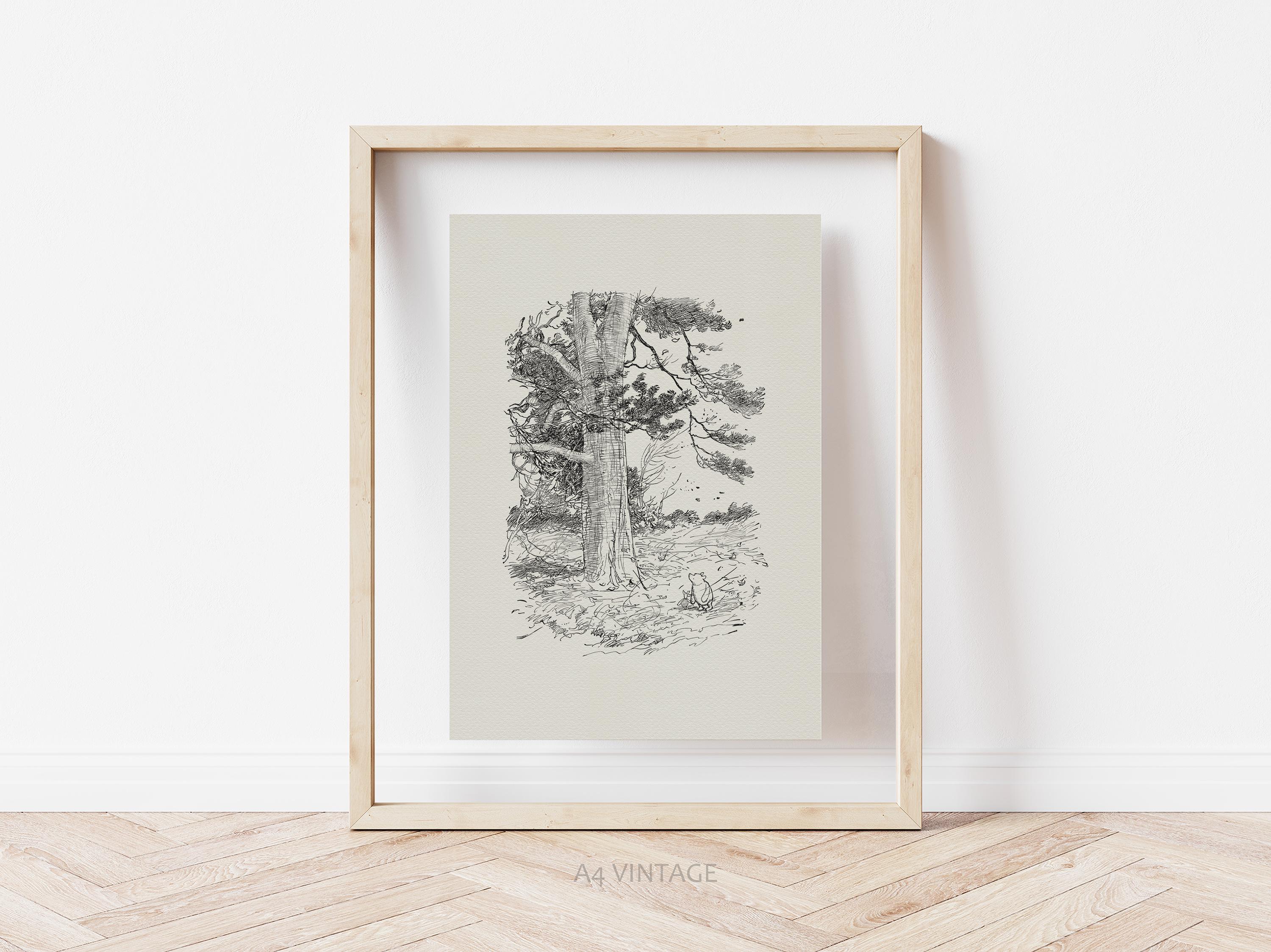 Step back in time to the beloved world of Winnie the Pooh with this meticulously crafted vintage-style black-and-white graphic depicting the timeless scene of Piglet and Pooh setting out on a Very Windy Thursday to “wish everybody a Very Happy Thursday.” This print is a precisely crafted adaptation of E.H. Shepard's book illustration, redrawn by hand to preserve every delicate detail and nuance, ensuring an authentic and nostalgic feel that will bring back fond memories for children and adults alike.