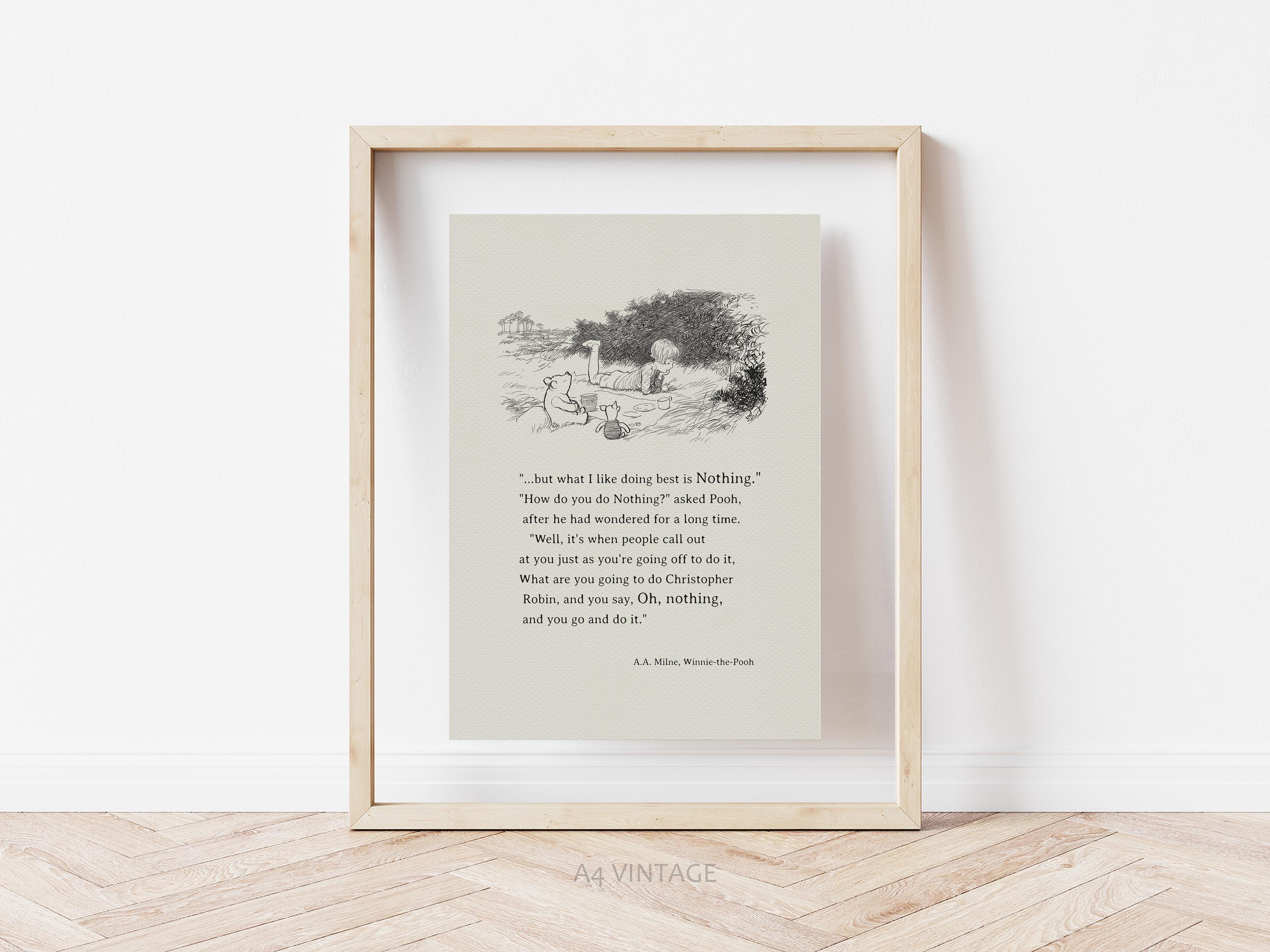Step back in time to the beloved world of Winnie the Pooh with this meticulously crafted vintage-style black-and-white graphic depicting the timeless scene in which— "one day, when Christopher Robin and Winnie-the-Pooh and Piglet were all talking together, Christopher Robin finished the mouthful he was eating and said carelessly: 'I saw a Heffalump to-day, Piglet." Quote added to this illustration: “.....but what I like doing best is Nothing...” – although it does not come from the same book, it fits this idyllic picnic scene exceptionally well.