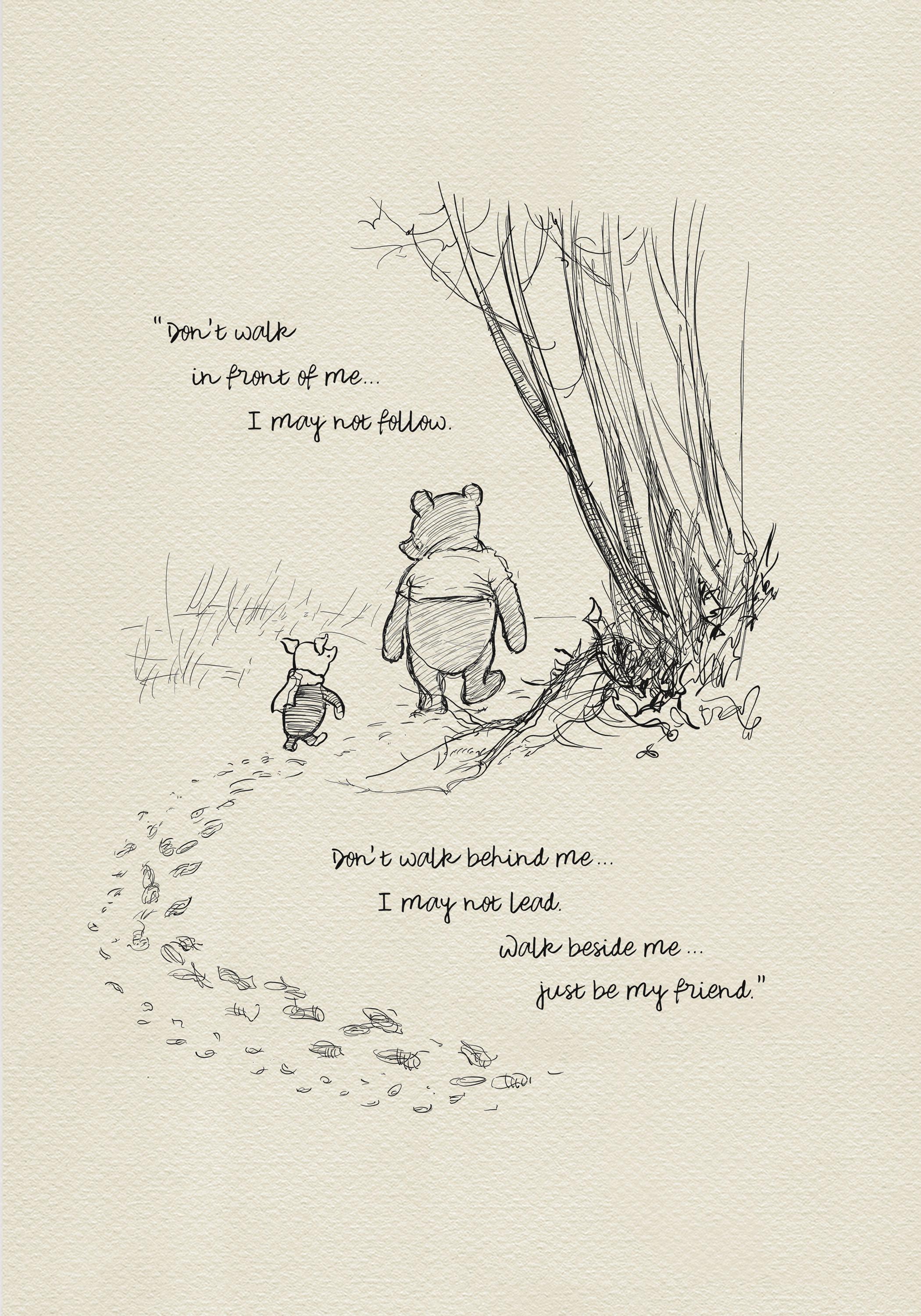 Step back in time to the beloved world of Winnie the Pooh with this meticulously crafted vintage-style black-and-white graphic featuring two inseparable friends walking arm in arm through the wintery Hundred Acre Wood—a timeless scene “in which Pooh and Piglet go hunting and nearly catch a Woozle.” An added heartfelt quote from Albert Camus — "Don’t walk in front of me… I may not follow. Don’t walk behind me… I may not lead. Walk beside me… just be my friend" — reinforces the sentimental charm of this work, making it the perfect gift or keepsake for both Winnie the Pooh fans and sentimental souls alike.