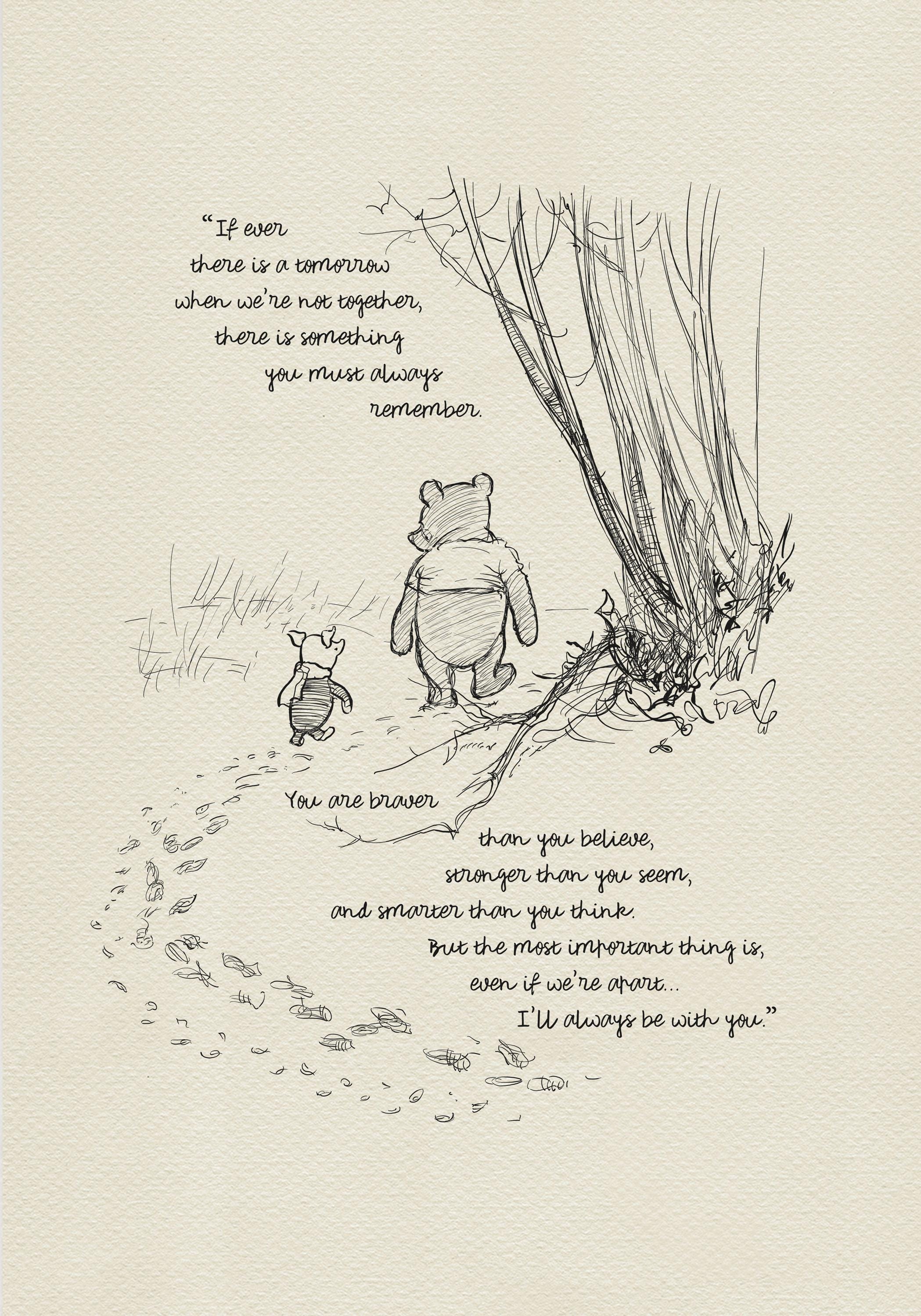 Step back in time to the beloved world of Winnie the Pooh with this meticulously crafted vintage-style black-and-white graphic featuring two inseparable friends walking arm in arm through the wintery Hundred Acre Wood—a timeless scene “in which Pooh and Piglet go hunting and nearly catch a Woozle.” The illustration is accompanied by an inspiring quote by Carter Crocker: "If there ever comes a tomorrow when we're not together... there's something you must always remember," reminding us of our inner strength and resilience.