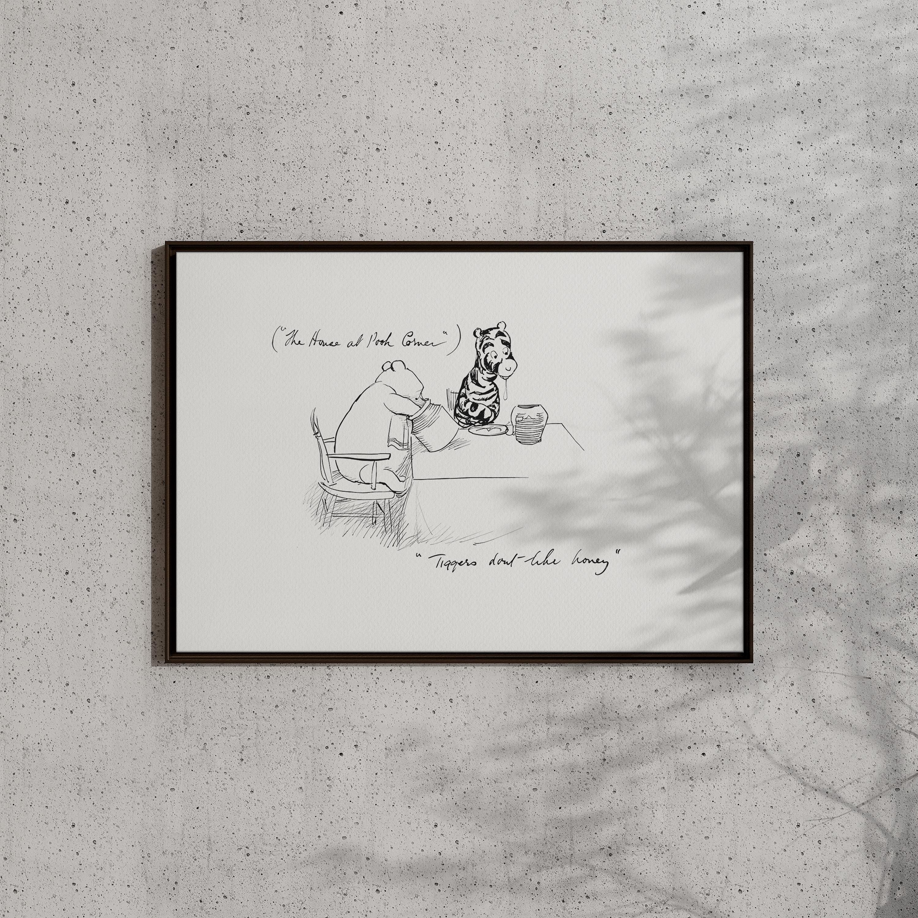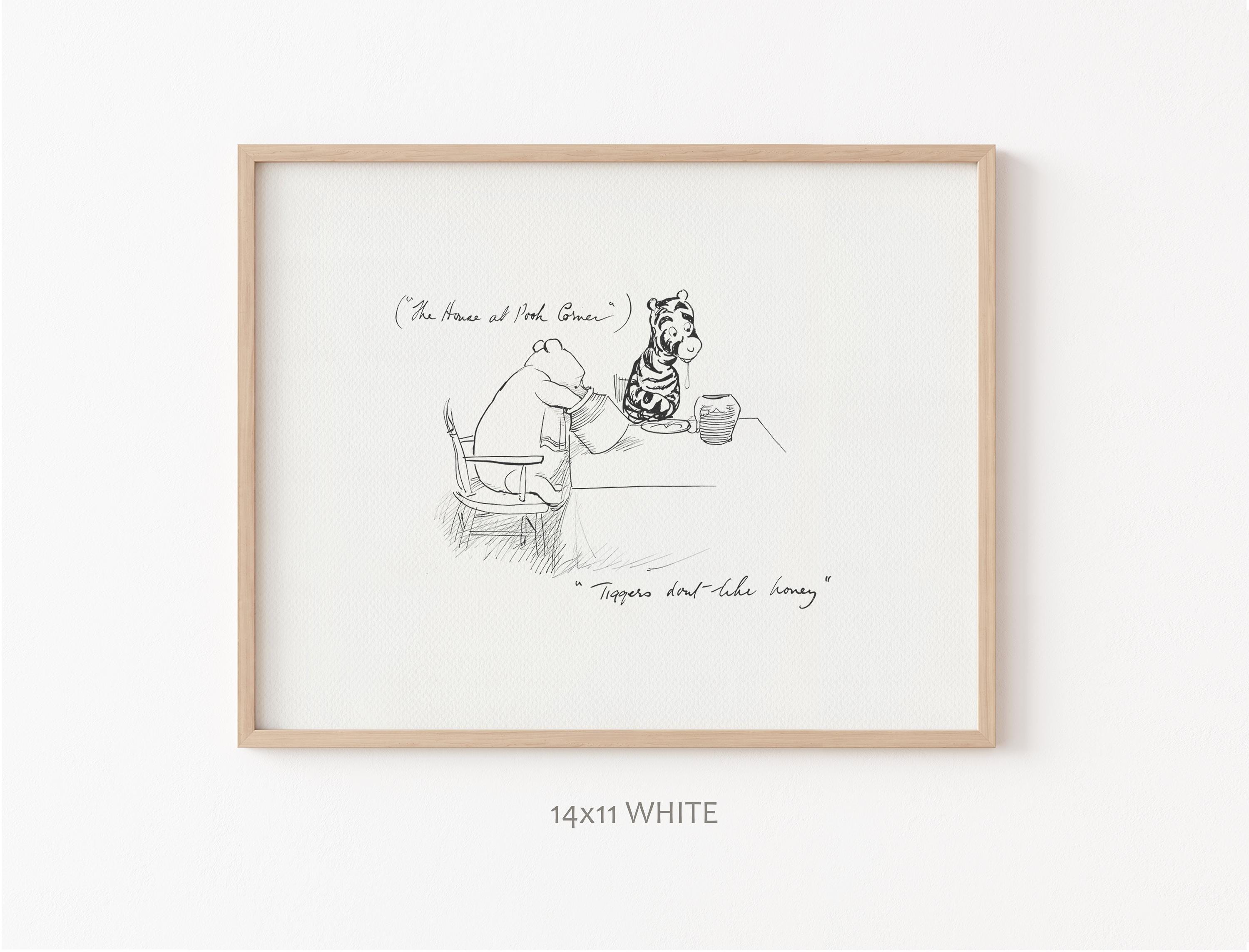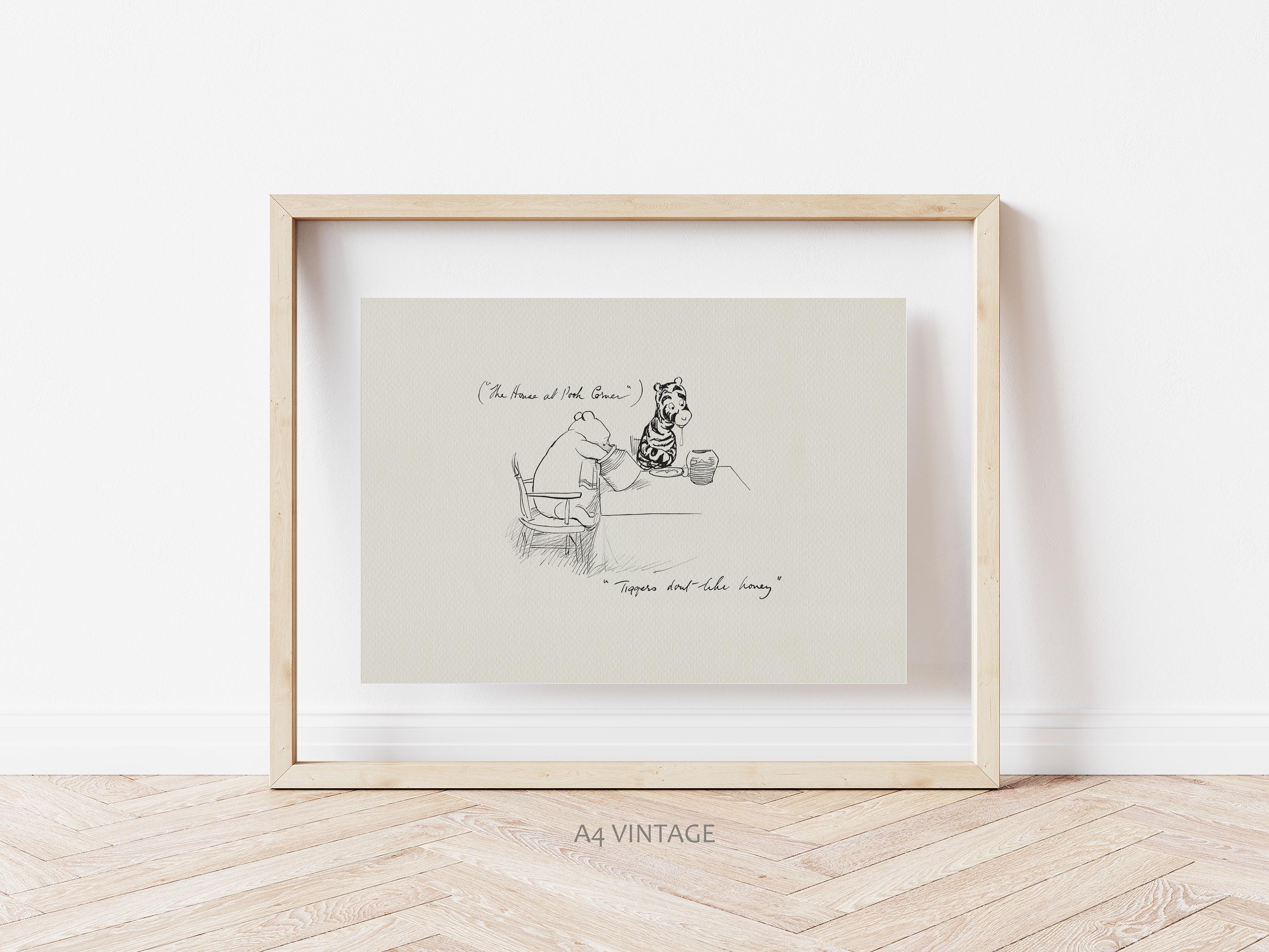 Step back in time to the beloved world of Winnie the Pooh with this meticulously crafted vintage-style black-and-white graphic depicting the moment "in which Tigger comes to the forest and has Breakfast" only to discover that "Tiggers don't like honey"—a timeless scene from A.A. Milne's classic stories. This print is a precisely crafted adaptation of E.H. Shepard's original sketch, redrawn by hand to preserve every delicate detail and nuance, ensuring an authentic and nostalgic feel that will bring back fond memories for children and adults alike.