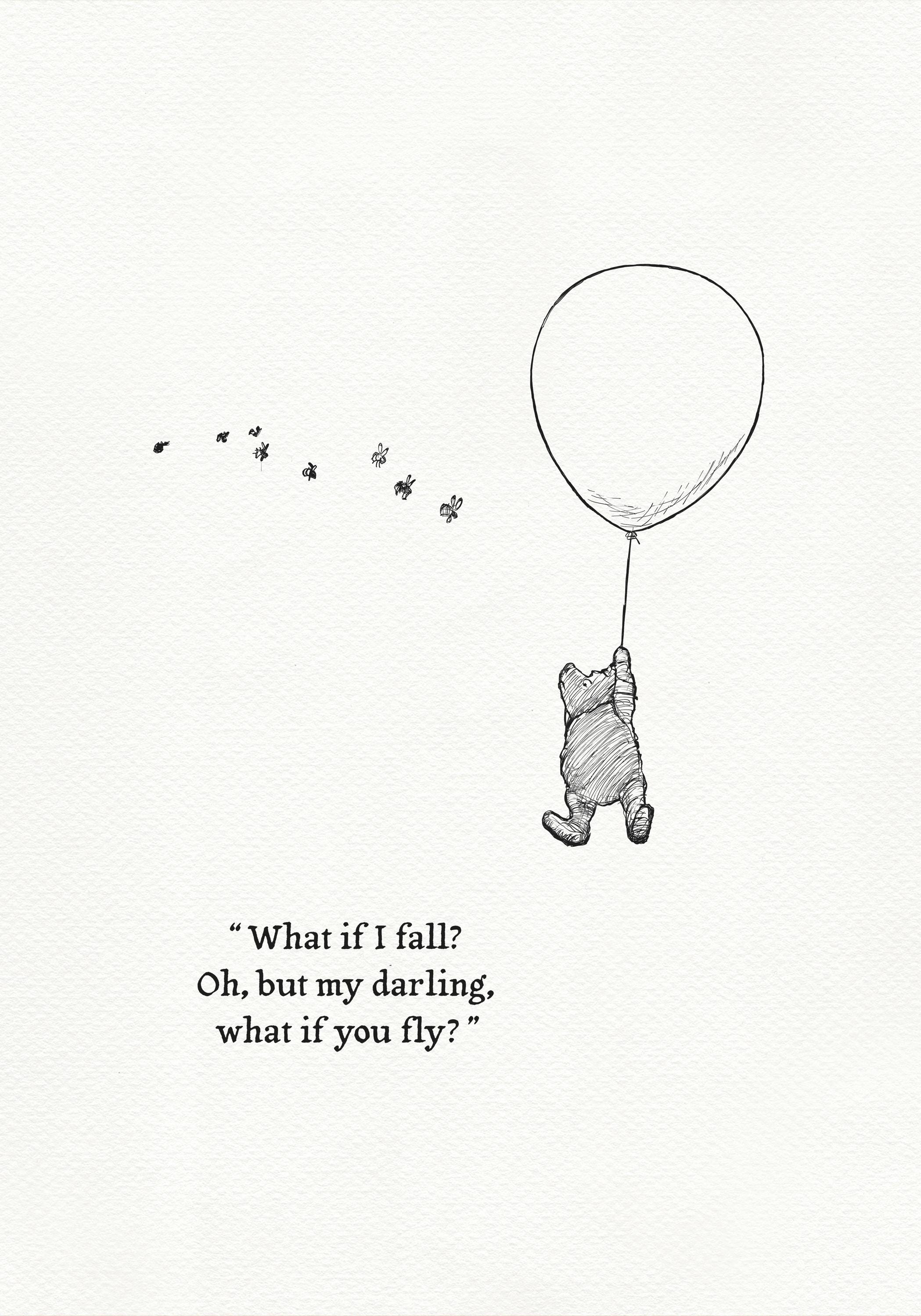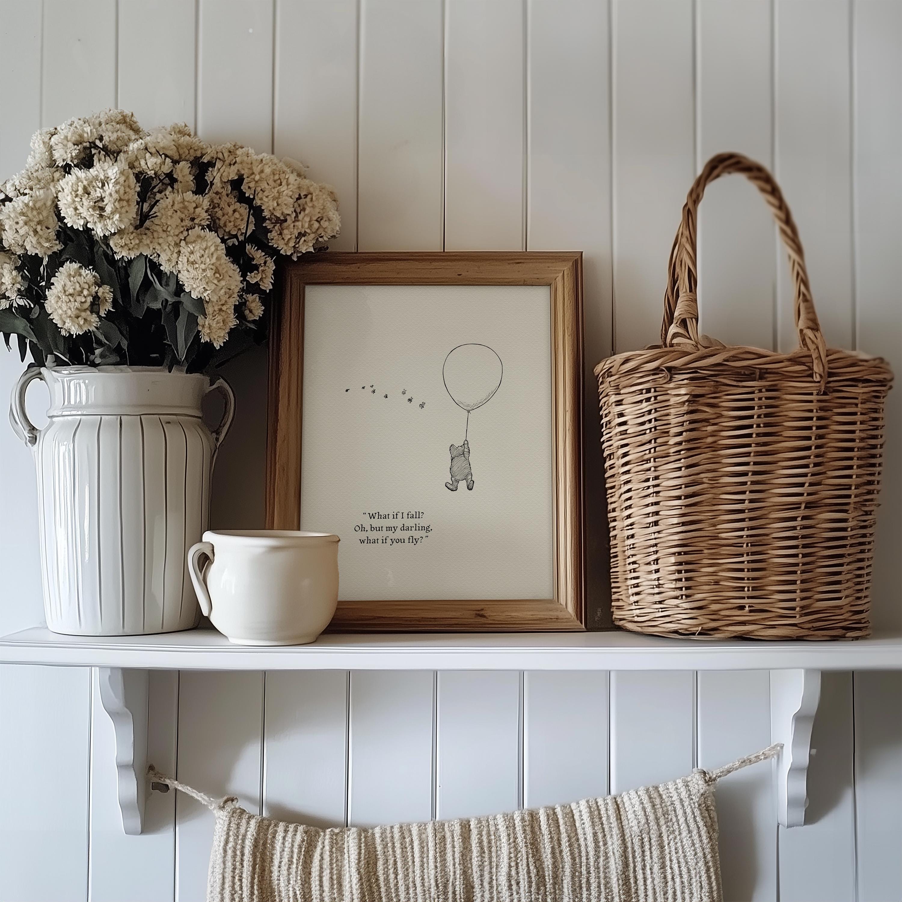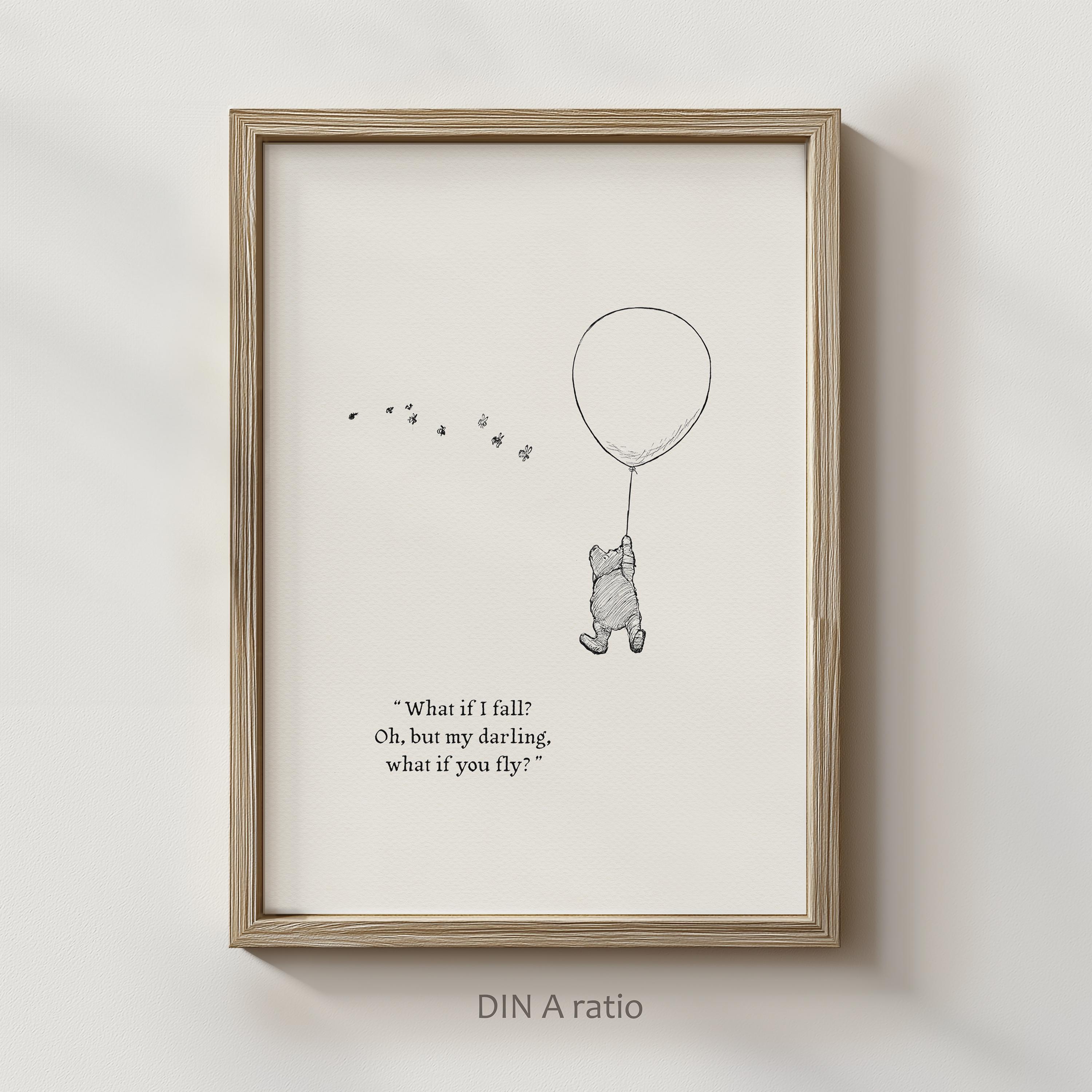 Step back in time to the beloved world of Winnie the Pooh with this meticulously crafted vintage-style black-and-white graphic, depicting the timeless scene of Pooh striving "to be a Cloud Floating in the Blue!" The illustration is complemented by an inspiring quote from Erin Hanson: "What if I fall? Oh, but my darling, what if you fly?", reminding us of our inner strength and courage.
