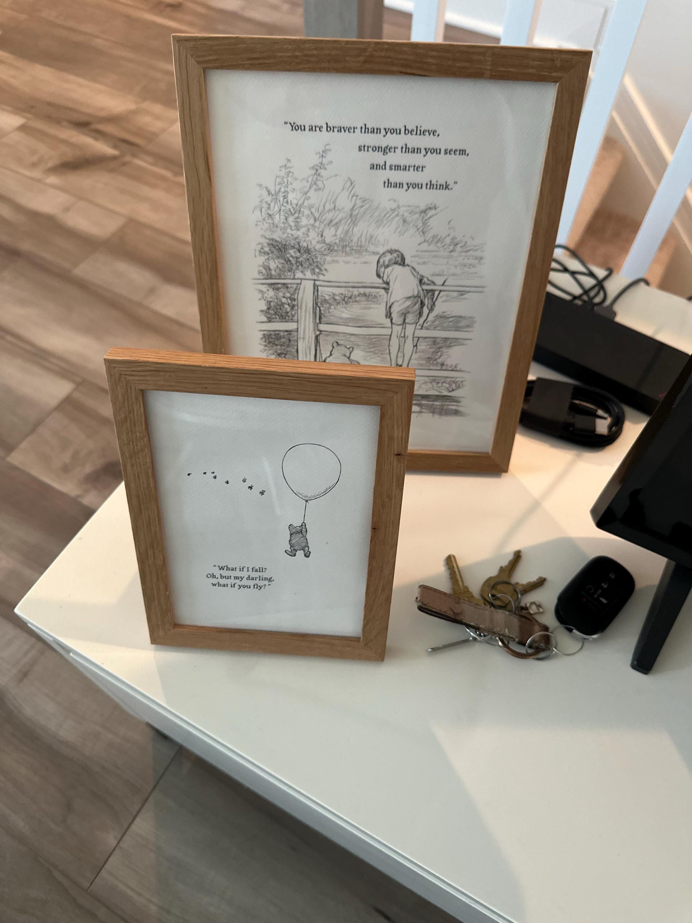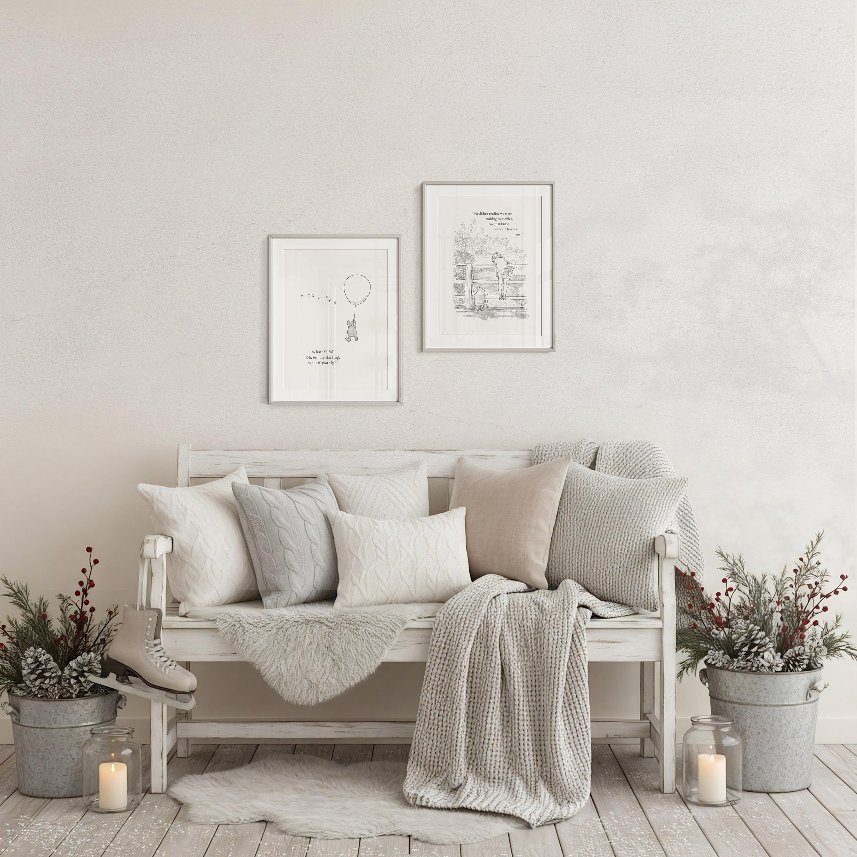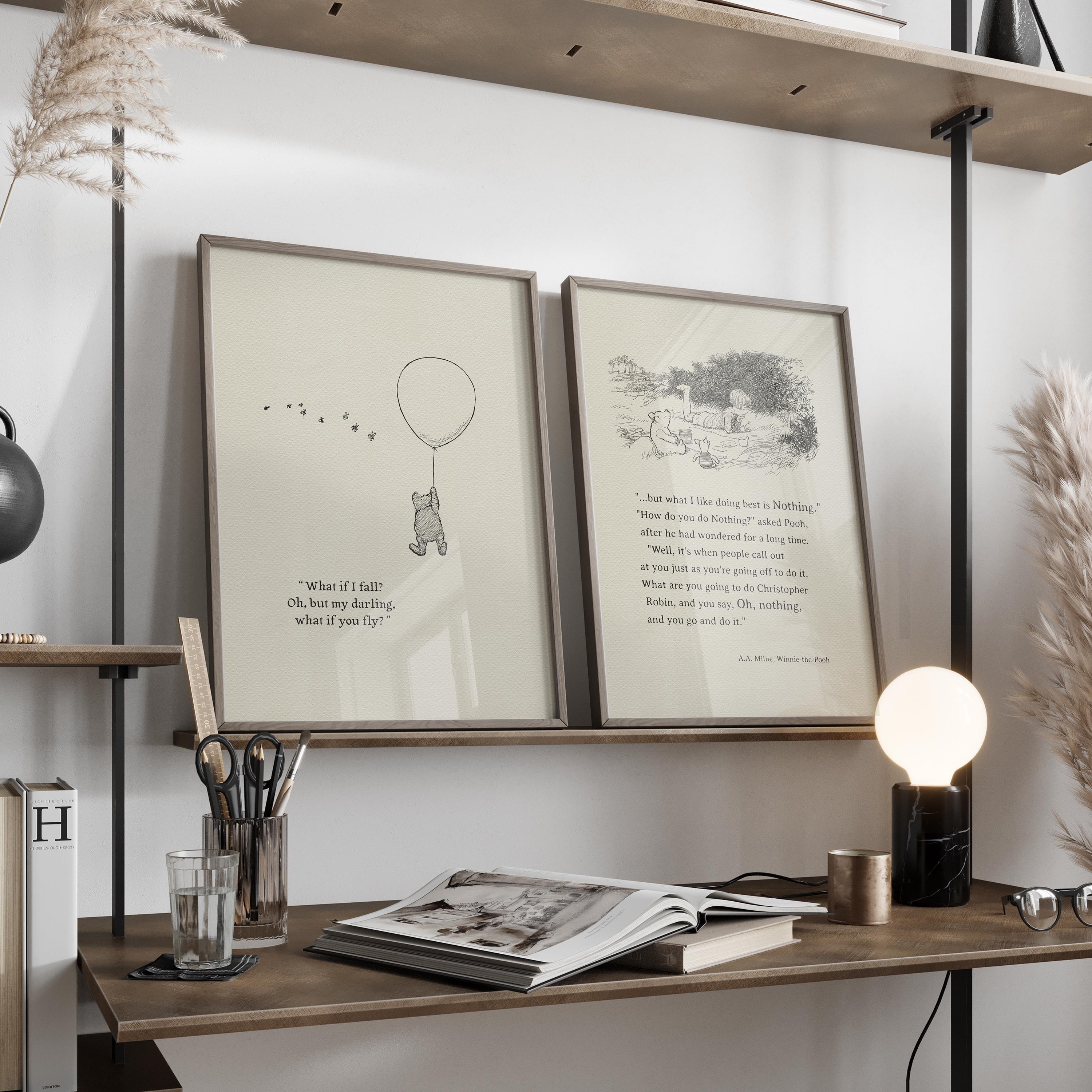 Step back in time to the beloved world of Winnie the Pooh with this meticulously crafted vintage-style black-and-white graphic, depicting the timeless scene of Pooh striving "to be a Cloud Floating in the Blue!" The illustration is complemented by an inspiring quote from Erin Hanson: "What if I fall? Oh, but my darling, what if you fly?", reminding us of our inner strength and courage.