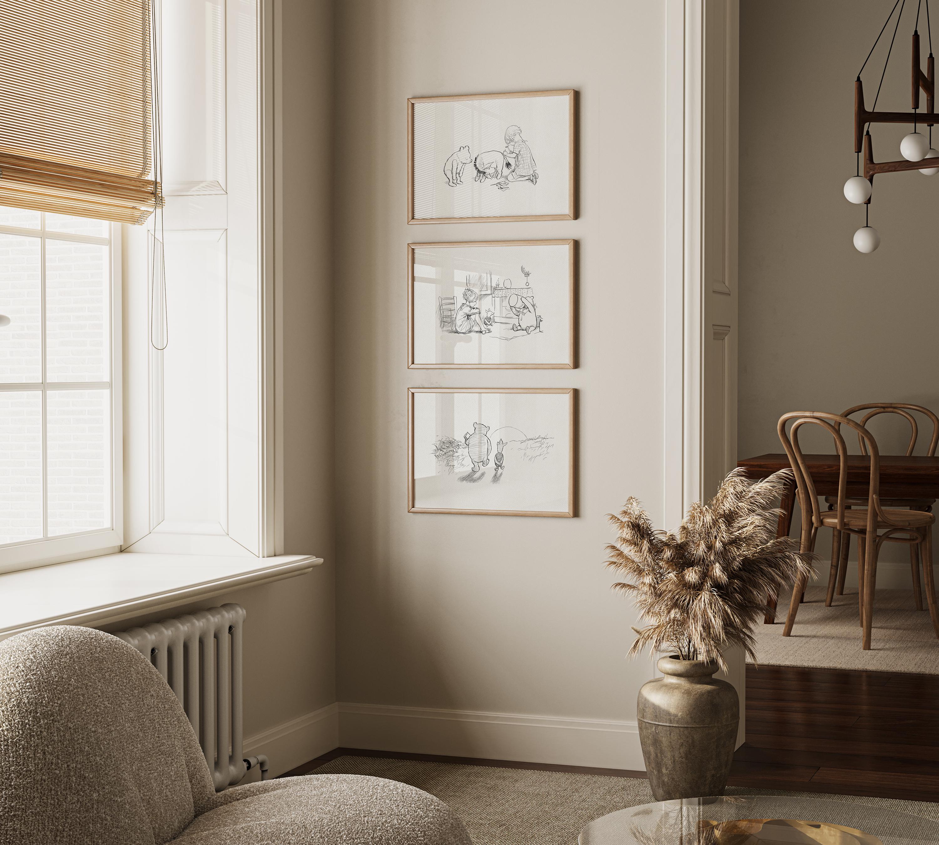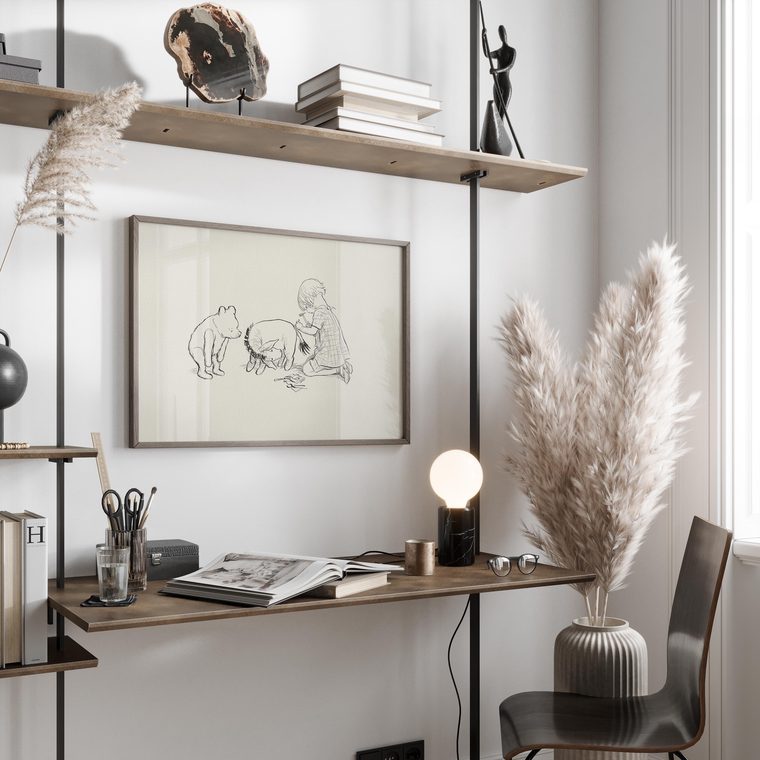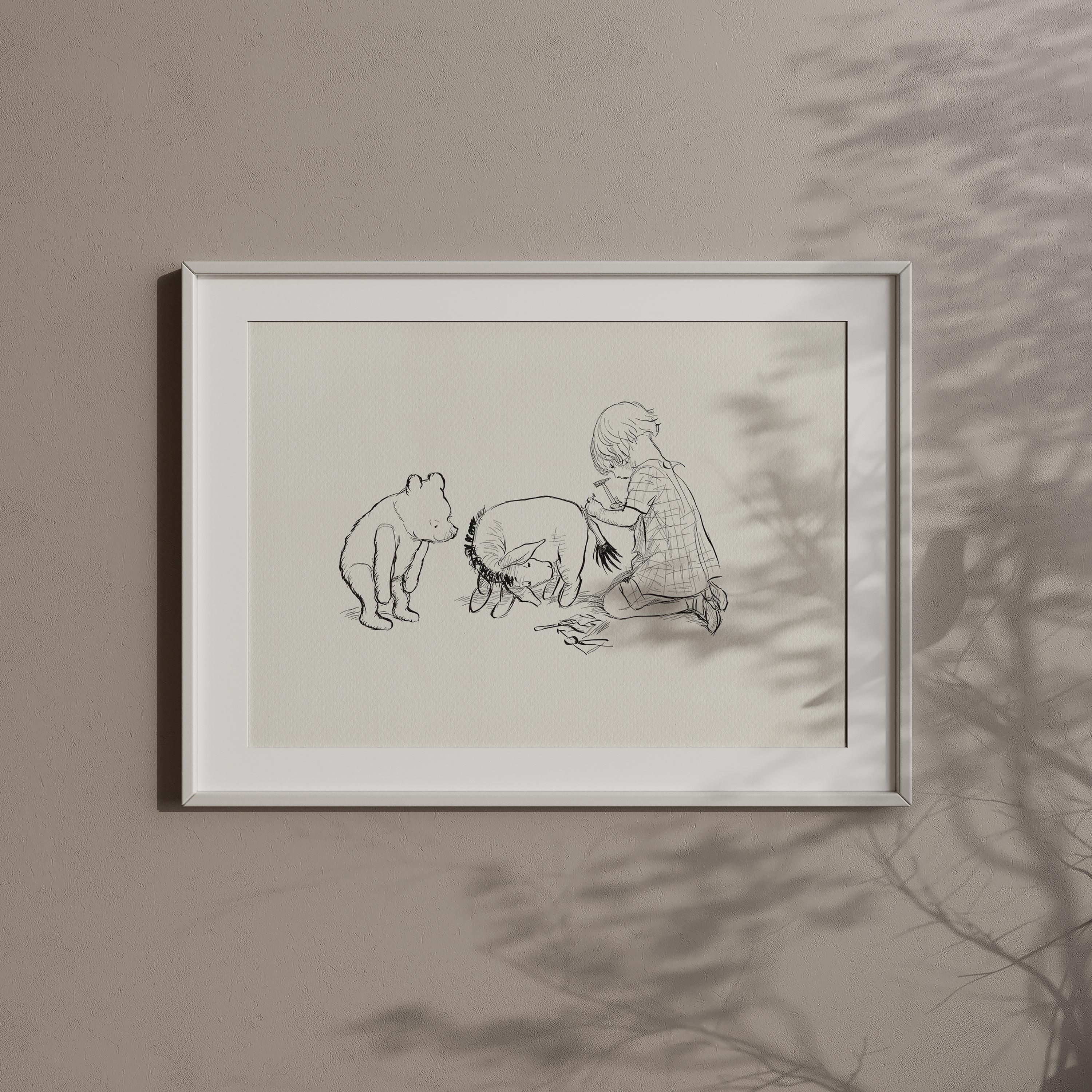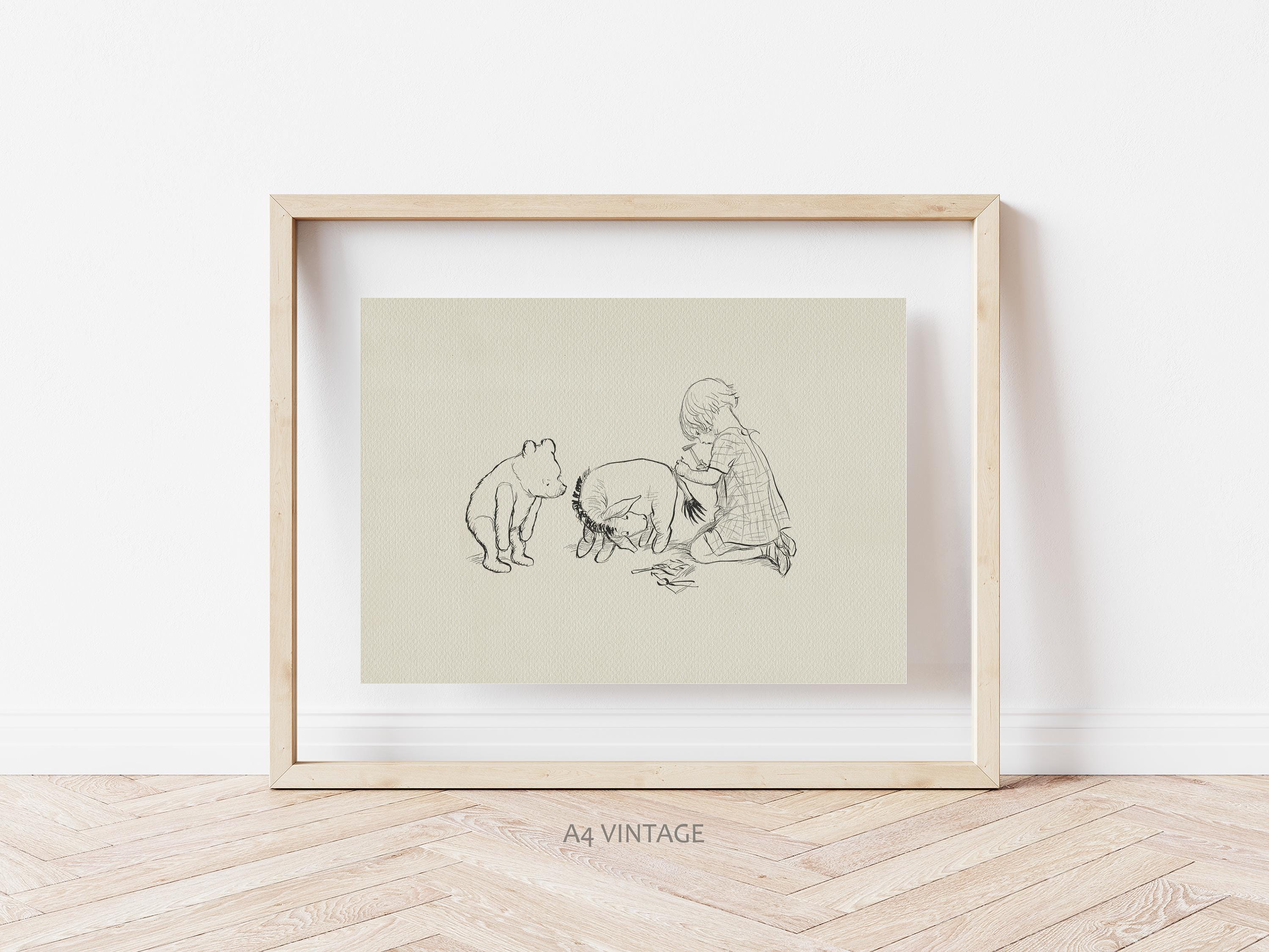 Step back in time to the beloved world of Winnie the Pooh with this meticulously crafted vintage-style black-and-white graphic depicting the scene "in which Eeyore loses a tail and Pooh finds one" —a timeless illustration from A.A. Milne's classic stories. This print is a meticulously crafted adaptation based on E.H. Shepard's original sketch, redrawn by hand to preserve every detail and nuance, ensuring an authentic and nostalgic feel that will bring back fond memories for children and adults alike.