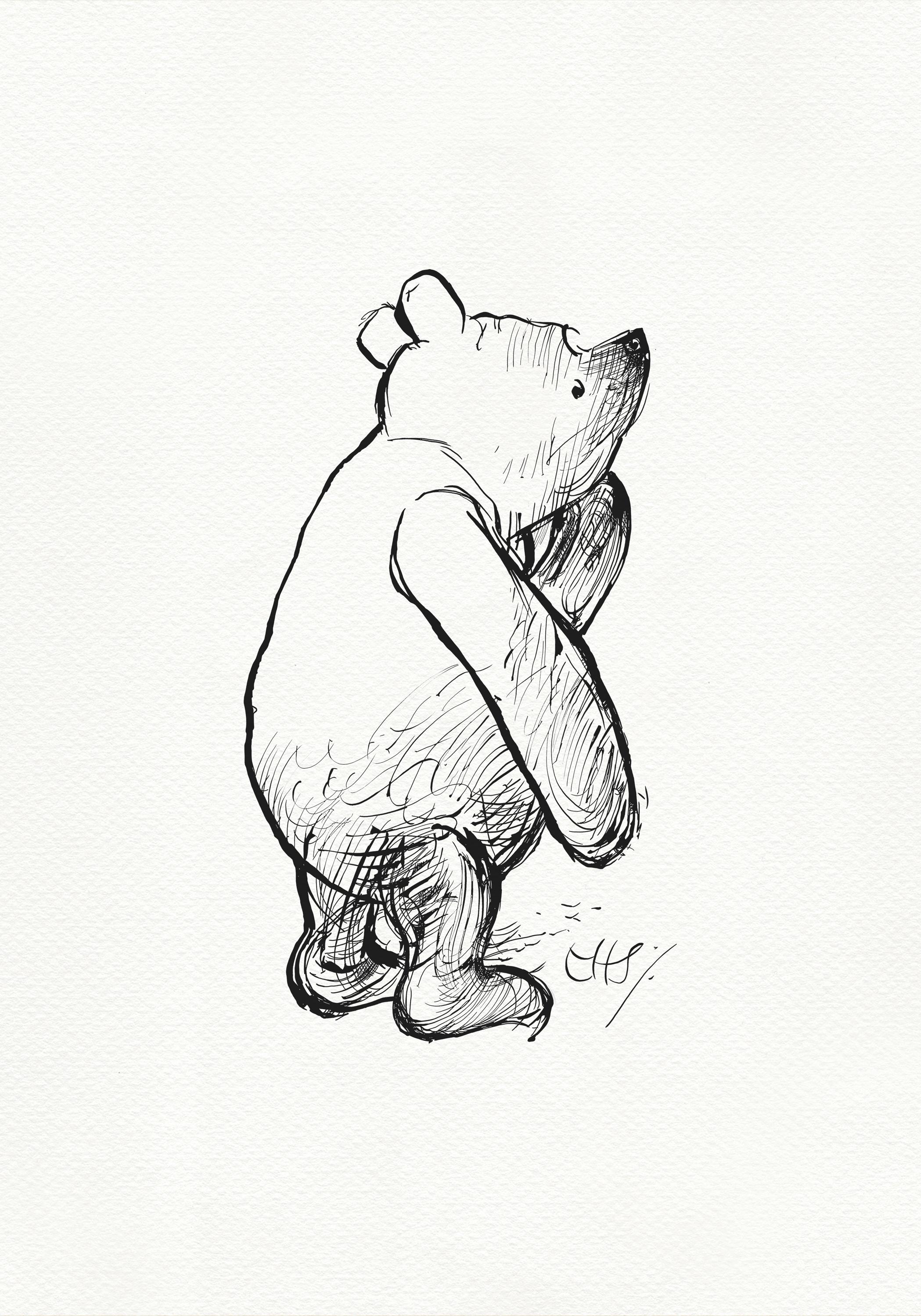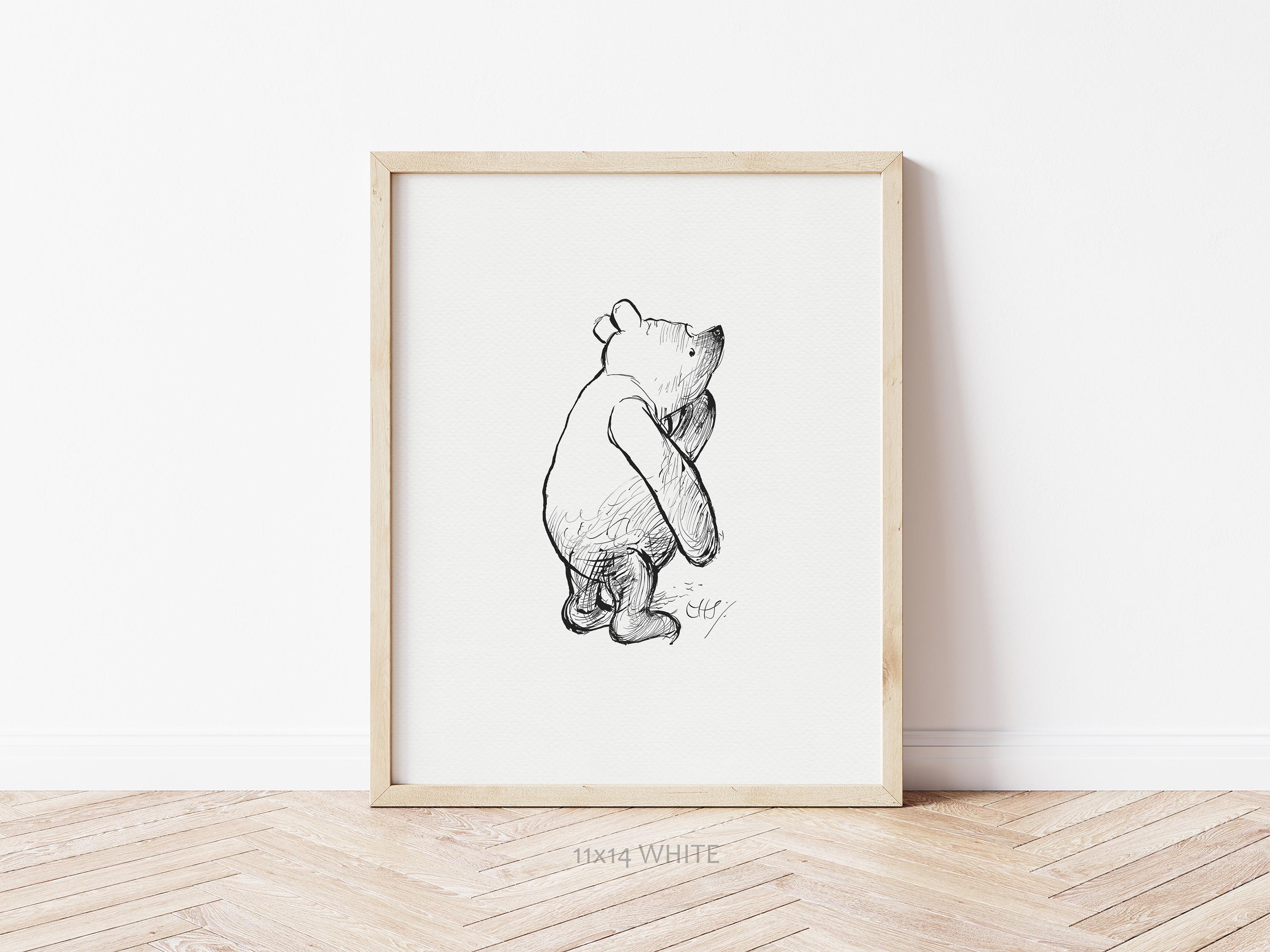 Step back in time to the beloved world of Winnie the Pooh with this meticulously crafted vintage-style black-and-white graphic. This illustration is a meticulously crafted adaptation of E.H. Shepard's original sketch, redrawn by hand to preserve every delicate detail and nuance, ensuring an authentic and nostalgic feel that will bring back fond memories for children and adults alike.