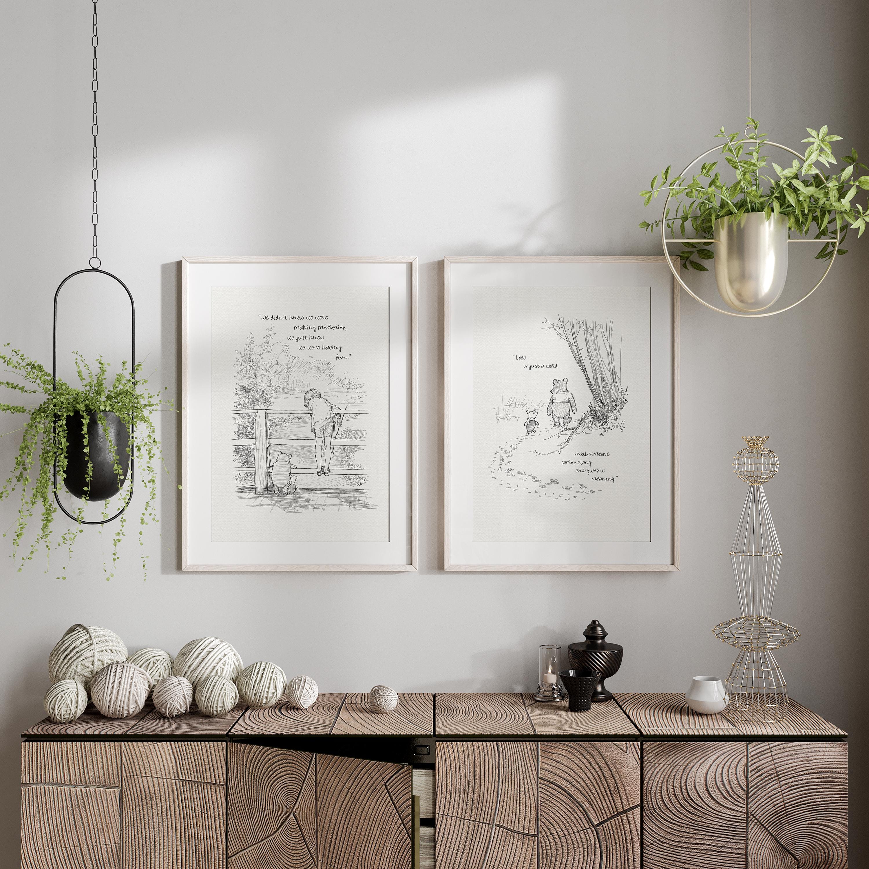 Step back in time to the beloved world of Winnie the Pooh with this meticulously crafted vintage-style black-and-white graphic featuring Winnie the Pooh, Christopher Robin, and Piglet on a bridge playing Poohsticks—a timeless scene from A.A. Milne's classic stories. The quote, "We didn't know we were making memories, we just knew we were having fun." adds a nostalgic and heartfelt message to any space—perfect for a child's room, playroom, or cozy living room.
