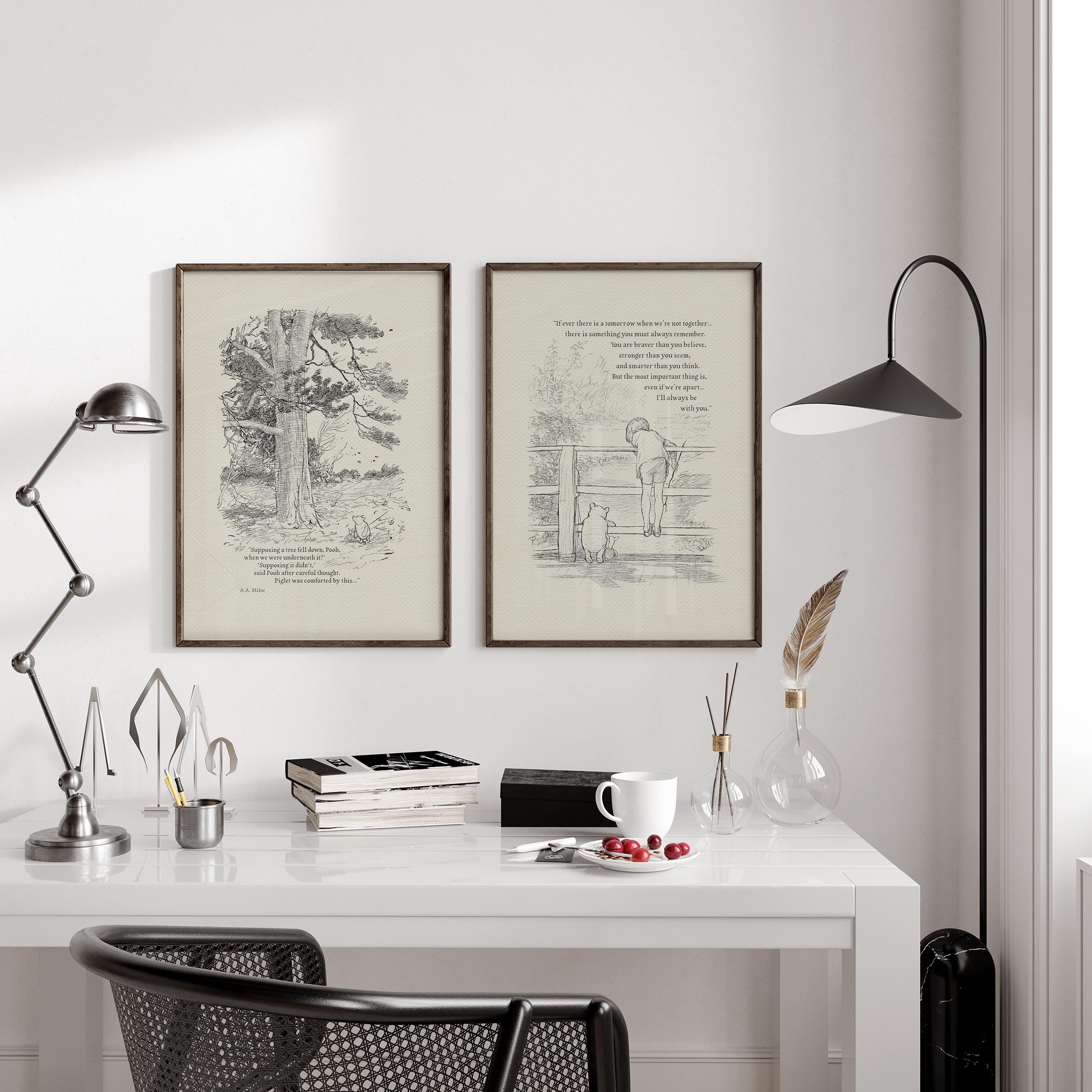 Step back in time to the beloved world of Winnie the Pooh with this meticulously crafted vintage-style black-and-white graphic depicting the timeless scene of Piglet and Pooh setting out on a Very Windy Thursday to “wish everybody a Very Happy Thursday.” When they reached the shelter of the Hundred Acre Wood, Piglet, listening to the roar of the wind in the tree-tops, asked Pooh: