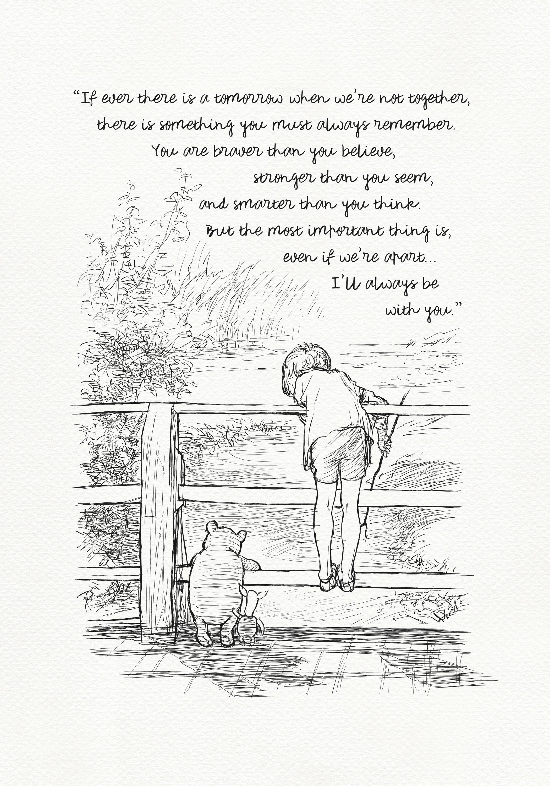 Step back in time to the beloved world of Winnie the Pooh with this meticulously crafted vintage-style black-and-white graphic featuring Winnie the Pooh, Christopher Robin, and Piglet on a bridge playing Poohsticks—a timeless scene from A.A. Milne's classic stories. The illustration is accompanied by an inspiring quote from Carter Crocker: "If there ever comes a tomorrow when we're not together... there's something you must always remember," reminding us of our inner strength and resilience.