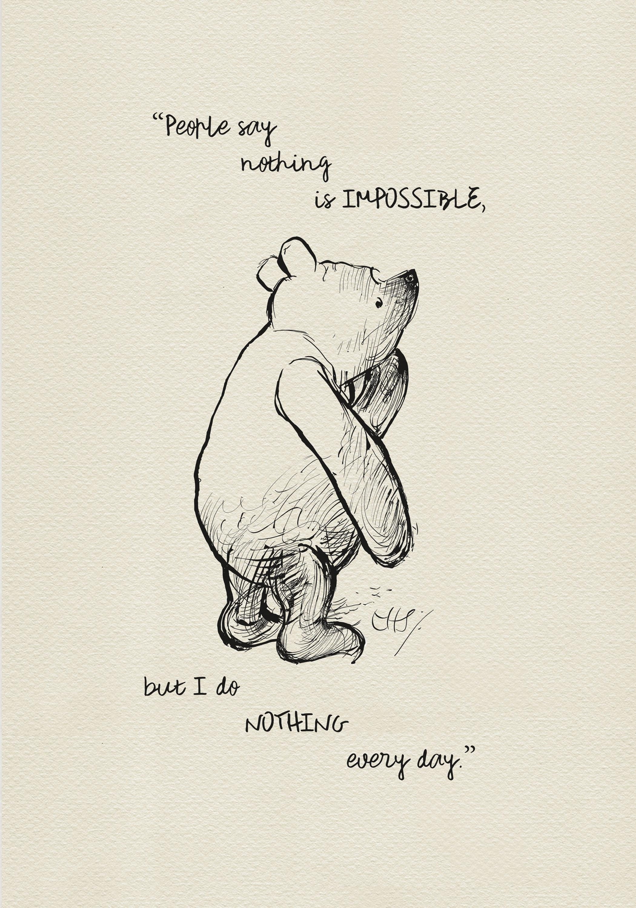 Step back in time to the beloved world of Winnie the Pooh with this meticulously crafted vintage-style black-and-white graphic. The quote, "People say nothing is impossible, but I do NOTHING every day," adds a touch of inspiration, making the poster both fun and motivating. This print is a precisely crafted adaptation of E.H. Shepard's original sketch, redrawn by hand to preserve every delicate detail and nuance, ensuring an authentic and nostalgic feel that will bring back fond memories for children and adults alike.